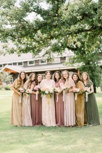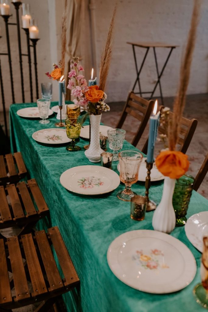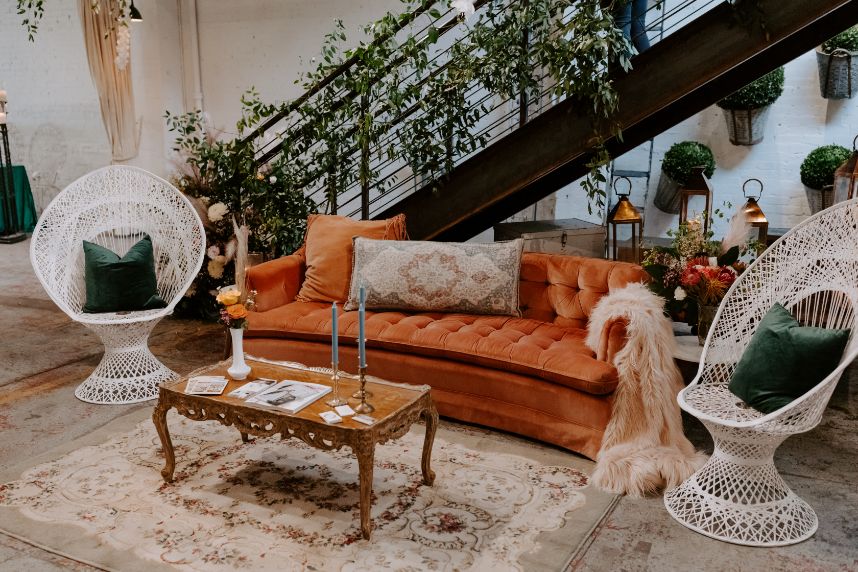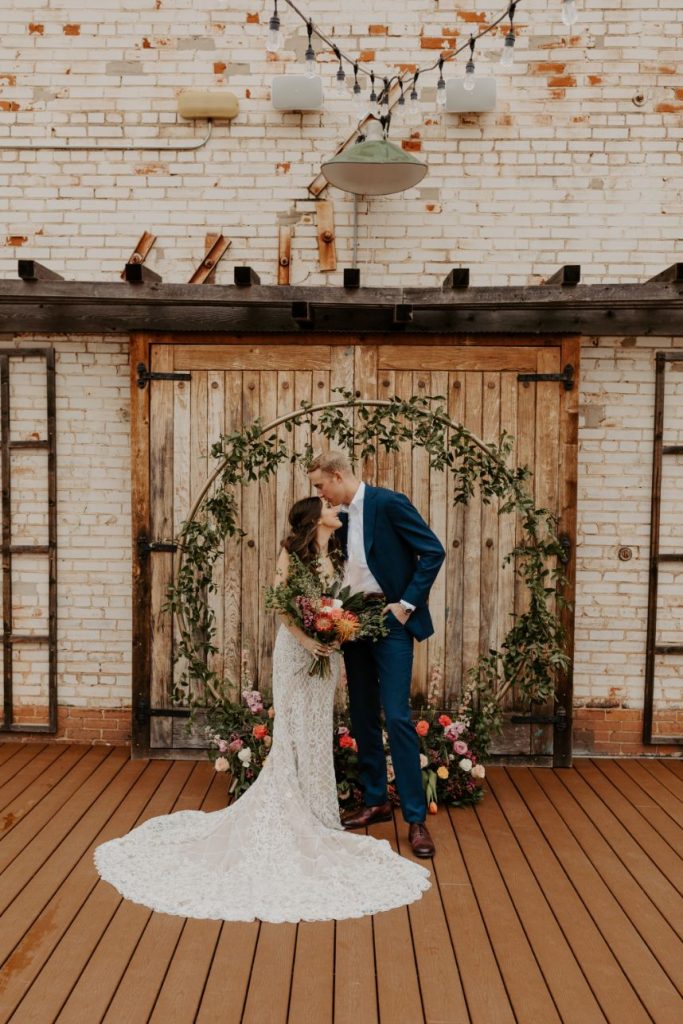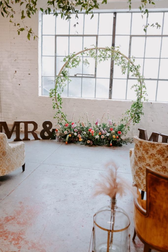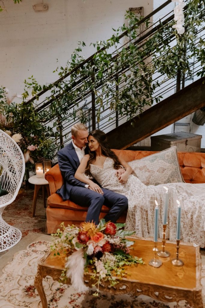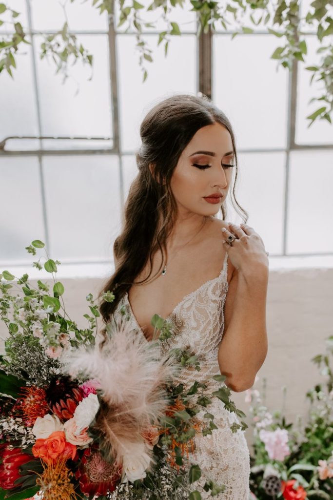 Organic textures and the raw, industrial setting that is The Venue at PLENTY Mercantile combine with a few fun florals in bright shades that remind us warmer days and weddings galore are just around the corner. This styled shoot is all about juxtaposition, planned and florally designed by Forever Borrowed to create a weddingscape that says “moody, but make it springtime.” Vintage and modern elements meet in the form of stunning rentals in the dreamiest lounge setup ever, making the perfect place for you to prop your feet up during cocktail hour or pose for a picture since it’s all so impeccably styled! This circular altar installation and centerpieces of romantic, garden-style florals are perfectly paired with plentiful, lush greenery by Forever Borrowed as well, and we are obsessed with their idea of a make-your-own bouquet bar allowing your wedding guests to bring home the prettiest party favors. This bride models a breathtaking yet effortless look that features a sweeping train with a beautifully beaded netting illusion down the entirety of the V-neck sheath gown from The Bridal Boutique. Between her gown, her emerald ring on an art deco sunburst setting from Jay’s Jewelry, and her flattering gown, this bride stands out assuring all eyes are on her – even in the middle of an overgrown oasis with so many organic textures like this one. Take it all in for yourself in the gallery down below. Cheers!