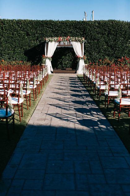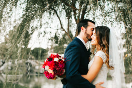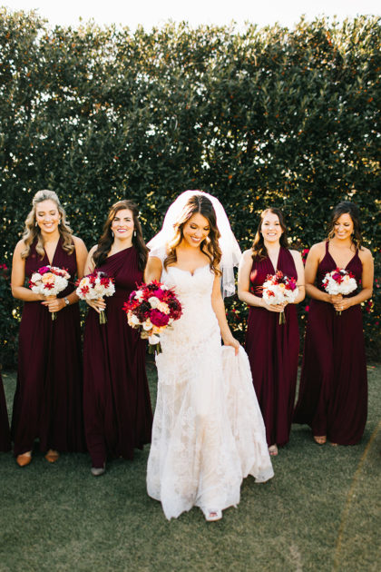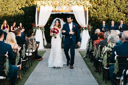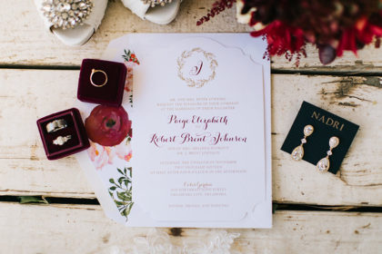 On November 12, 2016, Paige and Robert were married at Coles Garden. The couple’s romantic garden wedding dazzled in shades of maroon, gold, ivory and pink. The bride walked down the aisle in a fit and flare Casablanca gown that featured beaded lace and tulle with a sweetheart neckline and cap sleeves. She complemented the look with earrings by Nadri and a small gold ring that her father gave to her mother as a promise ring in high school.