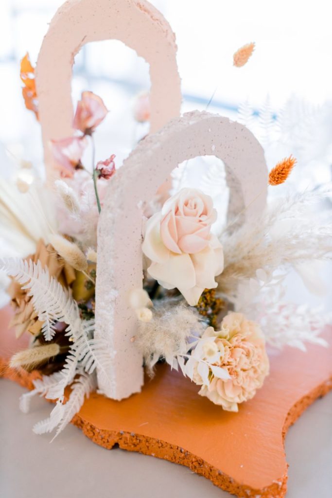 From the bride on her most helpful vendor: “My favorite of all time would be my best friend and boss Malyn! I did not want any greenery in our florals whatsoever and this hadn’t been done before, so it was a challenge for both us to find which types of flowers would really stand out! She had this amazing idea of using our grid walls and acrylic floating shelves to be our dessert wall and they looked like they were floating on this floral wall of gorgeousness!!!”