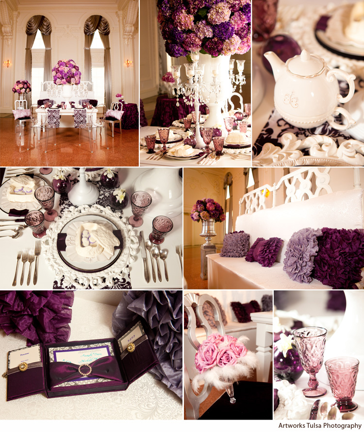 We couldn’t wait to share this chic table design from Mershon Events captured by Artworks Tulsa Photography at The Mayo Hotel! Mershon Events mixed old with new by using modern acrylic ghost chairs and antique white china from Party Perfect Linens and Event Rentals. We love the varying shades of purple in the florals, glassware and pillows! These fabulous florals including the centerpieces and oh-so-cute bouquet, along with the elegant invites were also from Mershon Events! Go behind-the-scenes of this fab table shoot captured by Pen Weddings! Enjoy!