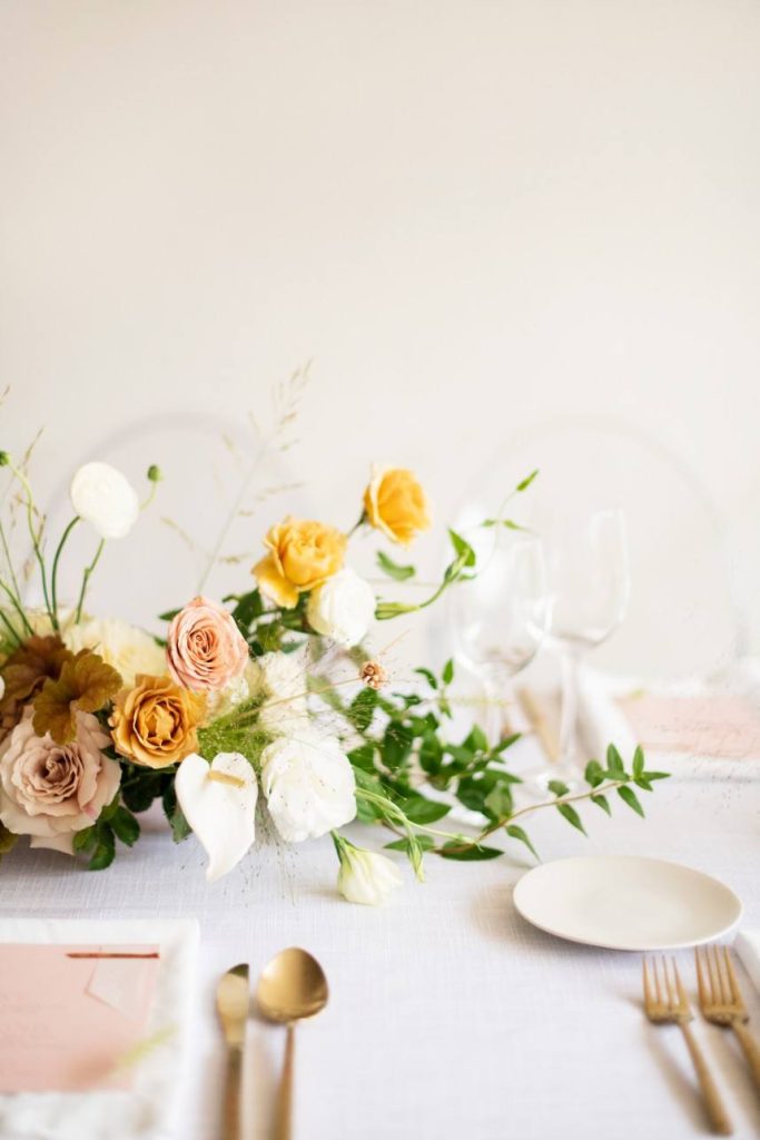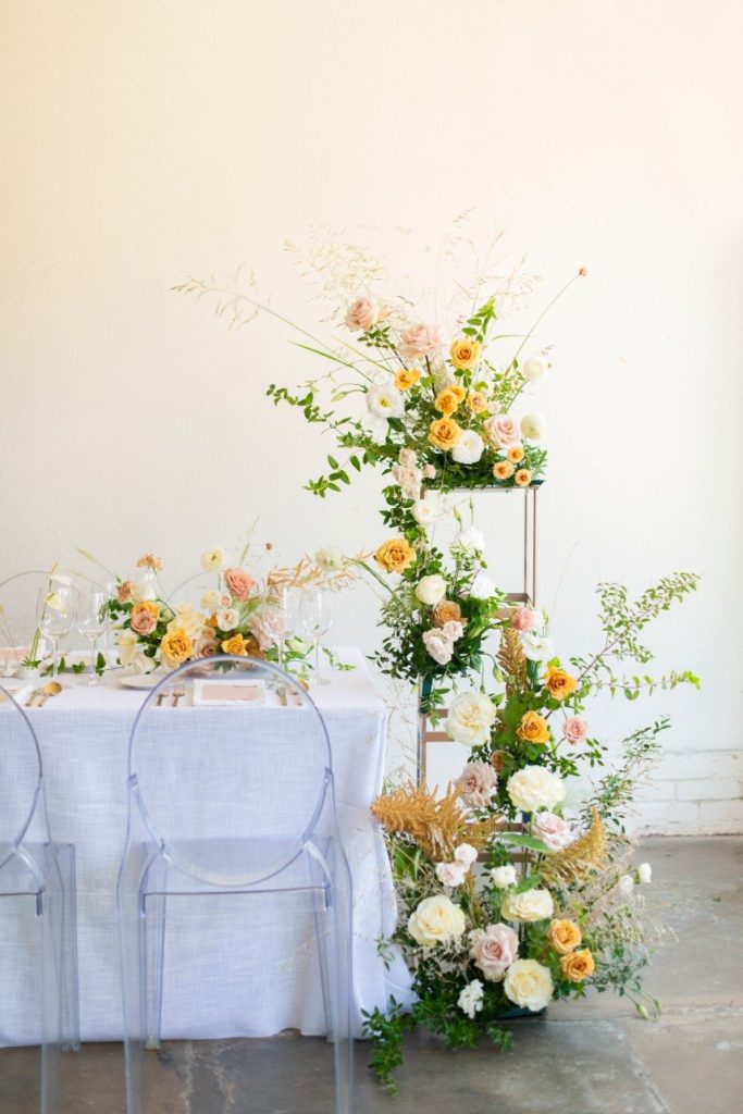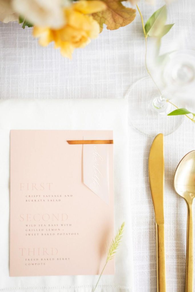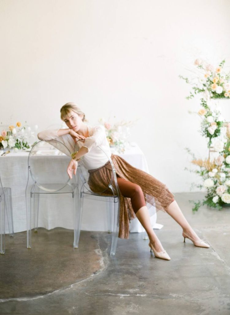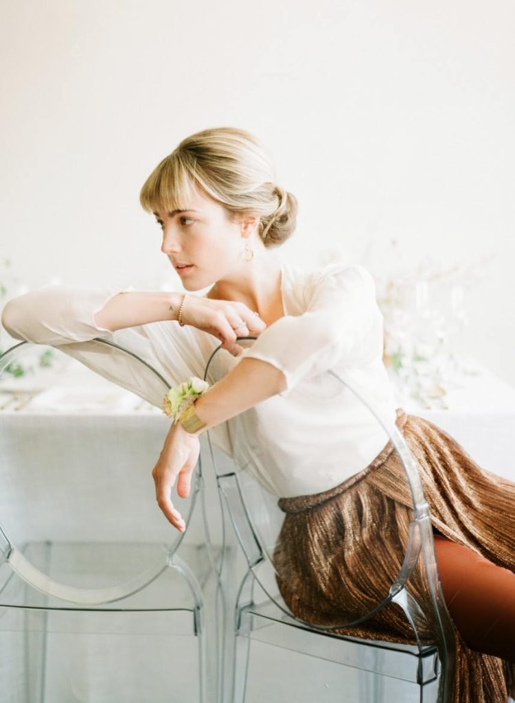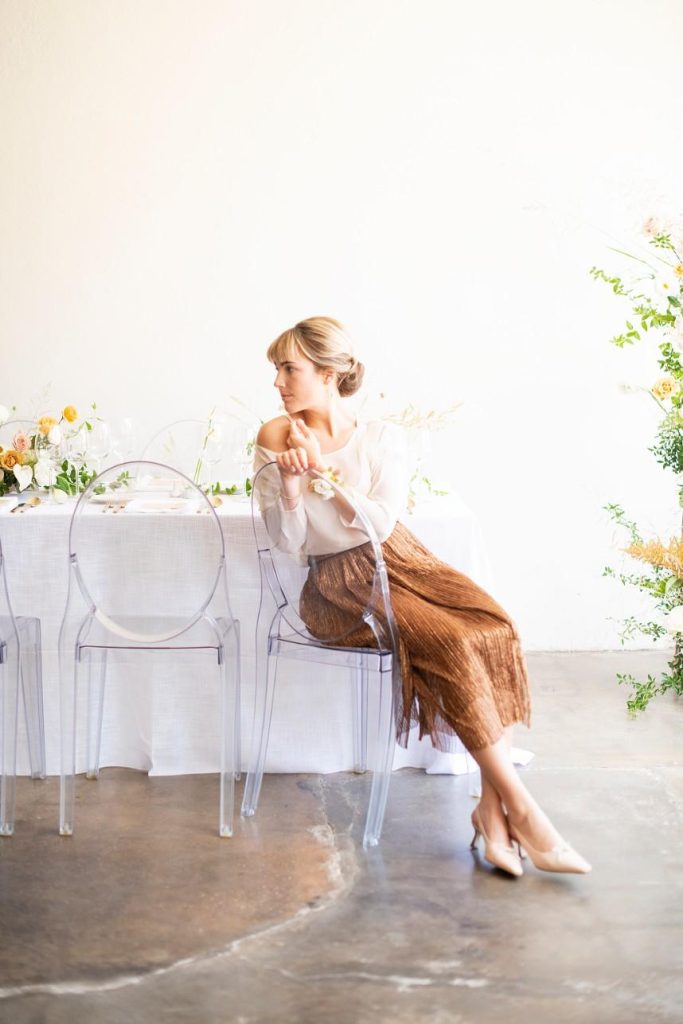 Does it get any dreamier than this earthy-hued, pastel and copper tablescape design styled by Tulsa florist and wedding planning team Ever Something?! We are swooning over every last detail! The whimsical scene was set with an abundance of peach and blush blooms – topping the fresh-faced tablescape, wrapping around a set of ladders for a dreamy vignette and adorning a variety of dainty corsages. A modern collection of paperie from Laurel and Marie was spread throughout the setting, featuring a crisp invitation suite, place setting menu and beautifully calligraphed floral tags. Acrylic ghost chairs and copper flatware from Party Pro Rents added contemporary touches to otherwise ethereal feel. The model fit the scene perfectly thanks to her perfectly sleek chignon and barely there, blushingly pink makeup by Hannah Miller Artistry. What a beauty?! Keep scrolling to see the prettiest wedding tablescape inspo we ever did see!