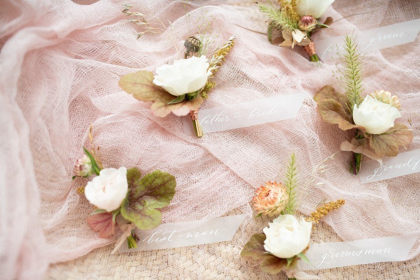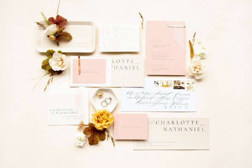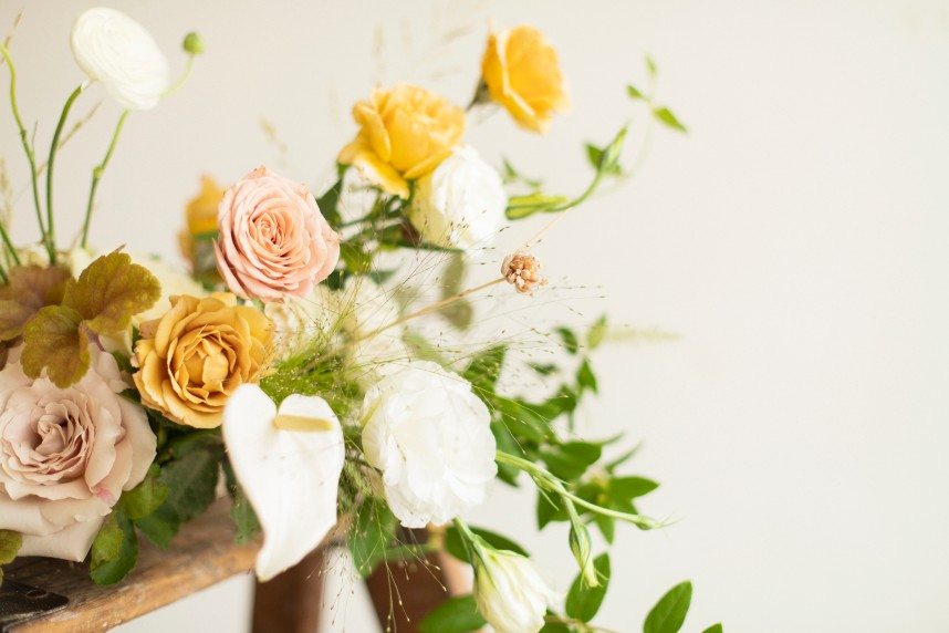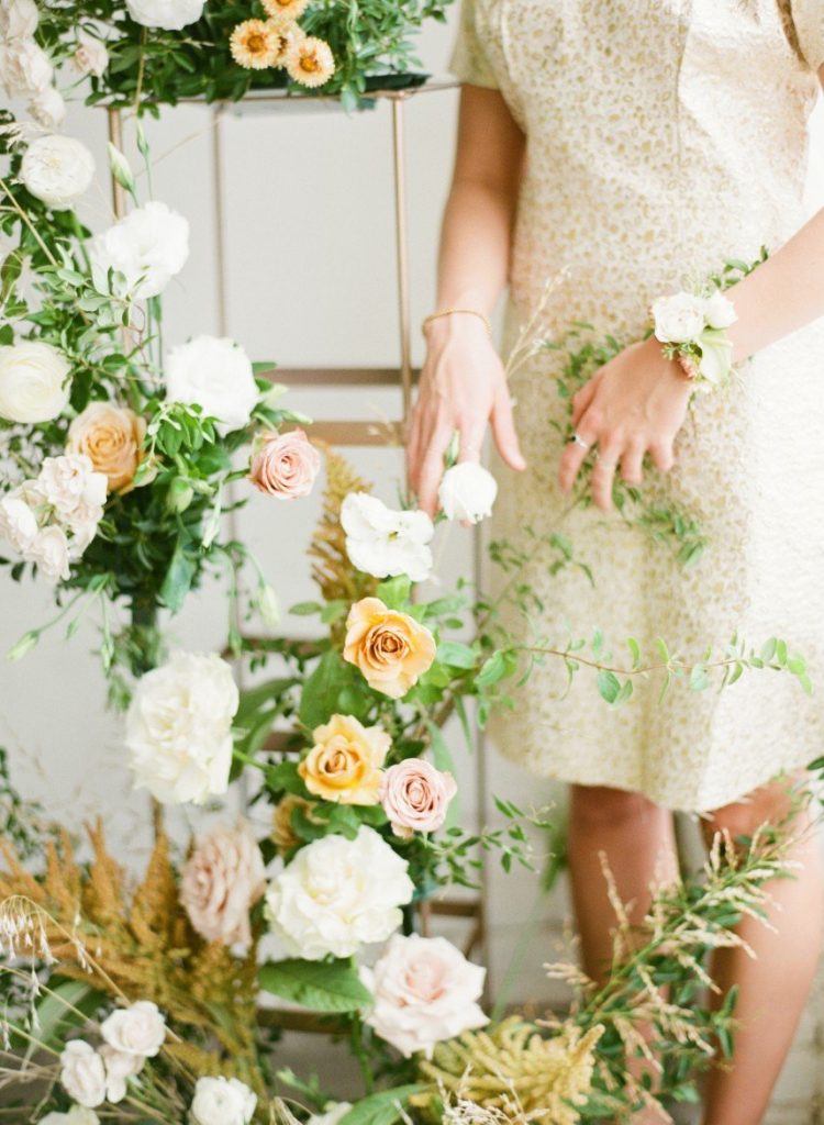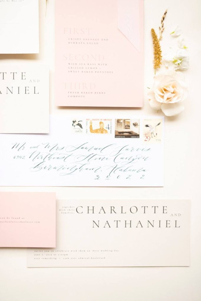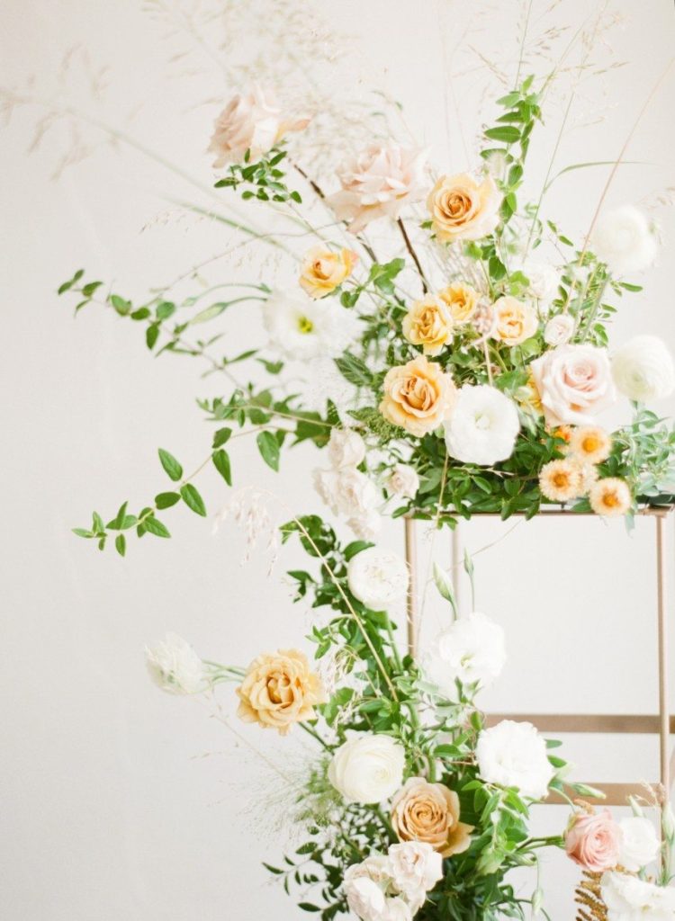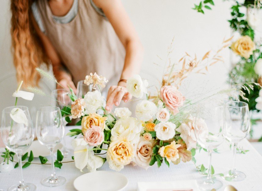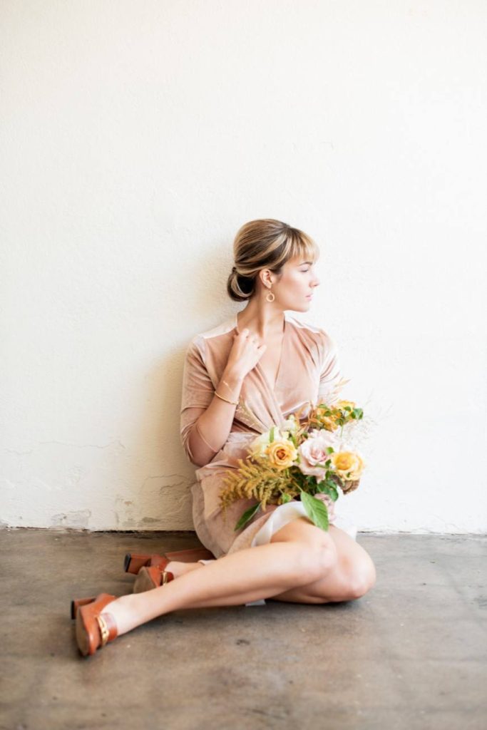 Does it get any dreamier than this earthy-hued, pastel and copper tablescape design styled by Tulsa florist and wedding planning team Ever Something?! We are swooning over every last detail! The whimsical scene was set with an abundance of peach and blush blooms – topping the fresh-faced tablescape, wrapping around a set of ladders for a dreamy vignette and adorning a variety of dainty corsages. A modern collection of paperie from Laurel and Marie was spread throughout the setting, featuring a crisp invitation suite, place setting menu and beautifully calligraphed floral tags. Acrylic ghost chairs and copper flatware from Party Pro Rents added contemporary touches to otherwise ethereal feel. The model fit the scene perfectly thanks to her perfectly sleek chignon and barely there, blushingly pink makeup by Hannah Miller Artistry. What a beauty?! Keep scrolling to see the prettiest wedding tablescape inspo we ever did see!