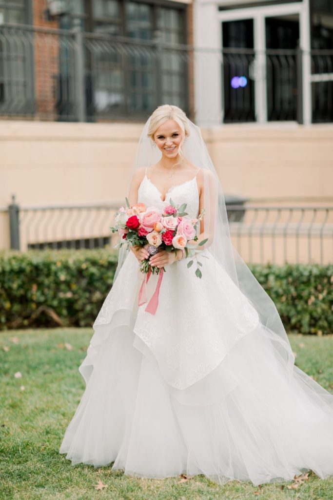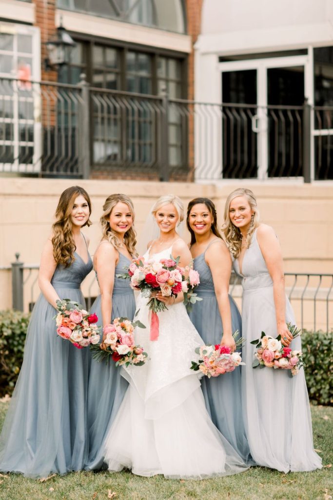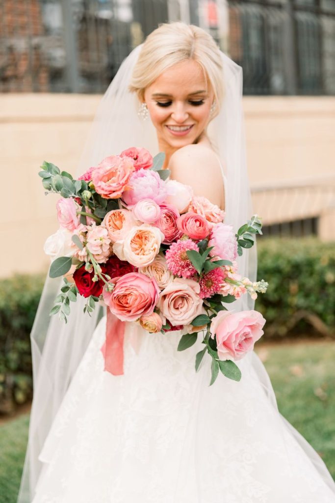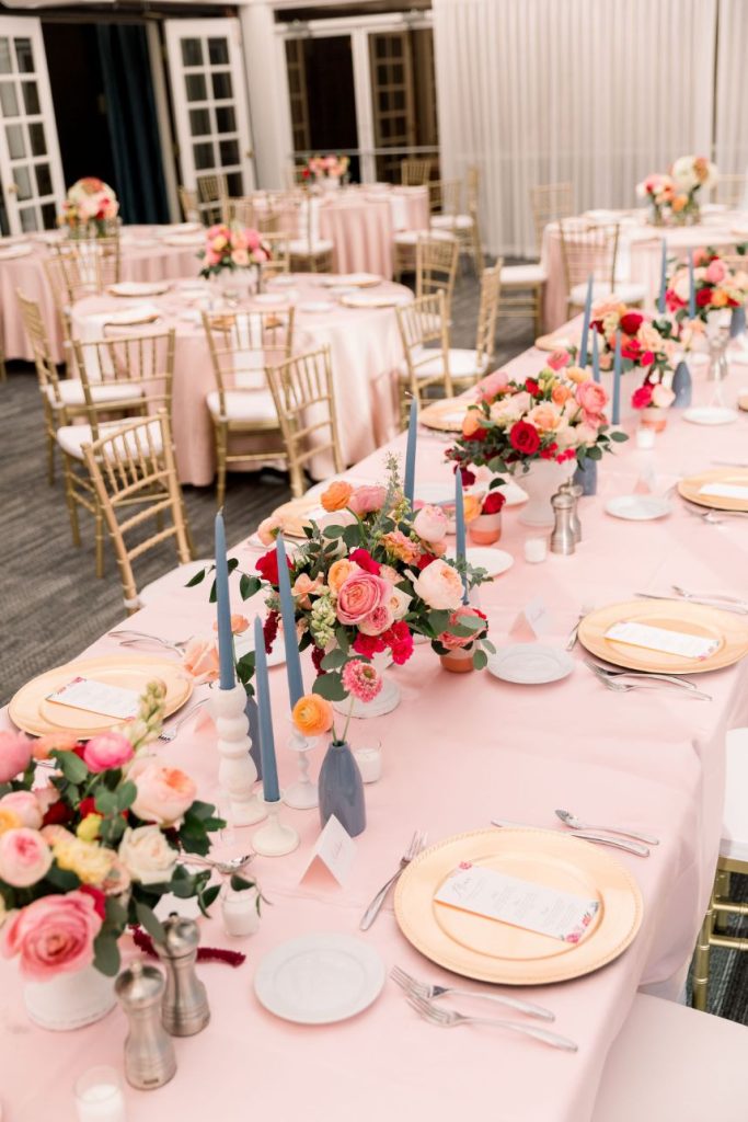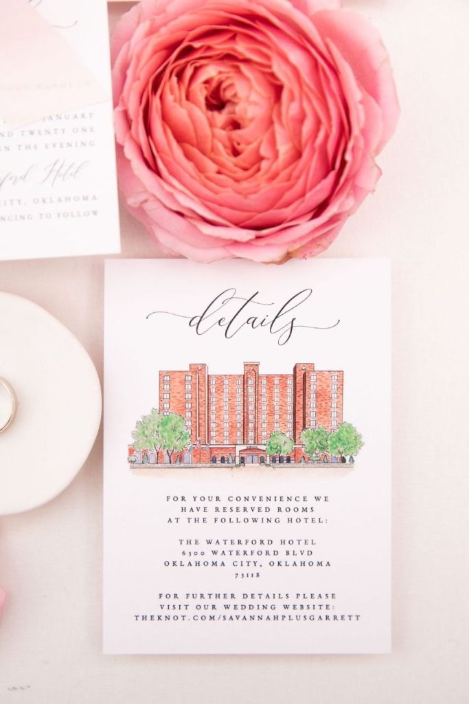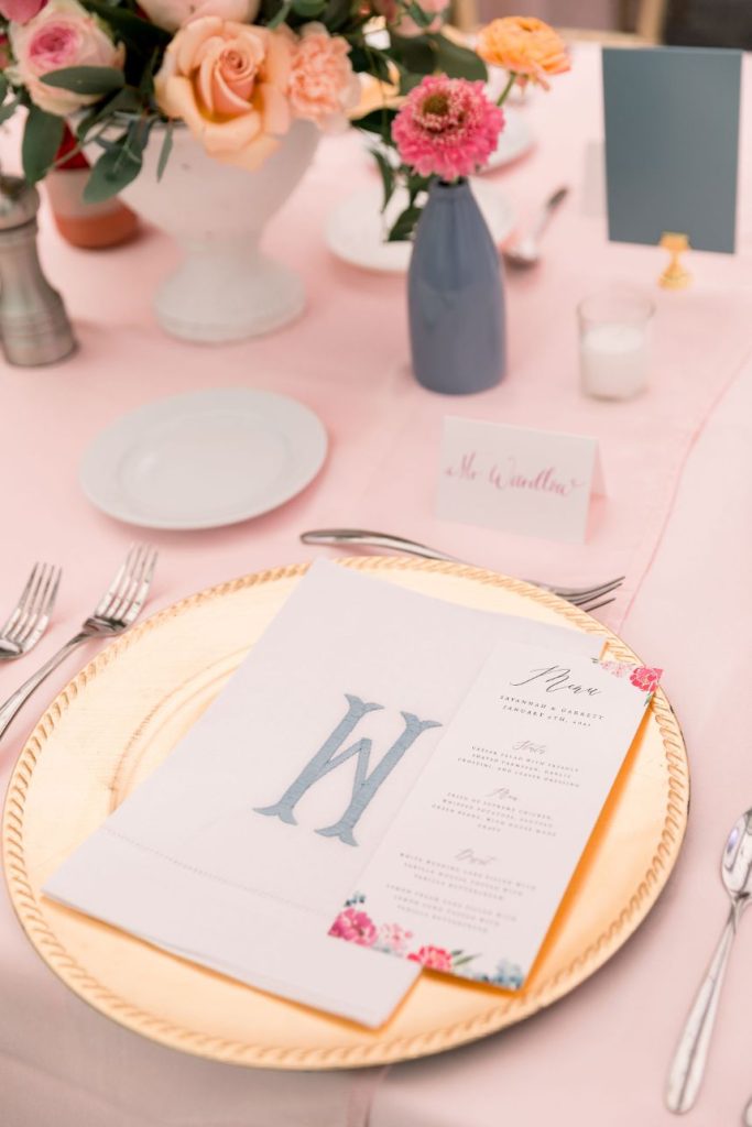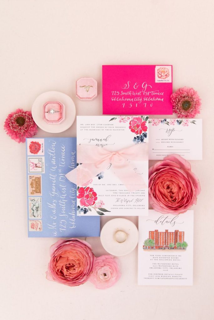 We can’t get enough of Savannah and Garrett’s pink fairytale winter wedding at the Renaissance Waterford Hotel. The sweet couple had a proposal that melted our hearts. Garrett planned a picturesque proposal decorated with images of special moments and a room full of flower arrangements – a sure-fire way to Savannah’s heart. The proposal would not have been complete without our favorite girl, Taylor Swift, playing “Lover” in the background. The couple’s wedding was nothing short of a fairytale with shades of pink in every detail, accompanied by dusty blue and gold elements. Savannah dazzled in a Hayley Paige ball gown from Bella Rose Bridal – Edmond, walking down the aisle to her groom. The thoughtful bride put a lot of time and love into her special day. Savannah created a hand-painted floral backdrop that complemented her classic white 4-tiered cake by Amy Cakes. The bride’s craftiness did not stop there. Savannah built the cutest cotton candy cart and also hand-painted florals on her stationary. The fairytale continued with blush pink table settings with accents of gold by Mood Party Rentals followed by pops of pink florals. Every pink detail and emotional moment was photographed so perfectly by Mary Keen. While capturing every laugh, tear and smile throughout the day, Mary Keen doubled as a dance partner with Savannah. The two danced to “Shake it Off” by Taylor Swift to end the night. All the joy and emotion of their special day will never be forgotten because the two get to relive their wedding with a film by Transform Visuals. Keep scrolling to see all the handcrafted details in this pink fairytale winter wedding.