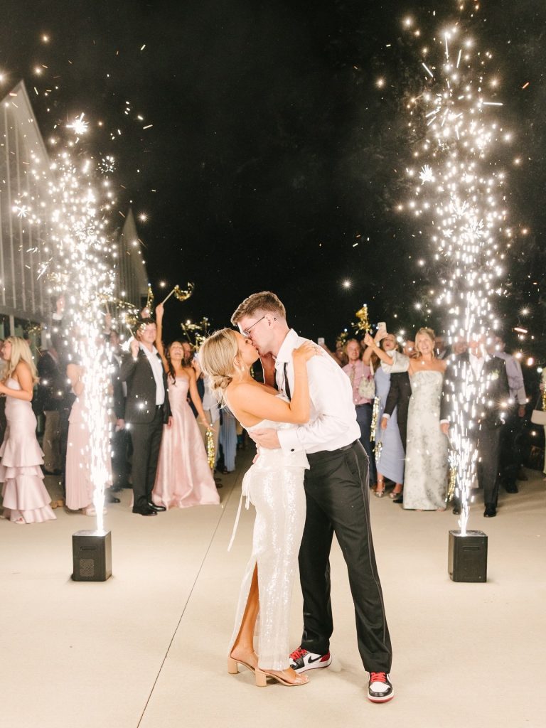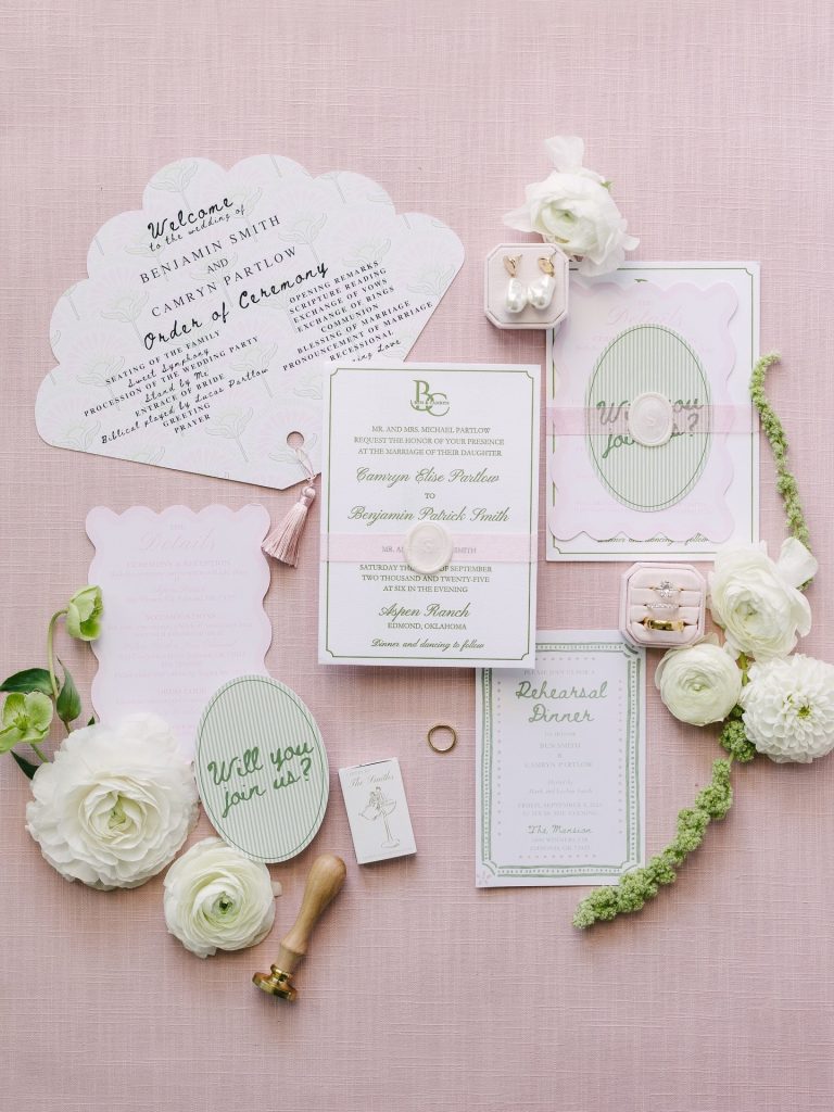 “Our wedding was a romantic celebration filled with lush florals, soft greens, and delicate pinks woven throughout every detail. We wanted the day to feel both elegant and deeply personal, so we incorporated wicker textures for a natural, timeless touch and layered in countless handmade details created by the bride. From the décor to the keepsakes, every element reflected our story and style. Surrounded by flowers and the people we love most, the day felt like an enchanted garden brought to life—warm, intentional, and uniquely ours.” -Camryn & Ben