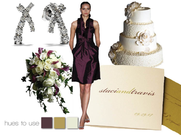 For a stunning wedding, try hues of deep plum offset by soft ivory. A simple, contemporary invitation like this from Modern Invitation Design subtly displays your purple hue and sets the stage for things to come. Dress your bridesmaids in a chic, stylish dress like this deep purple knee-length dress in Jim Hjelm’s Occasions Collection found at Meg Guess Couture in Oklahoma City and Bridal Classiques in Tulsa. To complement the richness and texture of the dresses, pair with these uniquely shaped diamond earrings by Hearts on Fire, found at BC Clark. For your grand entrance, carry a bouquet like the one above from Rebecca’s Silver Rose. This bouquet has a blend of ivory roses with soft touches of plum calla lilies. During the reception, keep things elegant with an embellished ivory cake like this, created by Amy Cakes. All of these touches are sure to mesmerize your guests, and leave them Plum Struck!