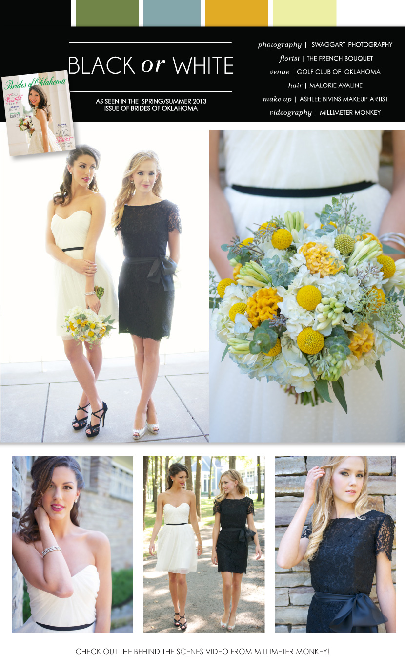 This lovely spring bouquet from The French Bouquet is the perfect highlighting tool for a classic black and white soiree. Contrasting from two ends of the color spectrum adds the perfect spring feel when pairing these golds and bright white with an earthy blue or green. Thanks to Swaggart Photography for capturing these lovely looks at the Golf Club of Oklahoma! And be sure to watch the behind the scenes footage captured by Millimeter Monkey!