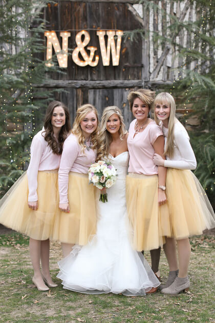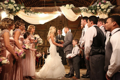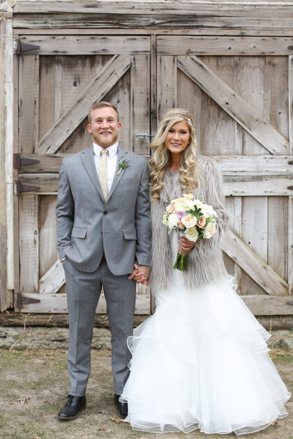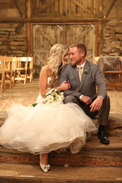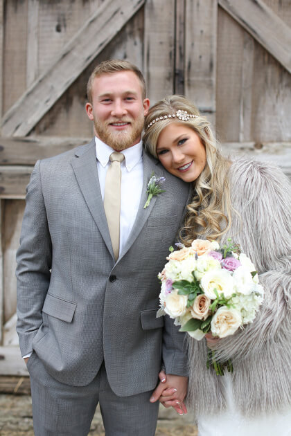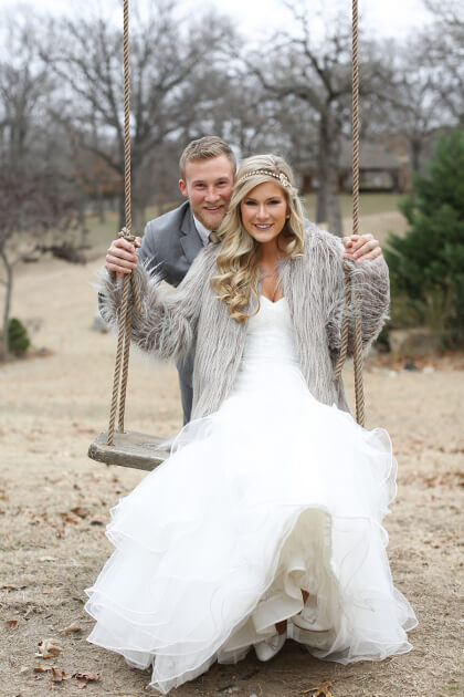 Natalie Paige Tims married Will Adam Mortensen at The Barn at Vive Le Ranch in Tulsa on January 10, 2015. Natalie looked radiant in a fit-and-flare gown with a sweetheart neckline, horsehair-trimmed tiered tulle skirt and sweeping train. She wore a pearl-trimmed veil and her mother’s bracelets, and carried a bouquet of white ranunculus, lavender rose, Sahara roses, succulents and white hydrangeas.