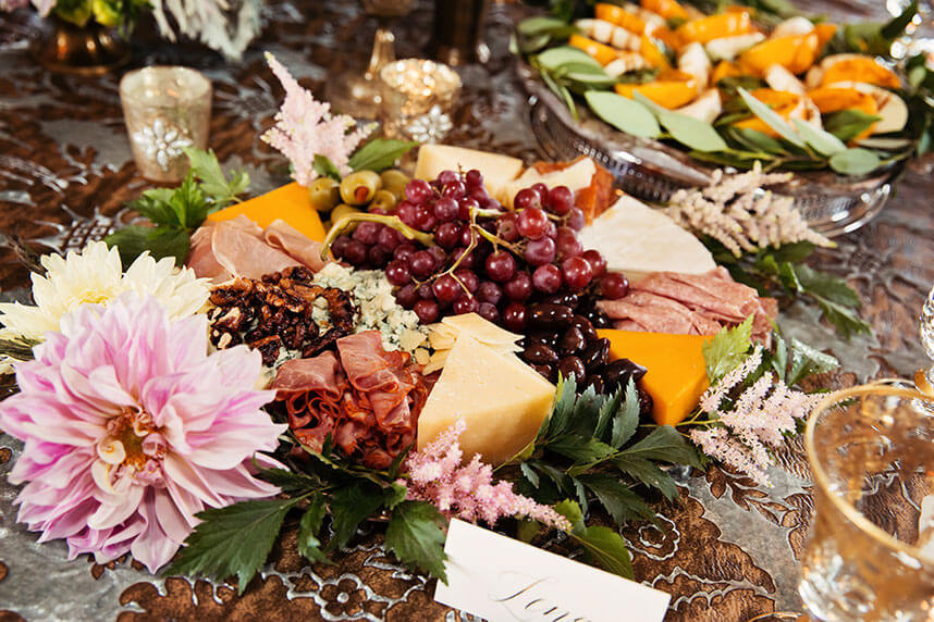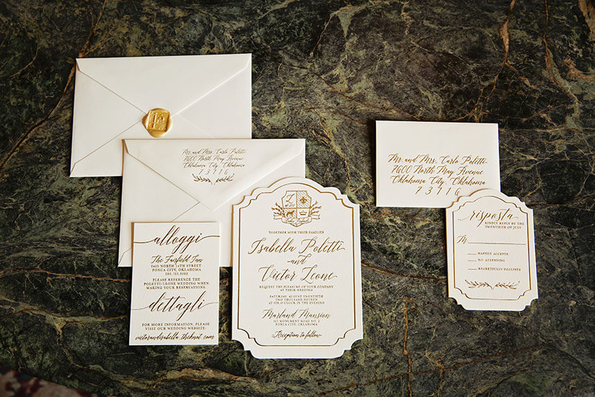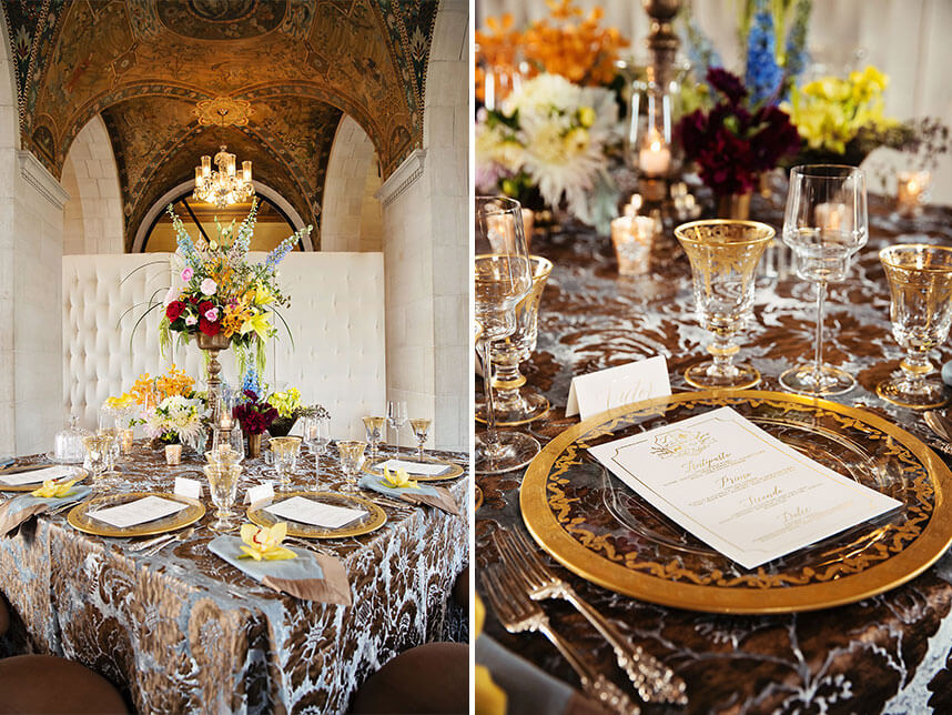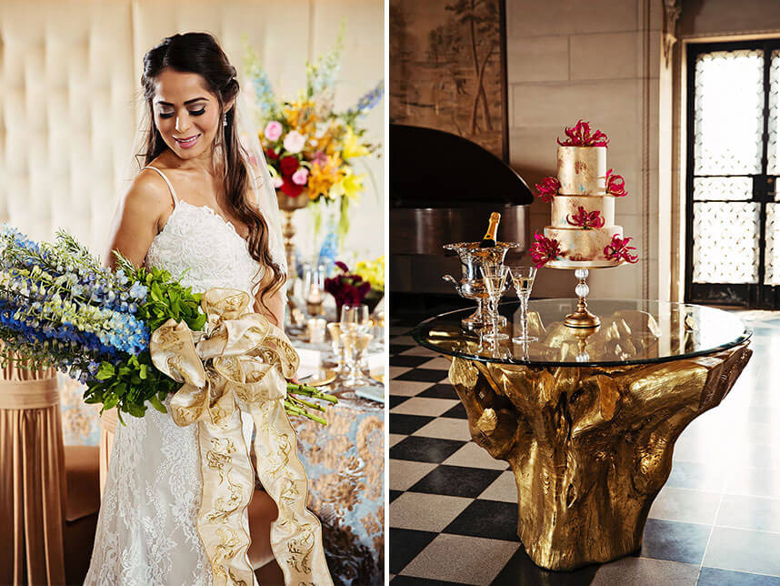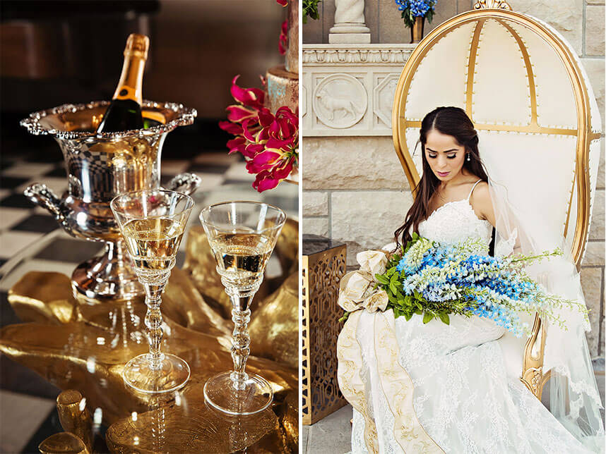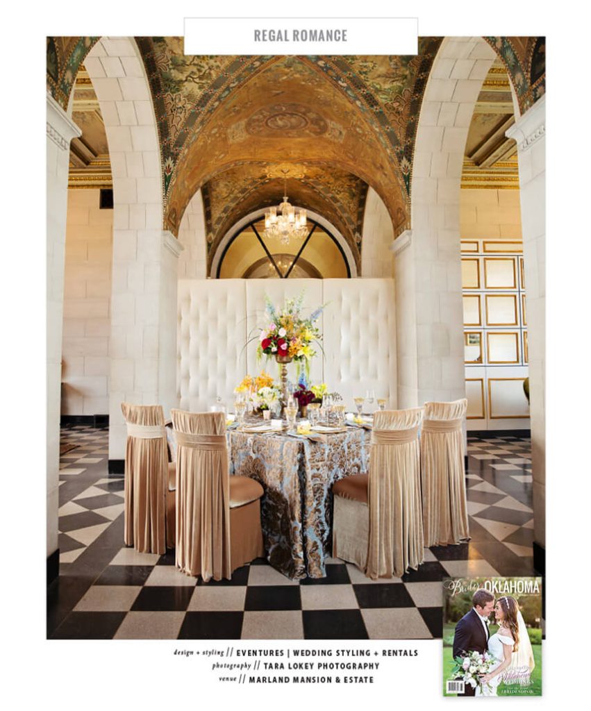 For a glamorous and regal wedding, we love this design by Eventures | Wedding Styling + Rentals! Marland Mansion & Estate provided the perfect over-the-top atmosphere for the lush and colorful florals by New Leaf Florist and the rich rental pieces from Eventures | Wedding Styling + Rentals. The gorgeous painted cake was created by the very talented Amy Cakes, and the mouth-watering food was made by Mickey Mantle’s Steakhouse. Paper + More captured the elegant feel of the design perfectly in their invitation suite, and Culinary Kitchen provided the gorgeous bar accessories as well as the amazing gold rimmed plates and bowls we are pining for! The beautiful model wore an amazing gown from Moliere Bridal that complemented her perfectly. Her gorgeous makeup was done by Atherial Makeup and Skin Studio and her romantic hair was styled by Faccia Bella. Tara Lokey Photography captured every luxurious detail crisply, and Pen Weddings filmed the scene to create the awesome behind the scenes videos below. Grab a copy of Brides of Oklahoma to see more from this regal romance shoot!