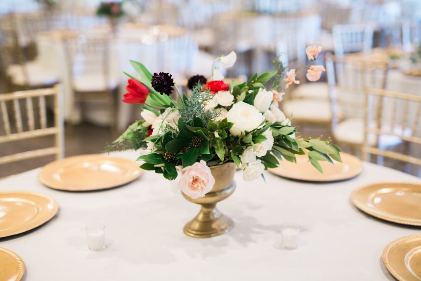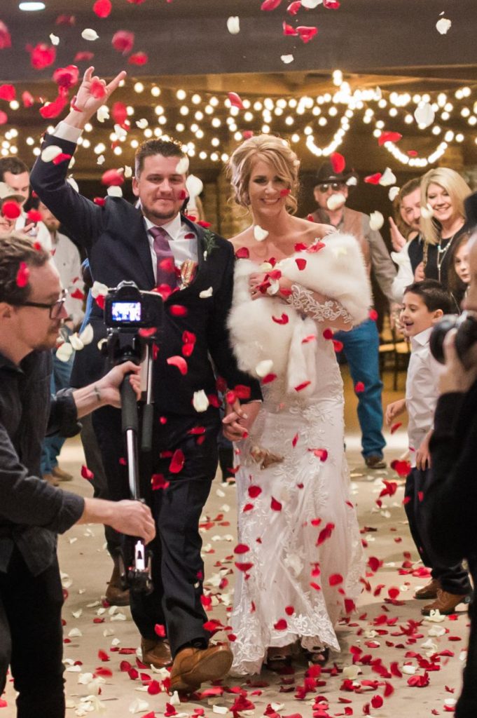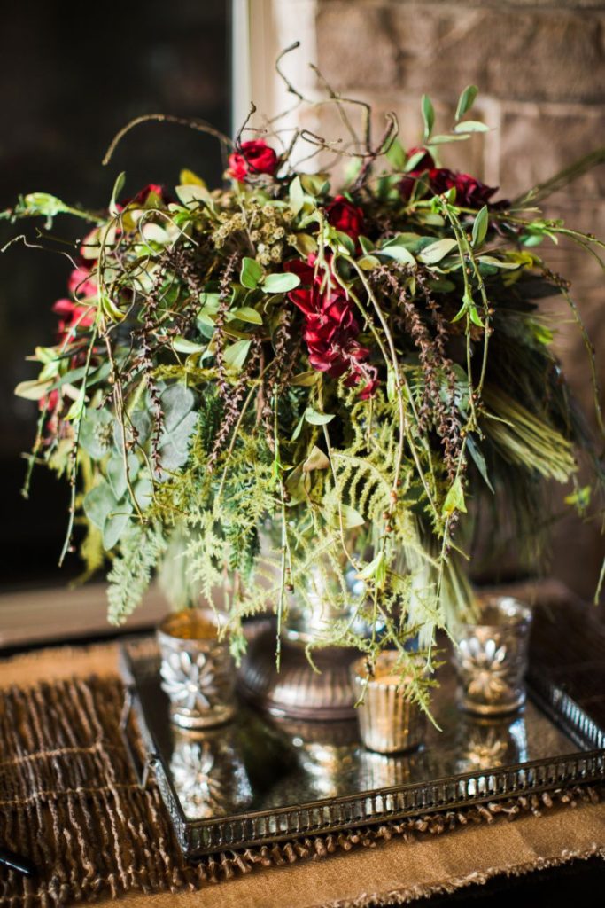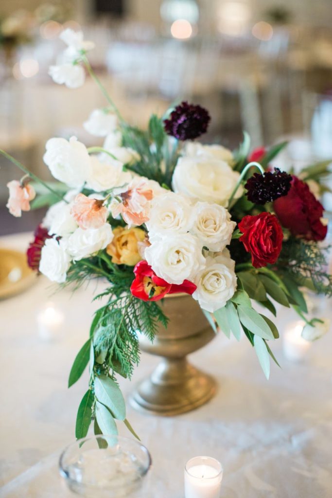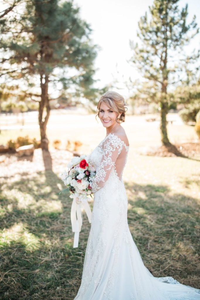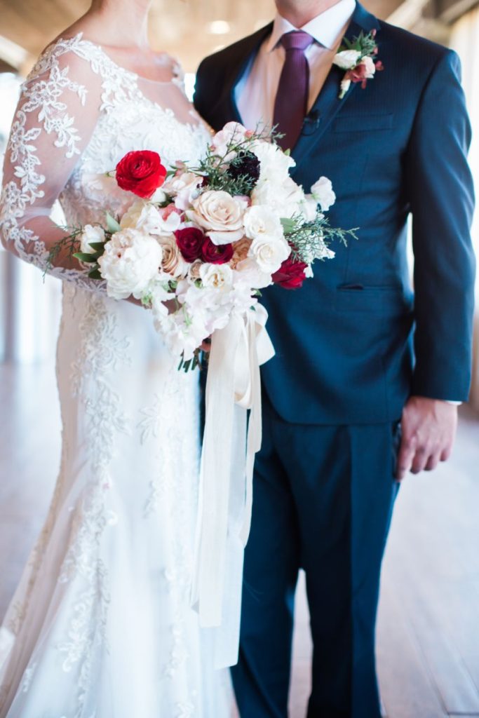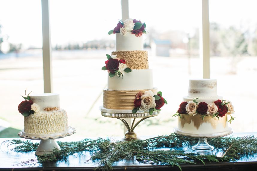 We are getting all the classic red winter wedding vibes from Sunni and Nathan’s big day! Captured by Hope Photography at Coles Garden, this scene was brought to life by fab ruby red floral arrangements by Poppy Lane Design and a trio of gold-accented cakes by Amy Cakes. We can’t go without mentioning the bride’s gorgeous lace gown from Bella Rose Bridal and rings from BC Clark Jewelers. Abbey Road Catering wrapped up the evening with delicious eats! See more of this wintry wedding day below.