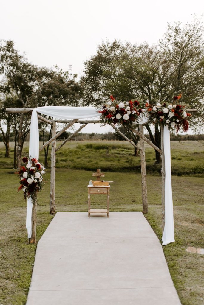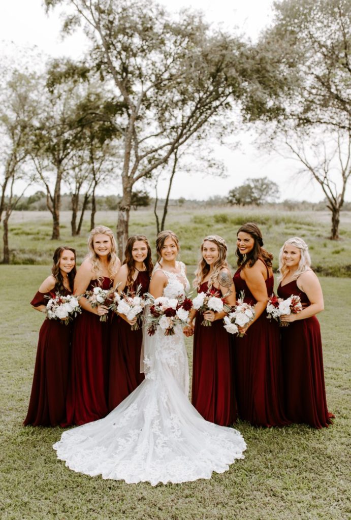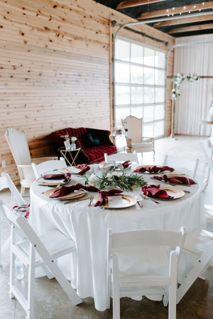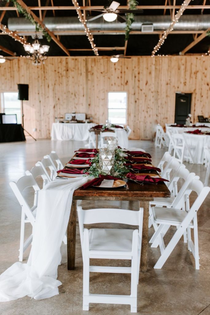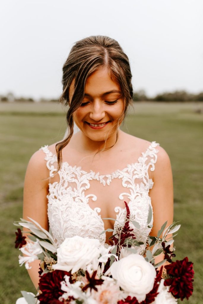 Ashlann and Colton’s rustic chic wedding is full of romance and bursting with thoughtful details from the bride herself! This couple’s love story began through a mutual friend, where Ashlann was trying to get her high school best friend to date Colton (like any encouraging friend would do, right?). Fast forward to a couple years later when Ashlann and Colton first met – it was then that they realized that her best friend was talking about this military boy all along. Ashlan never believed in love first sight until she met Colton, and now she’s a firm believer! With a non-traditional romantic love story with how they first met, they were sure to bring their unique love story into every sweet and thoughtful detail of their day – so much so that it makes Ashlann tear up with all the sentiment. Romantic shades of deep maroon accented with gold and soft rustic details from Party Pro Rents bring in all the cozy vibes to this September wedding scene. Sweet and delicate, this couple’s three-tiered wedding cake from Sweet Devotion Cakery is definitely one of our favorite details from the celebration. Chelsea Littleton Photography not only flawlessly captured every rustic chic and maroon detail of this romantic day, she also happened to be the bride’s favorite vendor along the way! Scroll to see all of the lovely details and to see why this rustic chic wedding is full of romance. Cheers to Mr. and Mrs. Olivares!