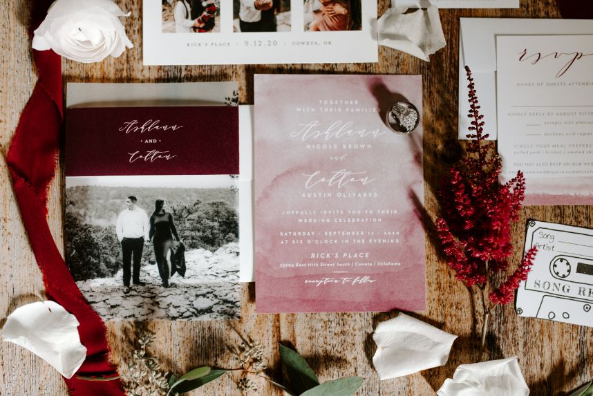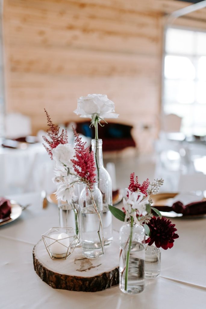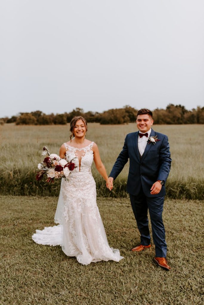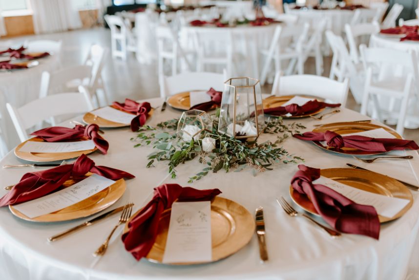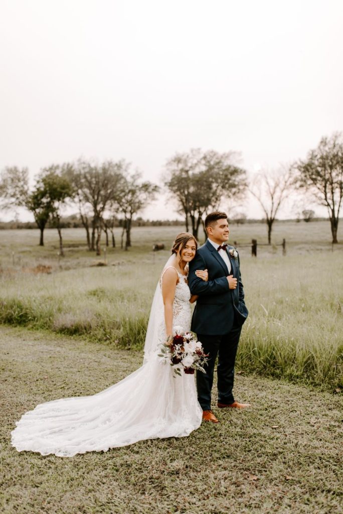 Ashlann and Colton’s rustic chic wedding is full of romance and bursting with thoughtful details from the bride herself! This couple’s love story began through a mutual friend, where Ashlann was trying to get her high school best friend to date Colton (like any encouraging friend would do, right?). Fast forward to a couple years later when Ashlann and Colton first met – it was then that they realized that her best friend was talking about this military boy all along. Ashlan never believed in love first sight until she met Colton, and now she’s a firm believer! With a non-traditional romantic love story with how they first met, they were sure to bring their unique love story into every sweet and thoughtful detail of their day – so much so that it makes Ashlann tear up with all the sentiment. Romantic shades of deep maroon accented with gold and soft rustic details from Party Pro Rents bring in all the cozy vibes to this September wedding scene. Sweet and delicate, this couple’s three-tiered wedding cake from Sweet Devotion Cakery is definitely one of our favorite details from the celebration. Chelsea Littleton Photography not only flawlessly captured every rustic chic and maroon detail of this romantic day, she also happened to be the bride’s favorite vendor along the way! Scroll to see all of the lovely details and to see why this rustic chic wedding is full of romance. Cheers to Mr. and Mrs. Olivares!