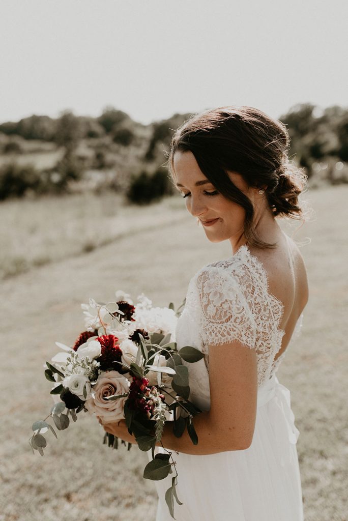 We’re still on cloud nine over last week’s exciting cover reveal, and we’ve been anxiously waiting to show you more from Rylan and Trevor’s rustic Oklahoma wedding at Rosemary Ridge in Stillwater. Rylan was absolutely stunning in a Cambie by Truvelle gown featuring an ethereal flowing chiffon skirt and illusion V-neck, lace bodice from Chantilly Couture. The talented team at Atherial Beauty added the finishing touch with subtle makeup and a soft updo to perfect Rylan’s natural bridal look.