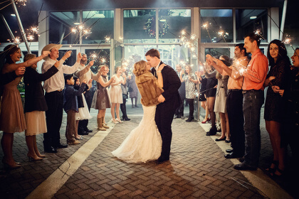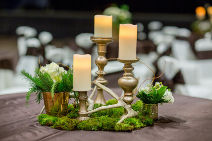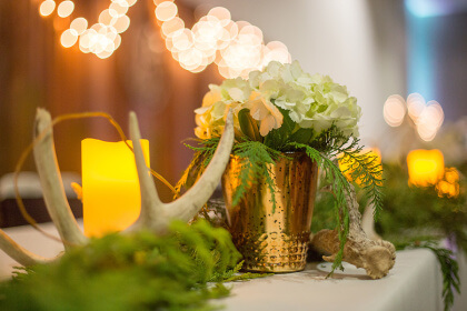 Following the ceremony, the couple joined guests at the Ardmore Convention Center. Hues of chocolate, ivory, gold and blush adorned the reception hall decorated to portray the couple’s rustic but elegant style. Facades of rusted tin and old barn wood, built buy the groom himself, lined the walls, while antler sheds and gold mercury glass complemented the gorgeous woodland-inspired arrangements designed by Maria’s Garden. Guests enjoyed cocktails, hors d’oeuvres, dinner and dancing before lining the sidewalk with sparklers to see the couple off to spend their dream honeymoon at Sugar Beach in St. Lucia. Following a week of fun in the sun, they returned home to their ranch near Sulphur, Oklahoma.