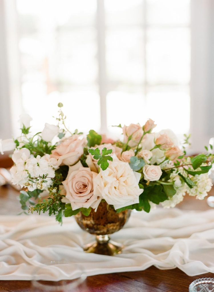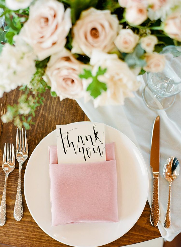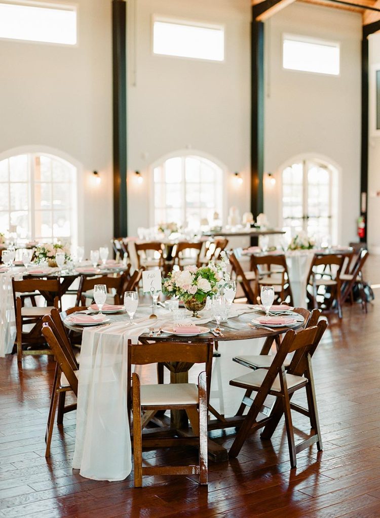 The reception was held inside Sparrow with its rustic warmth and large windows seeping in plenty of natural light. While the wedding party and family members took photos outside, friends mingled for cocktail hour. Round wooden tables were topped with soft creamy fabric and vases of pastel roses and greenery. Thank you notes from Kirstin and Dustin were tucked inside pale pink cloth napkins. To add to the romantic look, candles glowed between place settings.