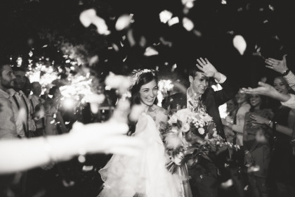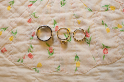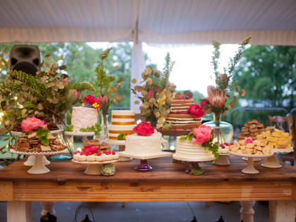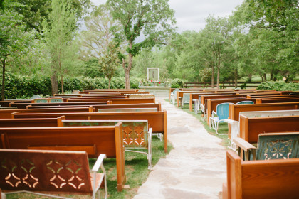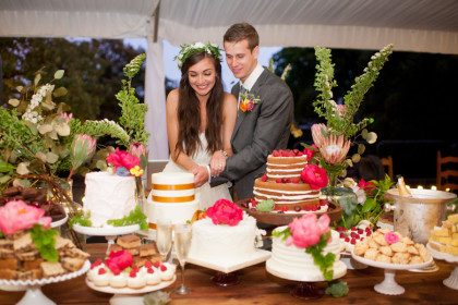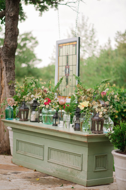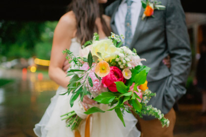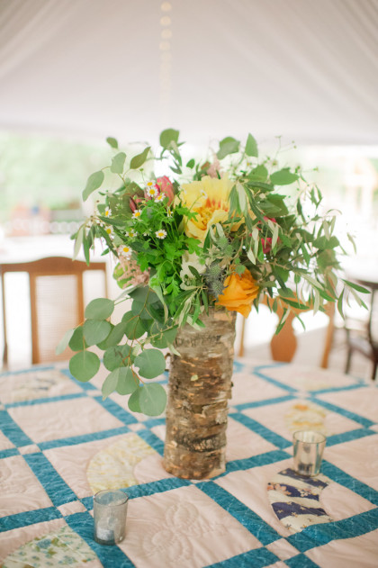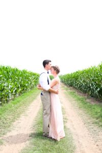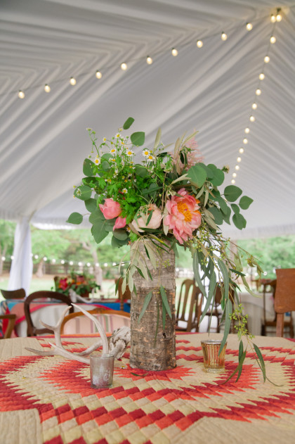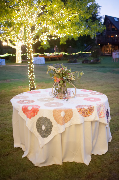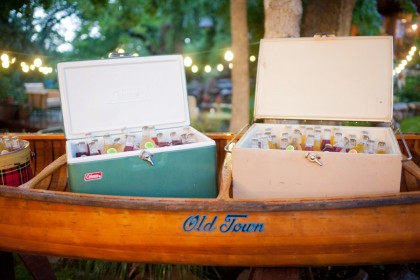 Roxy’s Ice Cream had been rented for dessert, but due to the weather delay it ended up being a fun pre-ceremony snack for the guests. After the ceremony, the Glover’s home transformed into the reception venue and guests lounged on charming furniture sourced from the father of the bride’s antique store, Ancient of Days. Something Borrowed supplemented many décor pieces including stained glass, quilts, a canoe and chandeliers. Jayme and Josh incorporated many traditional rituals into their wedding including a cake cutting, a father-of-the-bride toast, a bouquet toss and a garter toss. The newlyweds took their first dance to “I Will” by the Beatles. The band Empty Bottles and a DJ provided music for the guests long into the night.