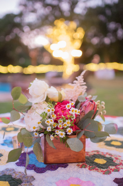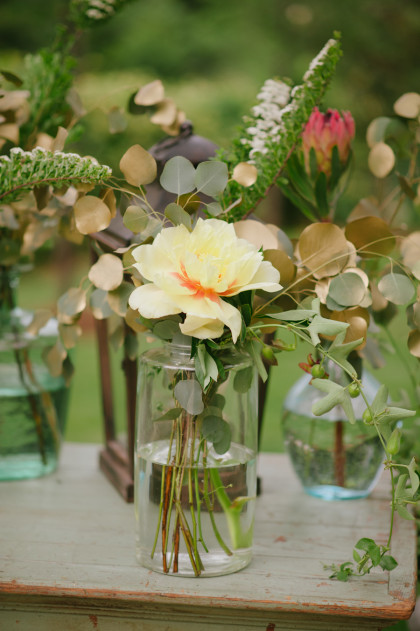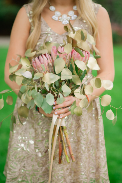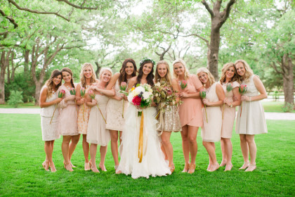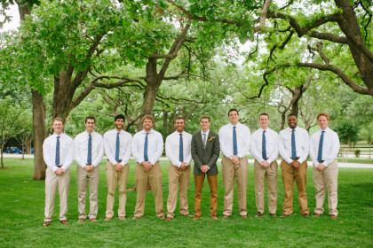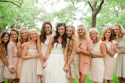 The twenty-five person bridal party was a joy for Jayme and Josh to have supporting them on their big day. Jayme’s sister, Kelsey Glover, served as her maid of honor, and Josh’s brother, Jordan Phillips, served as his best man. In blush dresses of their own choosing, Jessi Donnel, Lauren Rust, Sarah Beth Patterson, Tiffany Jupin, Jennifer Jupin, Heather Jackson, Kaley Ross, Sutton Joslin and Halie Summers completed the bridal party. Andrew Phillips, Jackson Phillips, Grant Phillips, Travis Glover, Troy Ross, Asher Coe, Michael Crawford, Jordan Lundeen, Neal Stewart, Jevon Oliver, Clark Collier and James Tunnel were dapper groomsmen. The bridesmaids wore matching J. Crew necklaces and each carried a single king protea stem. The maid of honor carried a lovely bouquet of three king protea stems surrounded by silver dollar eucalyptus. Jayme carried a delightful arrangement of bowl of cream peonies, coral charm peonies, honeysuckle, chamomile, Italian ruskus, ranaculus, bay laurel, olive and hyacinth.