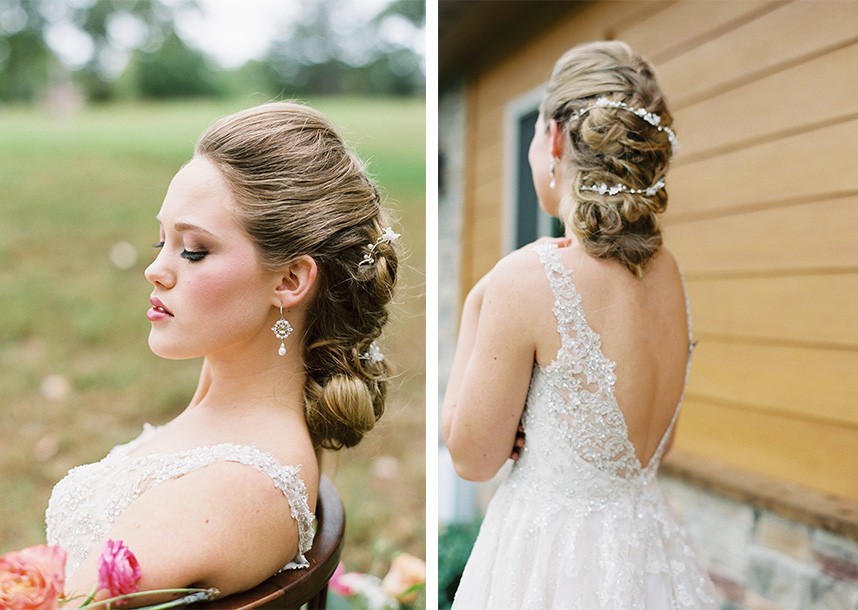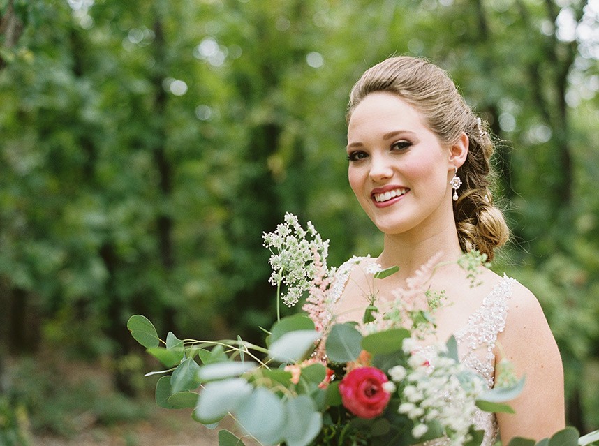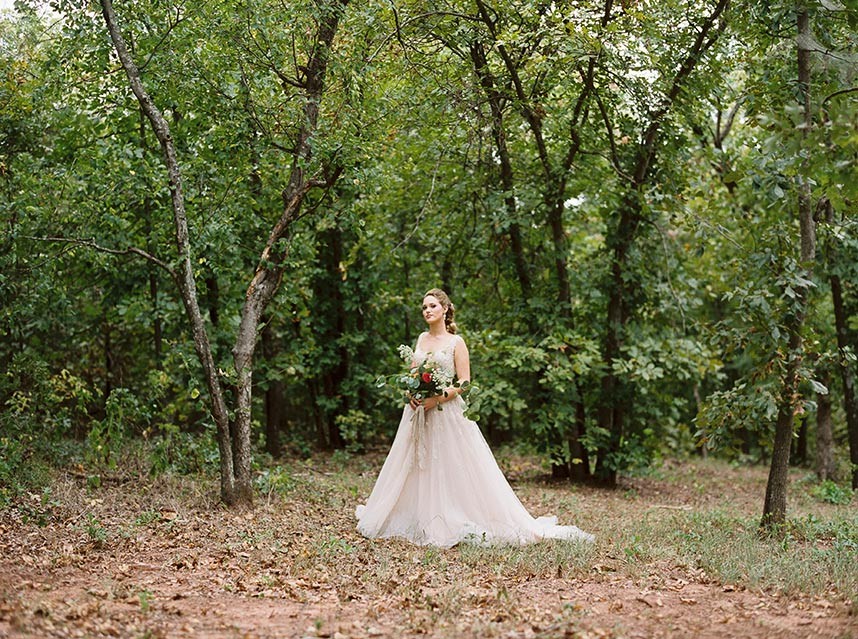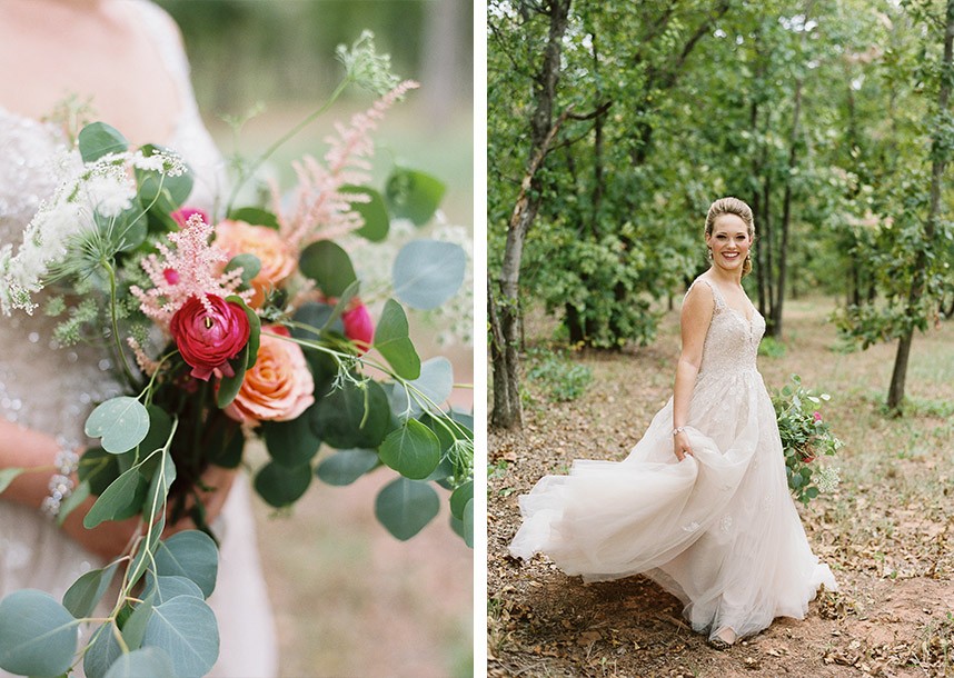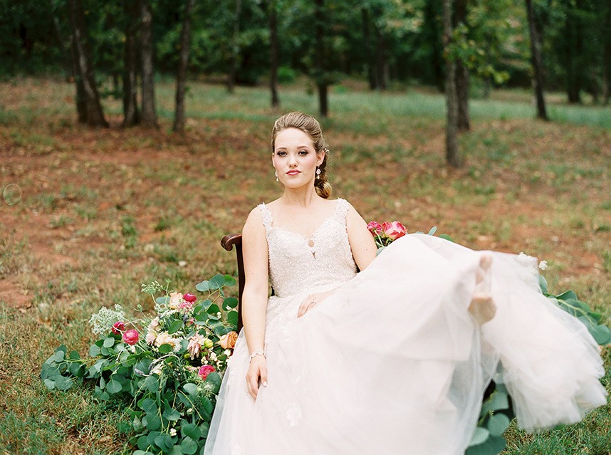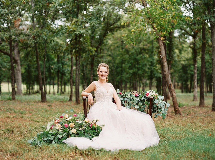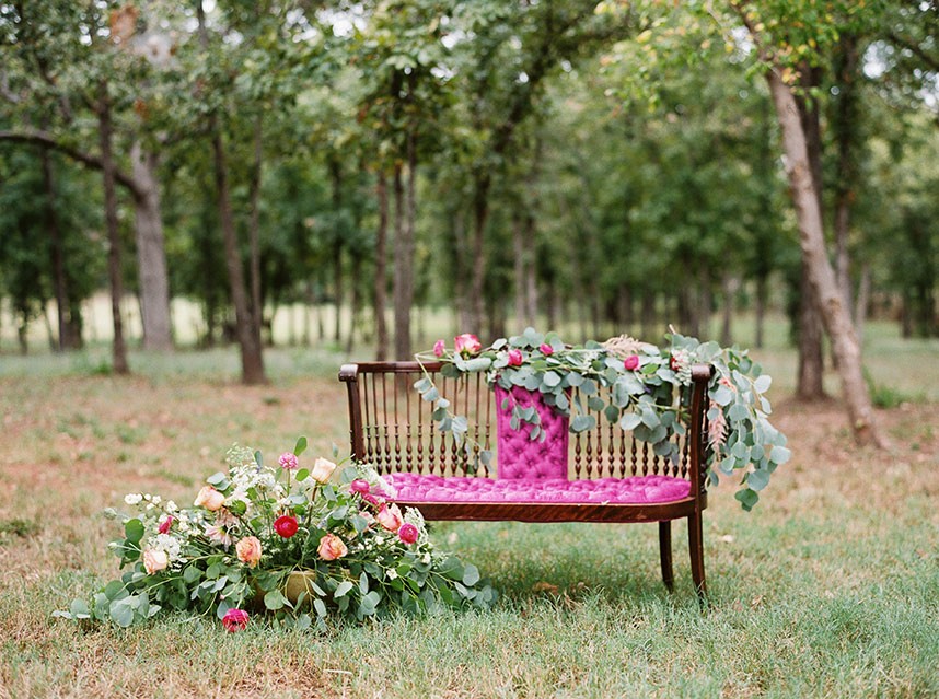 In honor of the Eleven Oaks Ranch Grand Opening Celebration, we couldn’t wait to share this gorgeous, rustic wedding inspiration shoot styled by Inspire Events captured by Sheradee Hurst Photography! This shoot was concepted with an Oklahoma bride in mind, and the blooms are perfect as we head into spring. Set amongst the oak trees surrounding Eleven Oaks Ranch, this shoot brings out the true organic vibes from the surrounding scenery. The model bride looked stunning atop the hot pink vintage furniture in her darling, beaded gown was from Prescott Bridal. This wedding inspiration makes for a perfect happy Tuesday!