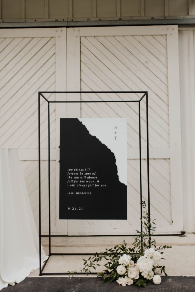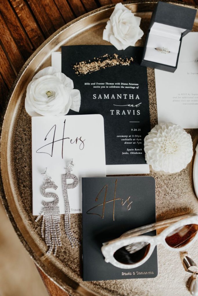 Travis proposed to Samantha on her 30th birthday trip to a vineyard near Athens, TX. Of course, Samantha said “YES” to the love of her life, and the two began planning their dream modern wedding. Since Samantha and Travis are both from and live in Wichita, they called in help from Ever Something to plan their wedding. And boy did Ever Something deliver the most beautiful modern wedding. To begin with, the couple invited guests to join them with invitations from Chirps & Cheers. You can never go wrong with a beautiful black and white invitation suite with modern text and clean lines. Next, Party Pro Rents provided all the decor and rentals to transform the blank canvas space into a modern dreamscape. Guests enjoyed catering from Just Catering by Orr and a slice of cake from Sweet Devotion Cakery to top it off. Throughout the night, Samantha and Travis even included Travis’s favorite dessert, Krispy Kreme donuts. Instead of doing a traditional guest book, Samantha and Travis had guests print off an extra photo from MVP Photo Booth and leave a special message on the back of each photo. We absolutely love this idea! Finally, the highly talented Caroline Eliza Co. captured and told a story through every image she captured in Samantha and Travis’ big day. You must keep scrolling to see all the photos and read a special note about the couple’s dream wedding maker. Cheers to Mrs & Mrs. Peterson!