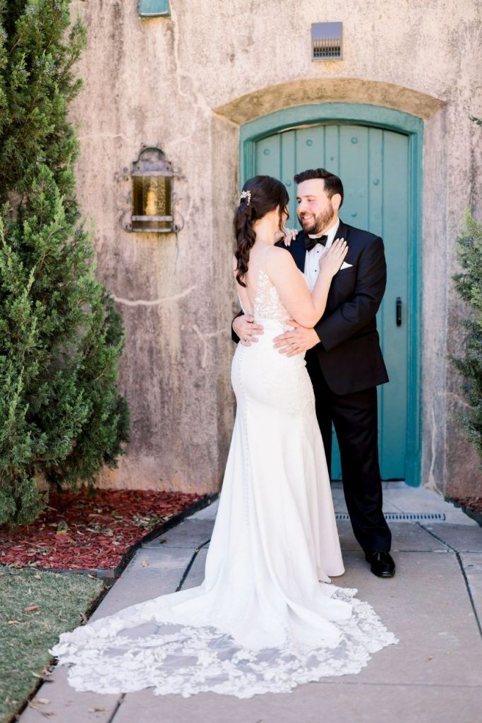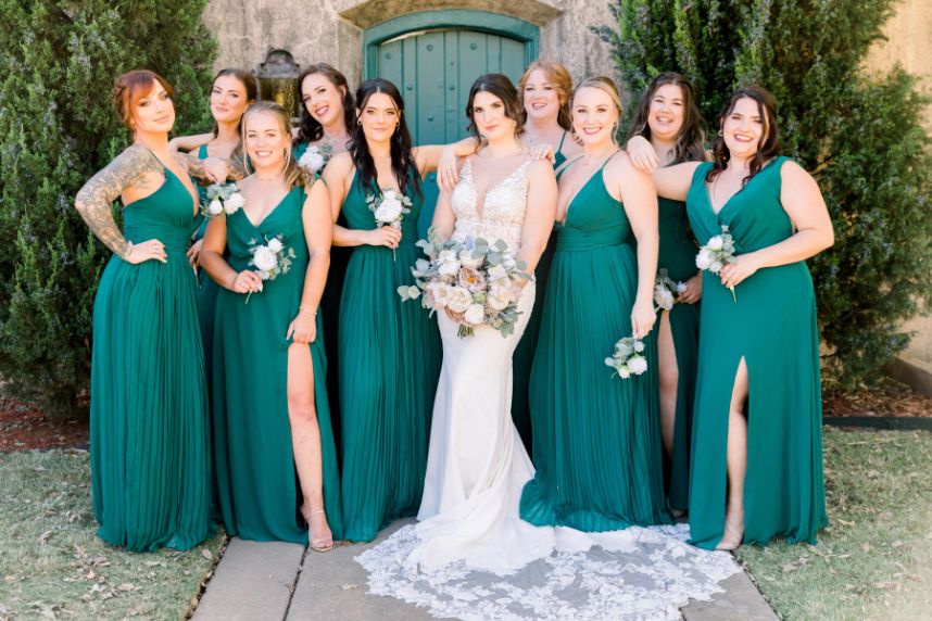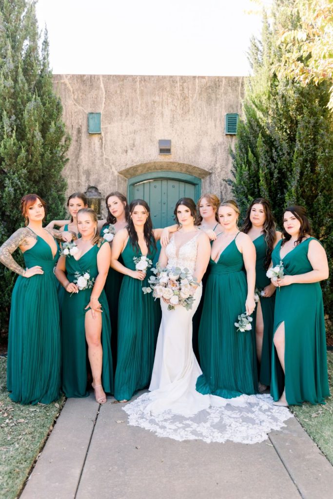 After the first look, Sarah and Mark shared their handwritten vows with each other and their guests during their outdoor ceremony. Following the ceremony, the couple was ready to celebrate with guests! Their classic and romantic reception included emerald green decor and rentals from Party Pro Rents and a delicious dinner of tex-mex food from Just Catering by Orr. In addition, Just Catering by Orr made all of Mark’s dreams come true with a tower of chicken tenders and toast from Raising Canes, topped with a Cane’s Sauce fountain for their late-night snack. Sarah and Mark spent the rest of the night enjoying the company of their guests who flew from around the country to celebrate them in Oklahoma!