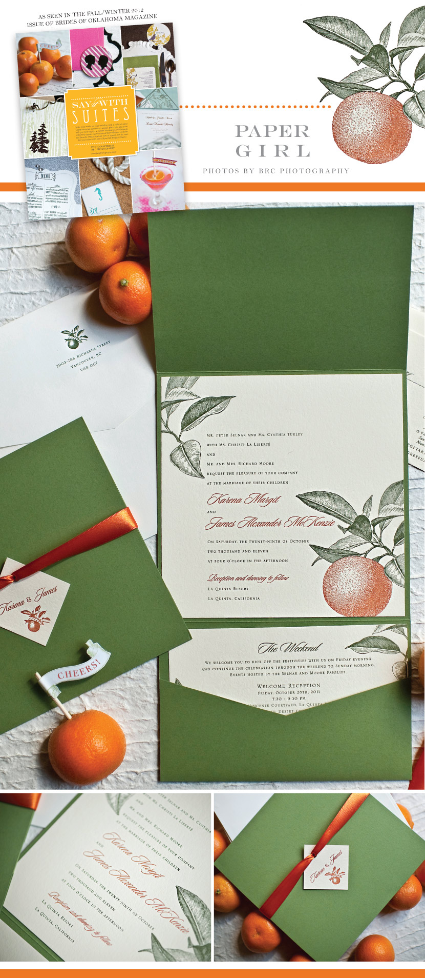 With the first days of wintery weather upon us, we are already dreaming of the summertime! If you’re planning a warm summer soiree, these lovely wedding invitations from Paper Girl might be the perfect way to kick off your celebration. Bold oranges and greens create a fresh color palette great for an outdoor wedding!