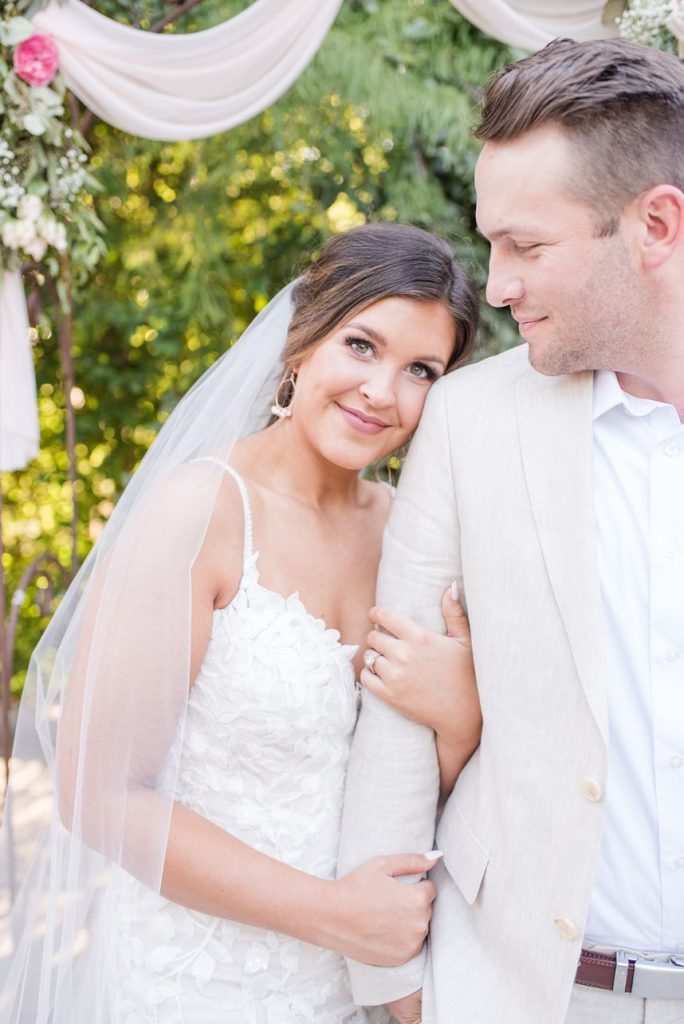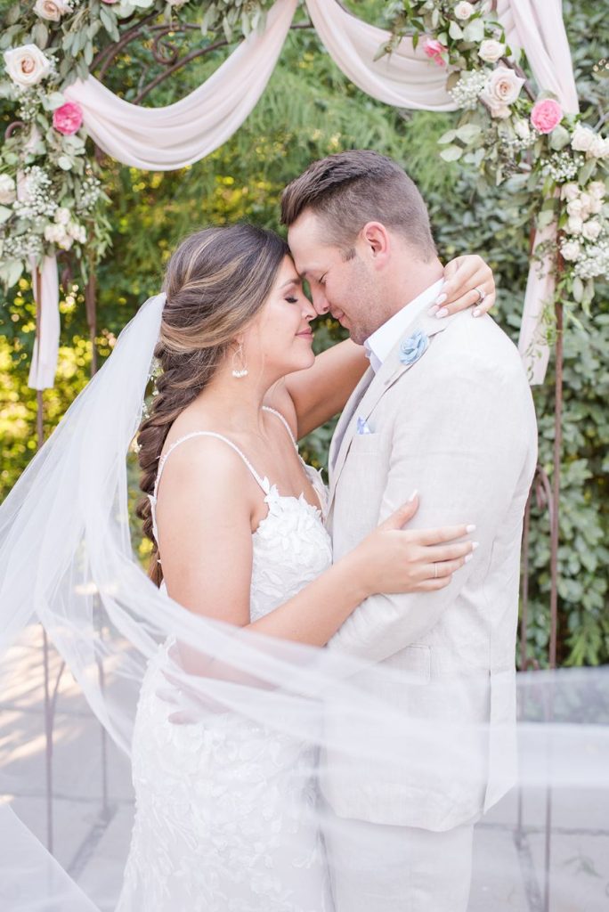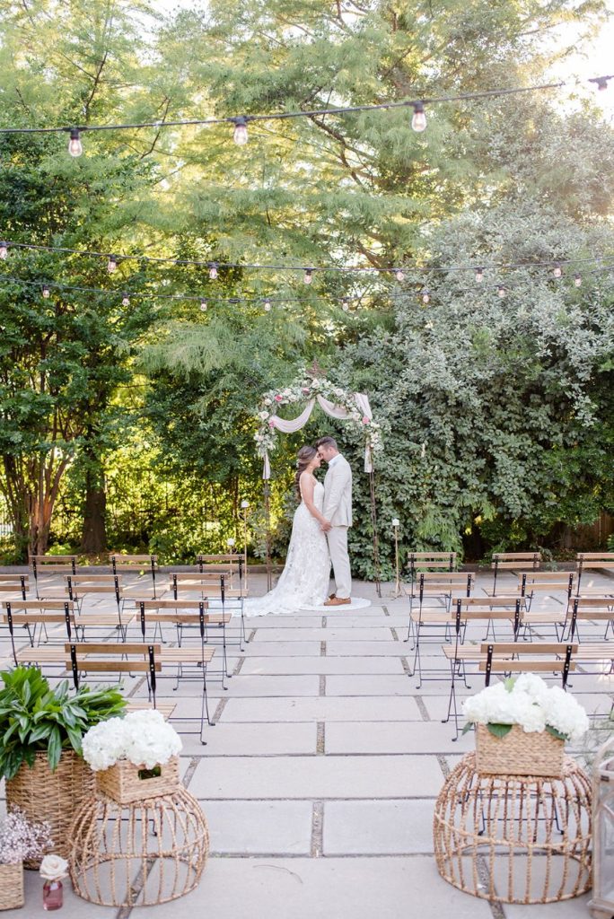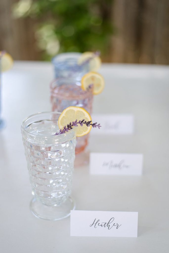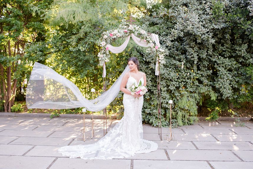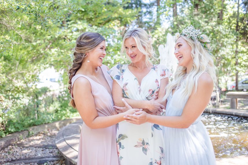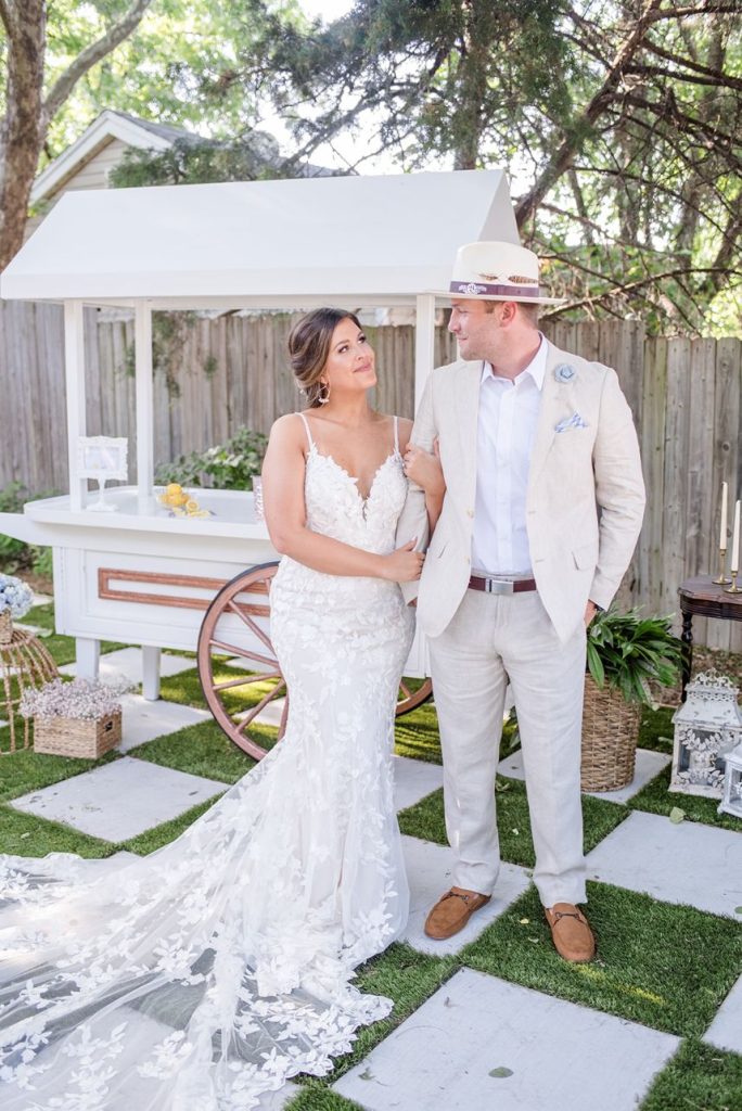 In The Secret Garden, Frances Hodgson Burnett wrote, “If you look the right way, you can see that the whole world is a garden.” With all elegant elements combined, this seaside wedding inspiration has us thinking just that! Daffodil Hill and its lush and intimate courtyard setting create MAJOR boho-meets-secret-garden vibes in this styled shoot with breathtaking greenery scattered throughout the venue along with an elegant, scenic fountain and various architectures. No wedding day (styled or otherwise) is complete without custom invitations and The Letter Box designed the most gorgeous suite, as well as envelopes hand-lettered in flawless calligraphy. The venue’s lovely, natural space was accented with vintage rentals from Borrowed and Bleu Co. including a stunning muted emerald loveseat, as well as several other decorative pieces that make this styled bohemian big day feel oh-so-real! This bride looks absolutely radiant modeling alongside her real-life hubby, who looks dapper and chic in menswear from Everyman. Bridesmaids in the sweetest chiffon pastel and floral-patterned gowns from Bella Bridesmaids help to add an air of whimsy and fun when things get too serious! From the lovely floral design and adorable flower jar favor wall to the most refreshing-looking cocktails, we’re going to be daydreaming about this styled shoot for a while! Read on for a brief note from the photographer about the vision behind this secret garden meets bohemian wedding inspiration. Cheers!