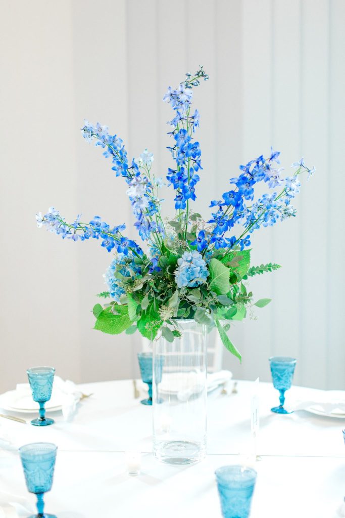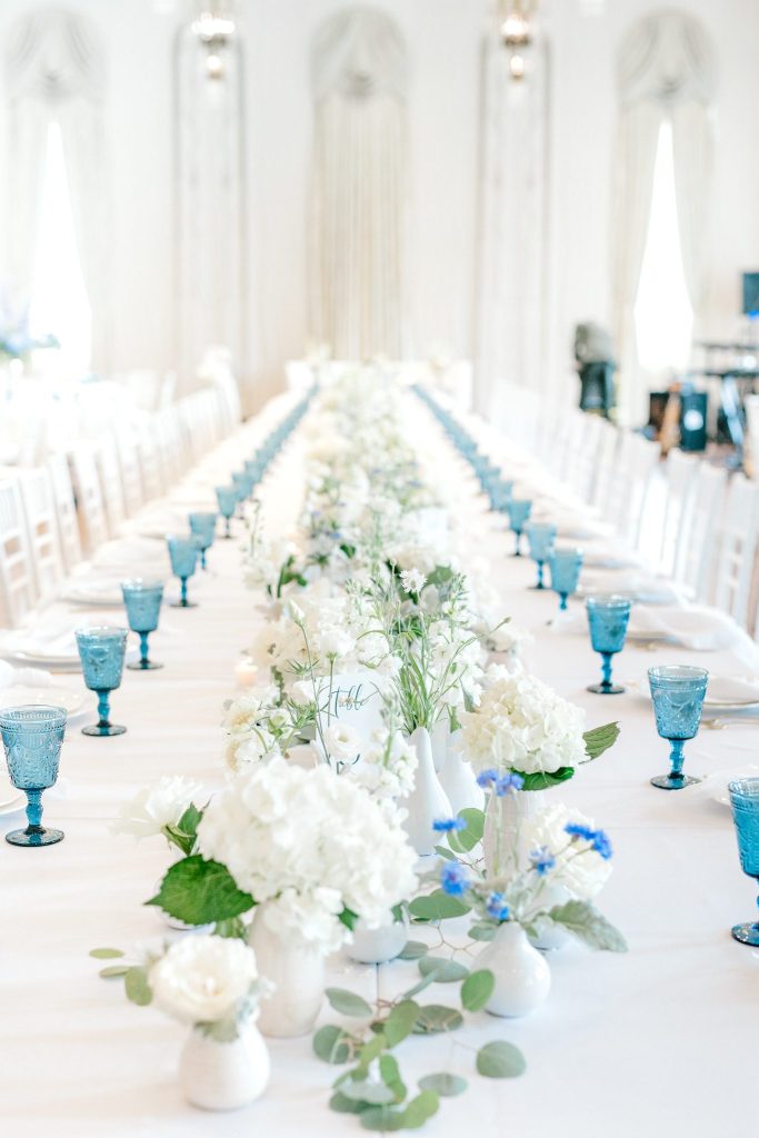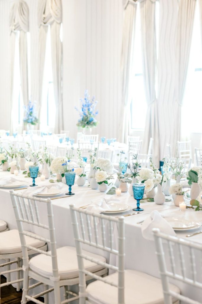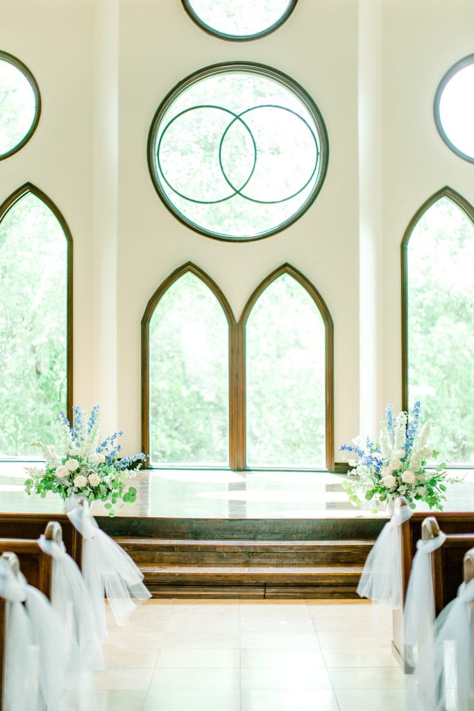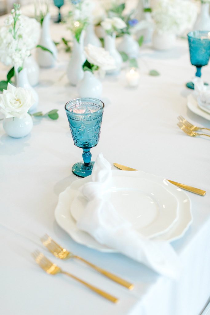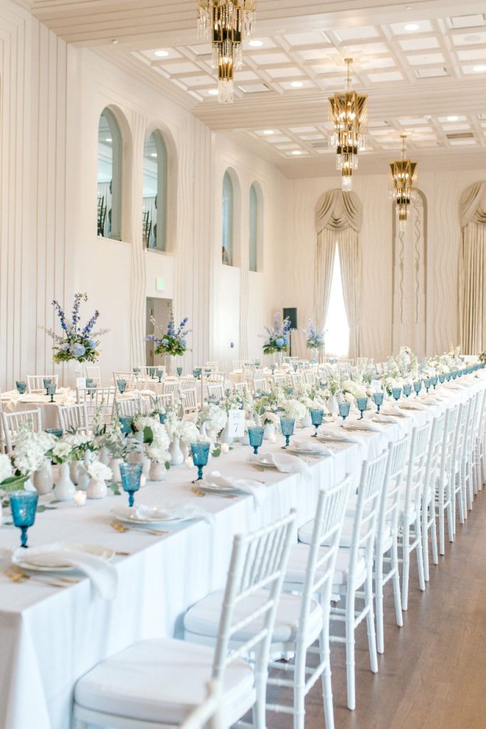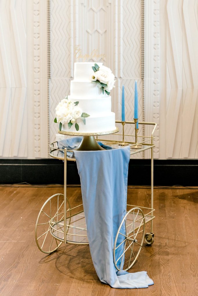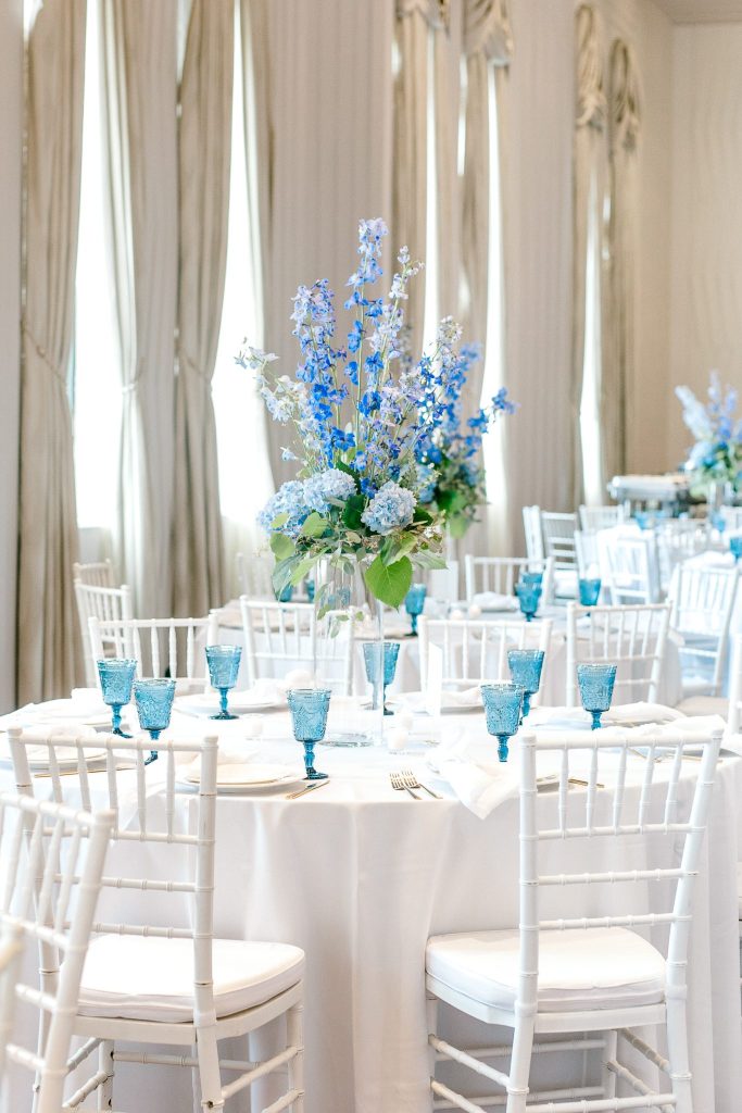 Natasha and Slavik’s timeless Tulsa wedding with all the shades of blue is definitely one for the books. Harper Mae Events coordinated the couple’s special day and made sure Natasha and Slavik could enjoy their day to the fullest. Their day entailed a beautiful ceremony at The Bella Donna with their gorgeous cathedral windows. The windows allowed natural light to illuminate the ceremony space that the talented Meg Rose Photography captured beautifully. After the ceremony, the couple and guests made their way to the reception space. Inside their grand reception hall, decor and rentals from Party Perfect Event Rentals and Party Pro Rents created a sophisticated and timeless space. Shades of blue florals from Robyn’s Flower Garden adorned the tabletops, accompanied by blue glassware and gold accented flatware. A jazz band played soft jazz throughout the reception while the couple got to spend intimate time with their guests. Both Natasha and Slavik come from Russian backgrounds. The couple decided to incorporate their Russian culture throughout their ceremony and reception. One of our favorite traditions Natasha shared is their dessert table. In Russian culture, it is tradition for family and friends to make sweet treats for all to enjoy. We absolutely love this! Keep scrolling to see all the sophisticated shades of blue and read a sweet note from the bride. Cheers!