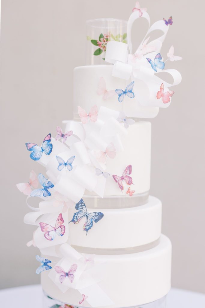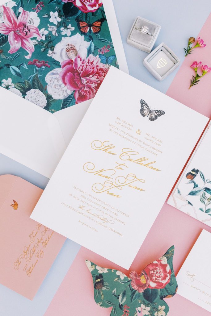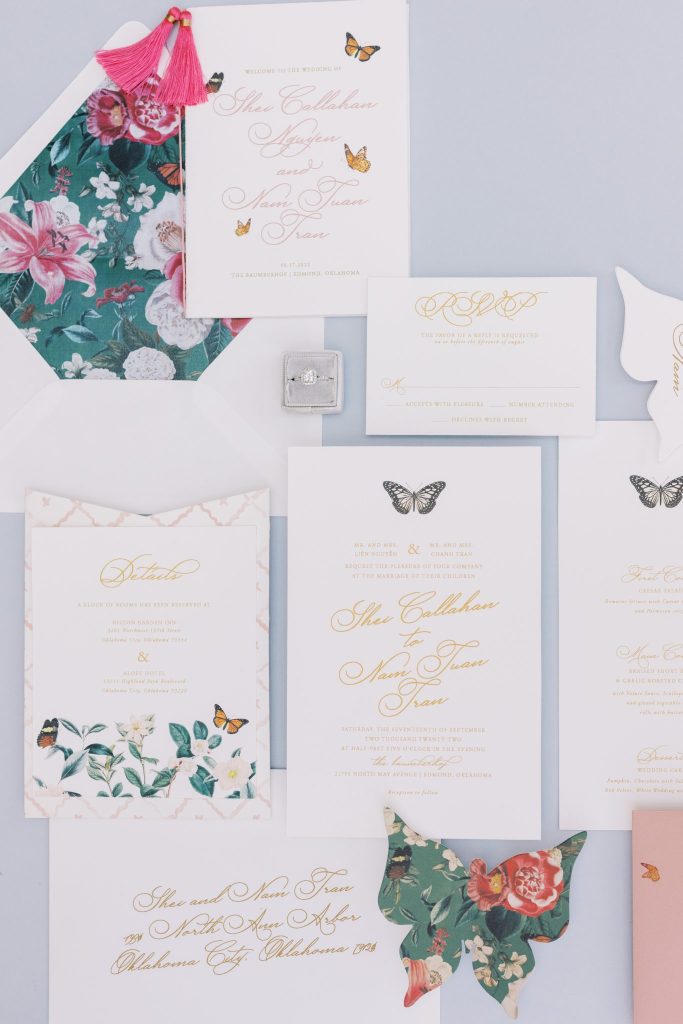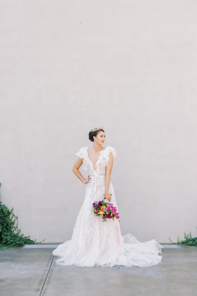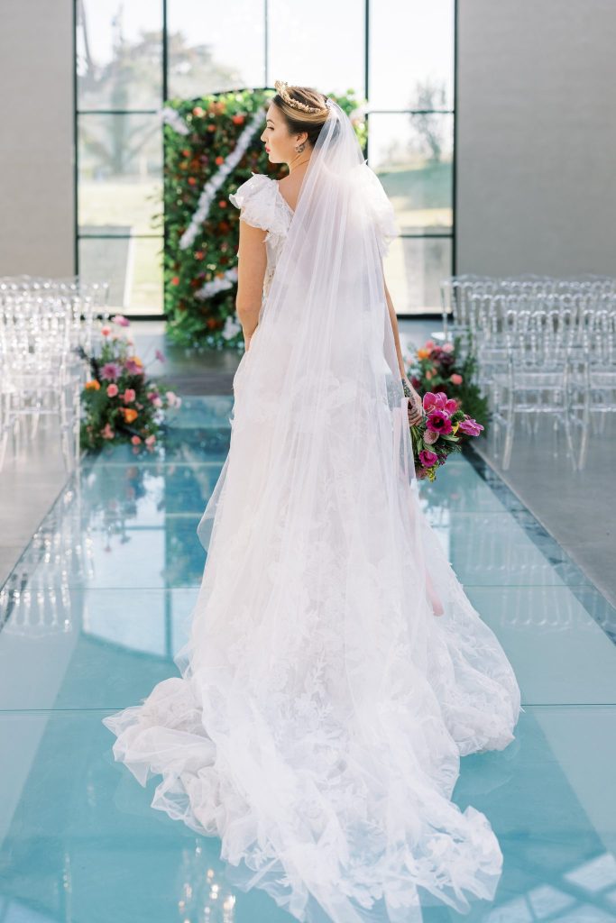 You are cordially invited to Singapore’s wedding of the year with this vibrant and whimsical garden editorial inspired by the modern love story Crazy Rich Asians. The over-the-top wedding of Nick Young’s best friends Araminta and Colin is a botanical dreamscape full of luscious florals and butterfly accents. Our editorial adaptation of the film’s notorious wedding scene is a vibrant and whimsical garden soirée that even Nick’s Ah Ma (grandmother) would approve of. Captured at The Baumberhof, their glass top aisle nearly mirrors Araminta’s iconic water-run walkway. A floral wall from Forever Borrowed with bright blooming buds and dripping orchid blooms served as the ceremony focal point. As most of you know the film, Crazy Rich Asians is all about high fashion, so of course, we showcased a show-stopping dress. The bride wore a ruffled deep-V Monique Lhuillier gown with a gorgeous tiara fit for a princess from J.J. Kelly Bridal Salon. We can just picture Nick Young’s fashionista cousin Astrid wishing to have that dress and tiara as her own. M Salon accented the dazzling tiara with a sleek updo and a bright red lip. The vibrant and whimsical editorial dripped in butterfly accents similar to the movie. Eros Studios created a butterfly-inspired invitation suite, menu, and place cards, while Amy Cakes displayed cascading butterflies down her cake. Finally, the ever-so-talented Andi Bravo Photography captured gorgeous images with her fine art photography. We like to think that Eleanor Young would give us her emerald engagement ring as a sign of approval for all the loveliness captured by Andi Bravo Photography. If you can’t get enough of this vibrant and whimsical garden editorial, we have great news for you! Keep scrolling to see the editorial in a different view with a beautiful film by Andi Bravo Photography. Cheers!