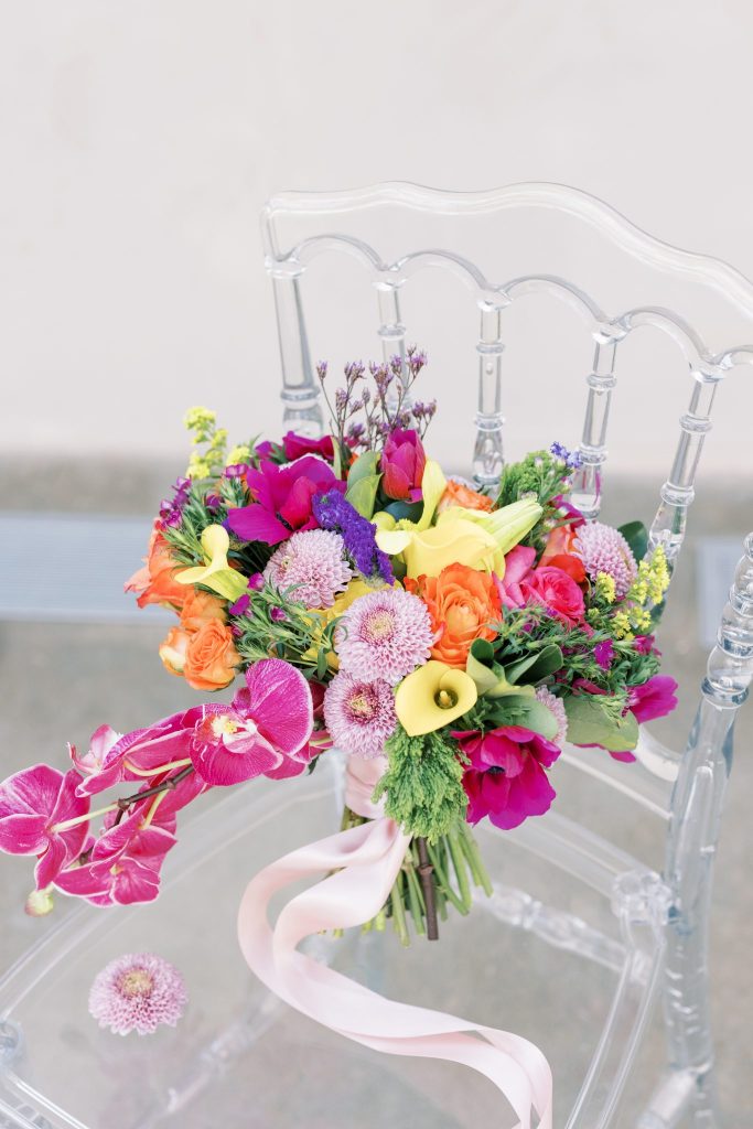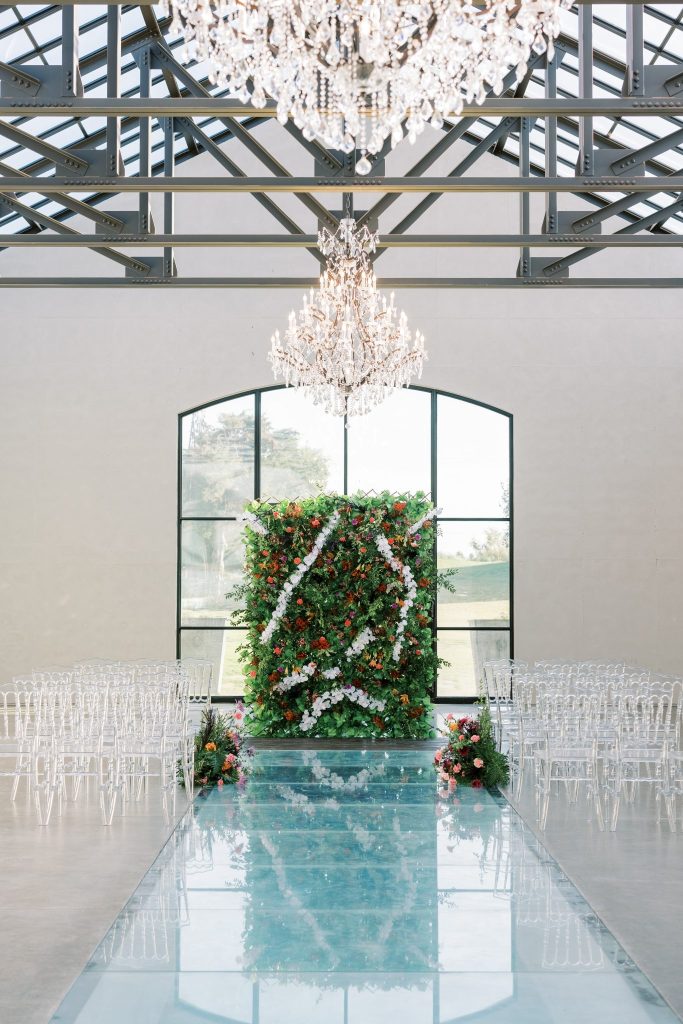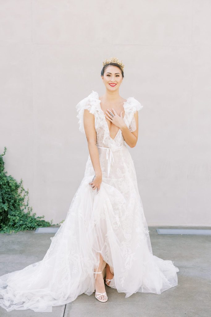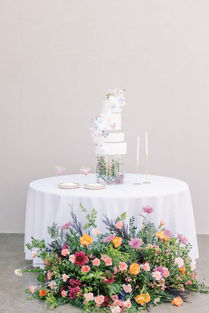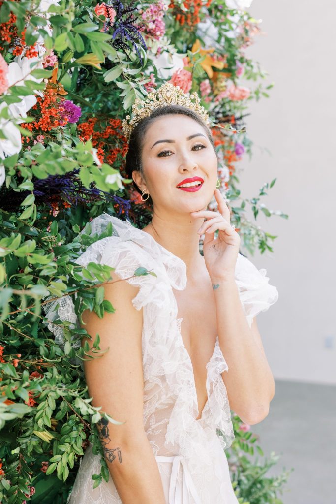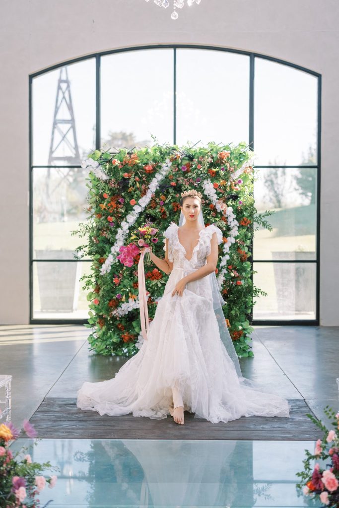 You are cordially invited to Singapore’s wedding of the year with this vibrant and whimsical garden editorial inspired by the modern love story Crazy Rich Asians. The over-the-top wedding of Nick Young’s best friends Araminta and Colin is a botanical dreamscape full of luscious florals and butterfly accents. Our editorial adaptation of the film’s notorious wedding scene is a vibrant and whimsical garden soirée that even Nick’s Ah Ma (grandmother) would approve of. Captured at The Baumberhof, their glass top aisle nearly mirrors Araminta’s iconic water-run walkway. A floral wall from Forever Borrowed with bright blooming buds and dripping orchid blooms served as the ceremony focal point. As most of you know the film, Crazy Rich Asians is all about high fashion, so of course, we showcased a show-stopping dress. The bride wore a ruffled deep-V Monique Lhuillier gown with a gorgeous tiara fit for a princess from J.J. Kelly Bridal Salon. We can just picture Nick Young’s fashionista cousin Astrid wishing to have that dress and tiara as her own. M Salon accented the dazzling tiara with a sleek updo and a bright red lip. The vibrant and whimsical editorial dripped in butterfly accents similar to the movie. Eros Studios created a butterfly-inspired invitation suite, menu, and place cards, while Amy Cakes displayed cascading butterflies down her cake. Finally, the ever-so-talented Andi Bravo Photography captured gorgeous images with her fine art photography. We like to think that Eleanor Young would give us her emerald engagement ring as a sign of approval for all the loveliness captured by Andi Bravo Photography. If you can’t get enough of this vibrant and whimsical garden editorial, we have great news for you! Keep scrolling to see the editorial in a different view with a beautiful film by Andi Bravo Photography. Cheers!