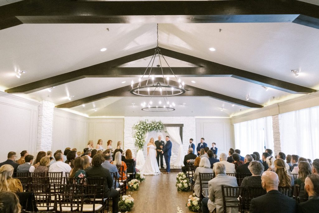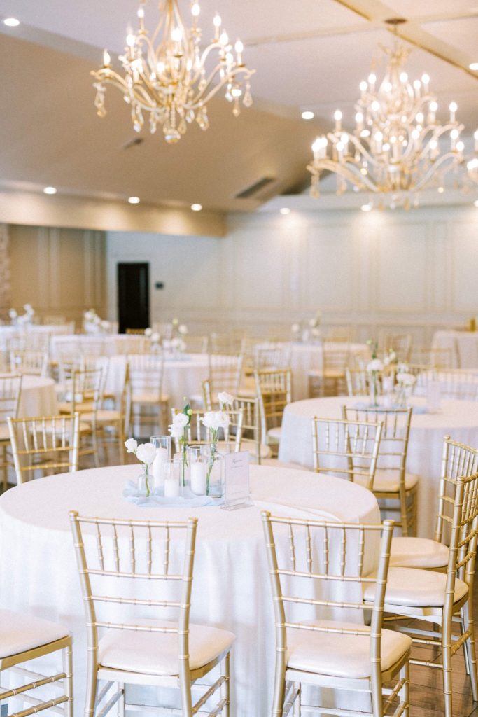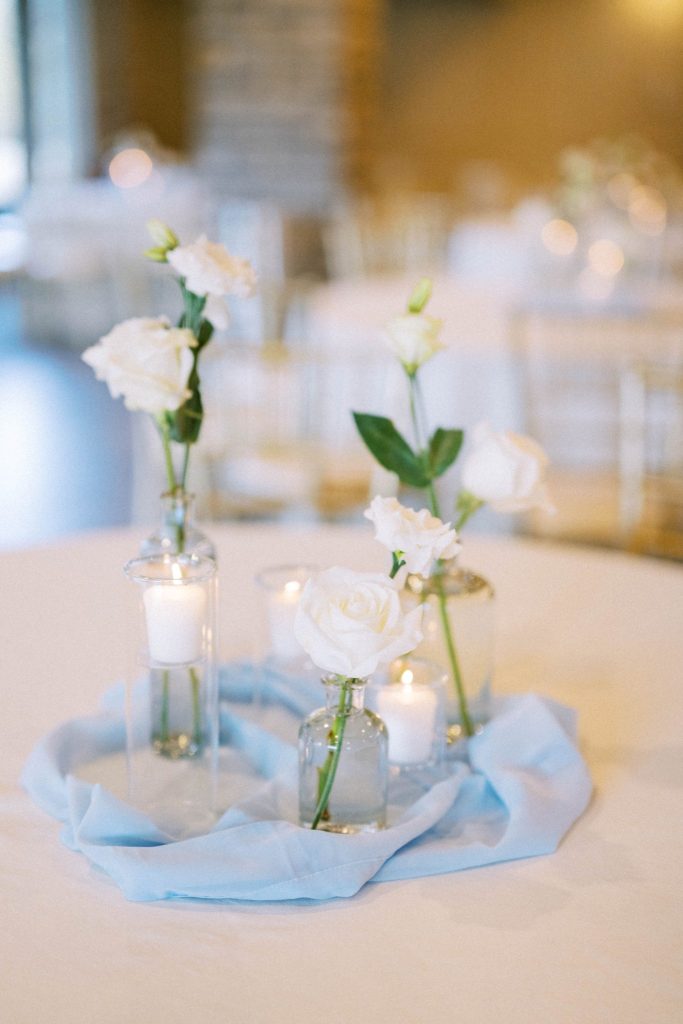 The Stephens wedding aesthetic was classy and graceful with a light modern touch. Serene shades of blue accompanied by fresh white linens and floral gave the reception space at Coles Garden Wedding and Event Center a peaceful, airy vibe. We loved every detail!