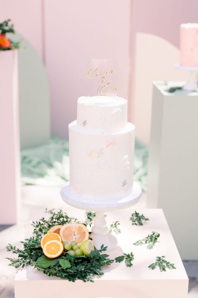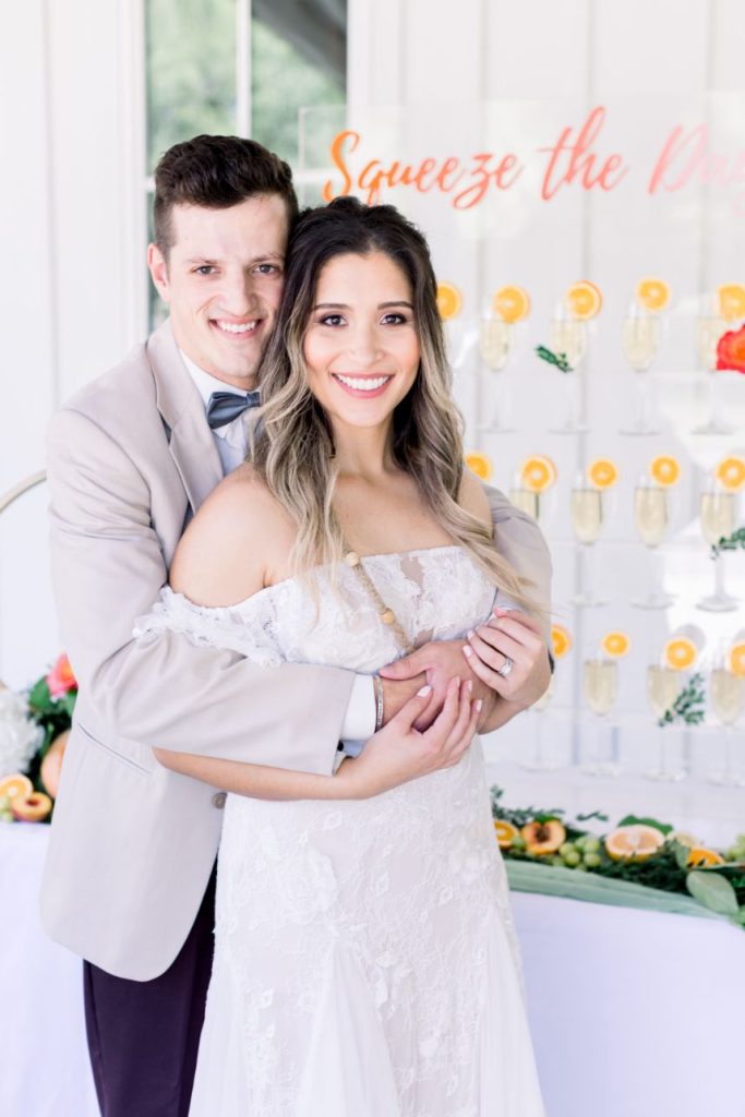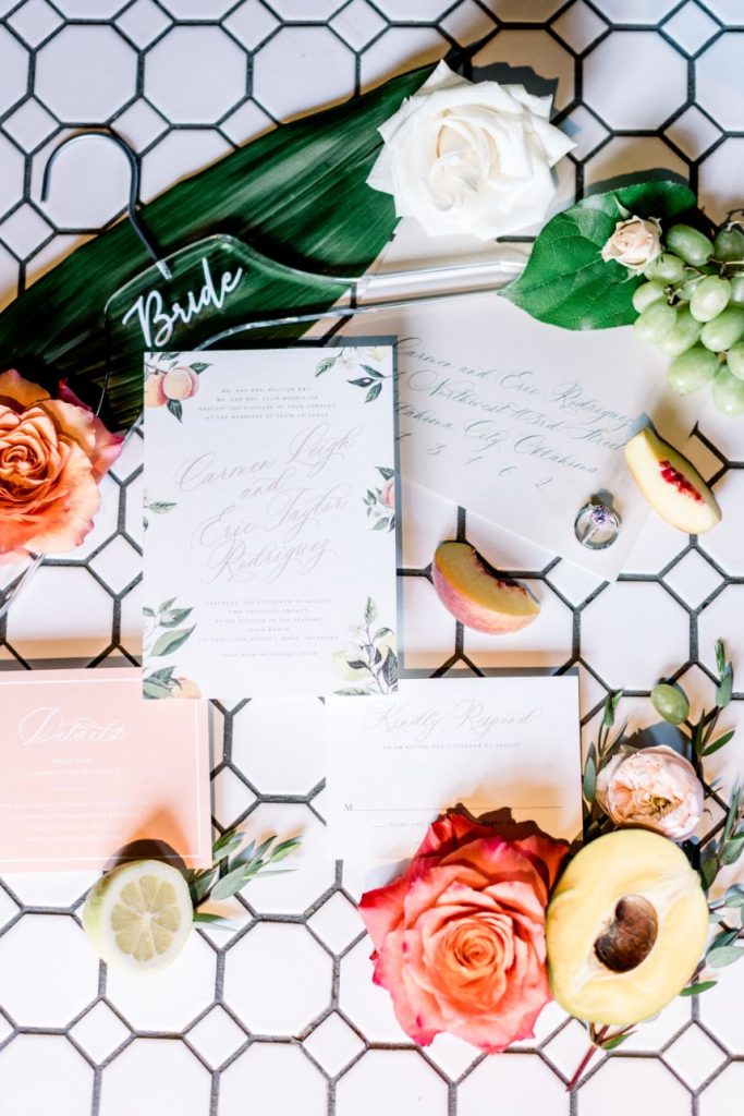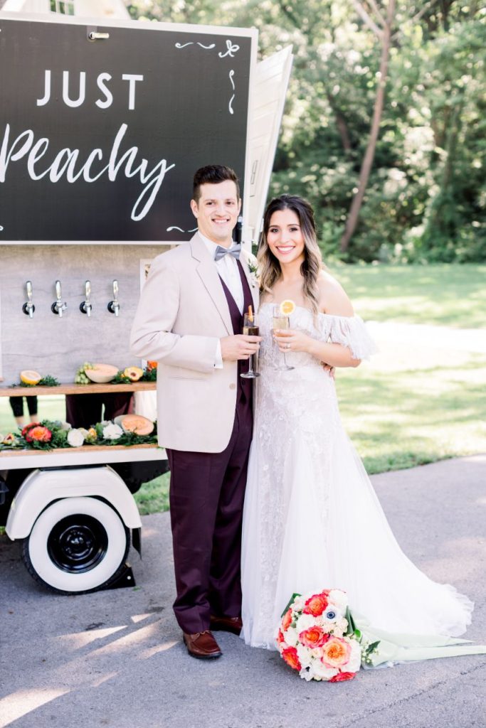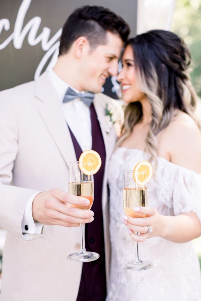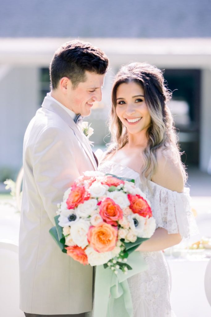 This inspiration shoot serves as the perfect inspo for any bride planning a Spain Ranch wedding – especially in warmer months! The talented Ashton Marie Photography captured these bright and fruit-filled wedding scenes around the gorgeous venue’s sprawling 44-acre ranch that Amy Lee Illustration brings to life through expert artistry – book her on-site live sketching services at weddings for a unique addition to any reception or cocktail hour! These models are a real couple, and though this ceremony was styled, the bride still radiates from the inside out, with her natural beauty enhanced with peachy wedding glam and a killer smoked out brown wing by MLB Artistry. Her off-the-shoulder gown is so romantic and pairs perfectly with her wavy hair’s half-up style. These two lovebirds clink glasses to the start of their forever with a little help from the vintage Piaggio Ape that serves as the mobile prosecco bar known as Bubbles and Brews. Cutting into a cake as pretty as this modern beauty by Allie’s Baking Boutique should be a crime, and the cherry on top of this two-tiered design is its adorable acrylic signage with the bride and groom’s name in gilded script. A lovely outdoor tablescape lined with bright white and pale pink linens from Party Pro Rents feel so warm and springy, and we love these elegant all-white King Louis chairs from their vast collection of rentals as well! There is nothing sweeter than the pale palette or peachy goodness of this Spain Ranch wedding inspiration! Read on for a note from the photographer about the shoot. Cheers!