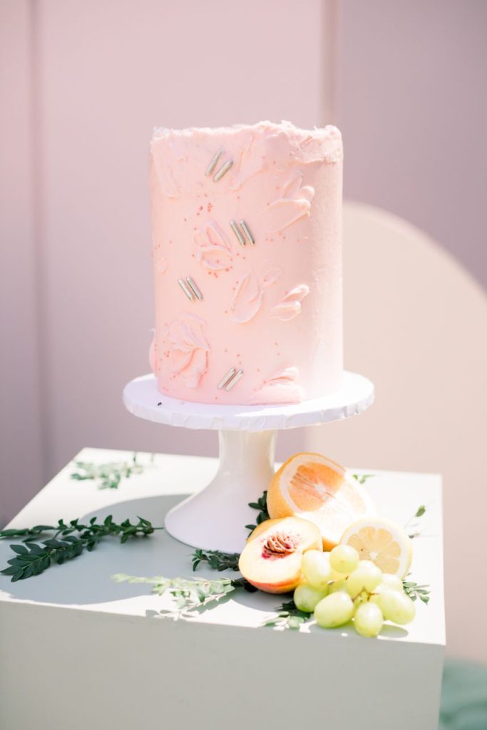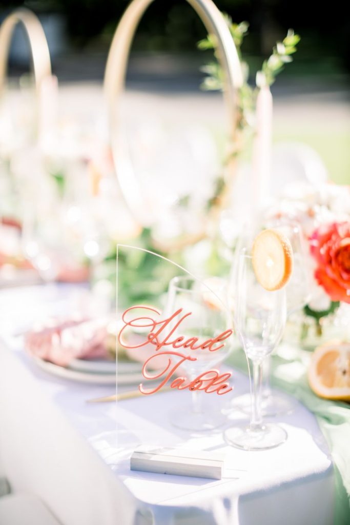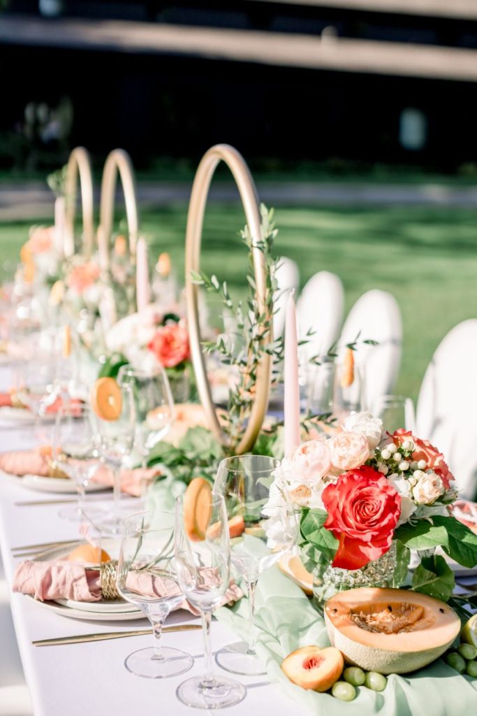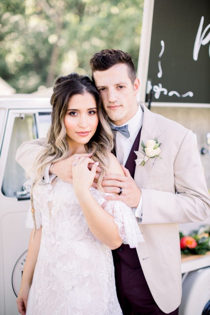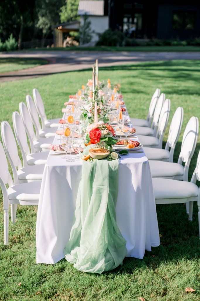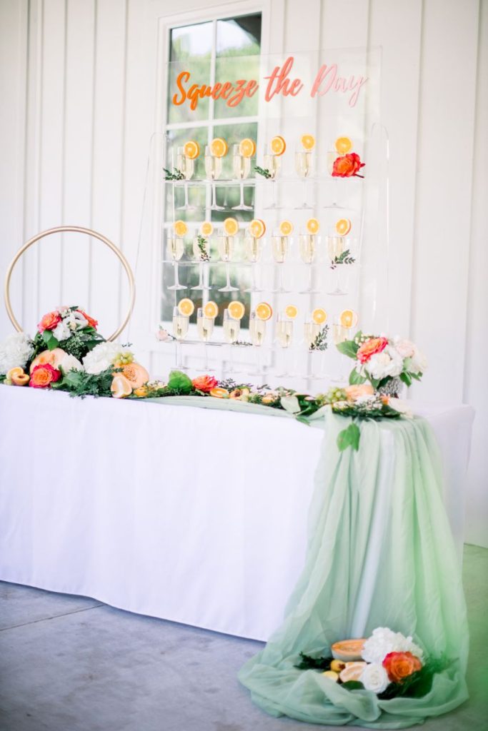 This inspiration shoot serves as the perfect inspo for any bride planning a Spain Ranch wedding – especially in warmer months! The talented Ashton Marie Photography captured these bright and fruit-filled wedding scenes around the gorgeous venue’s sprawling 44-acre ranch that Amy Lee Illustration brings to life through expert artistry – book her on-site live sketching services at weddings for a unique addition to any reception or cocktail hour! These models are a real couple, and though this ceremony was styled, the bride still radiates from the inside out, with her natural beauty enhanced with peachy wedding glam and a killer smoked out brown wing by MLB Artistry. Her off-the-shoulder gown is so romantic and pairs perfectly with her wavy hair’s half-up style. These two lovebirds clink glasses to the start of their forever with a little help from the vintage Piaggio Ape that serves as the mobile prosecco bar known as Bubbles and Brews. Cutting into a cake as pretty as this modern beauty by Allie’s Baking Boutique should be a crime, and the cherry on top of this two-tiered design is its adorable acrylic signage with the bride and groom’s name in gilded script. A lovely outdoor tablescape lined with bright white and pale pink linens from Party Pro Rents feel so warm and springy, and we love these elegant all-white King Louis chairs from their vast collection of rentals as well! There is nothing sweeter than the pale palette or peachy goodness of this Spain Ranch wedding inspiration! Read on for a note from the photographer about the shoot. Cheers!