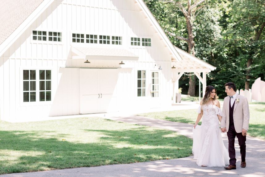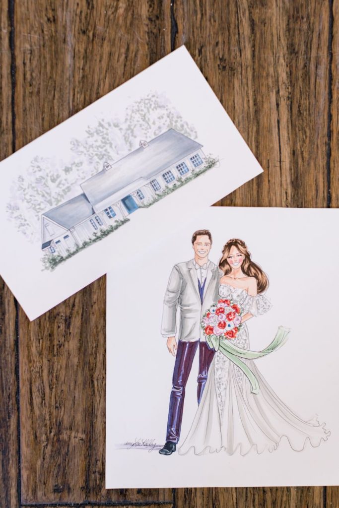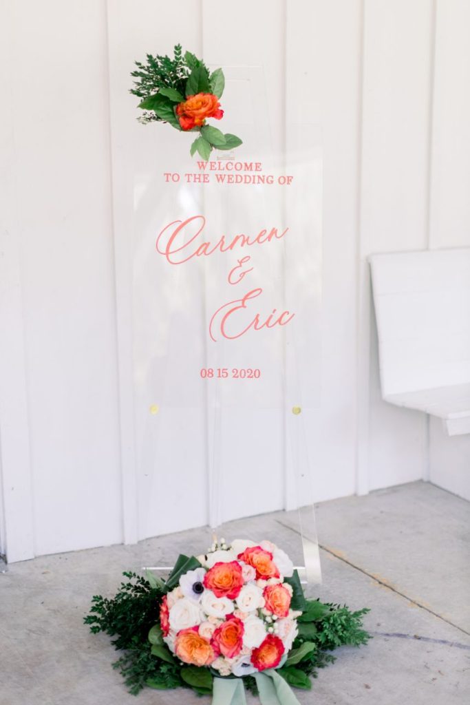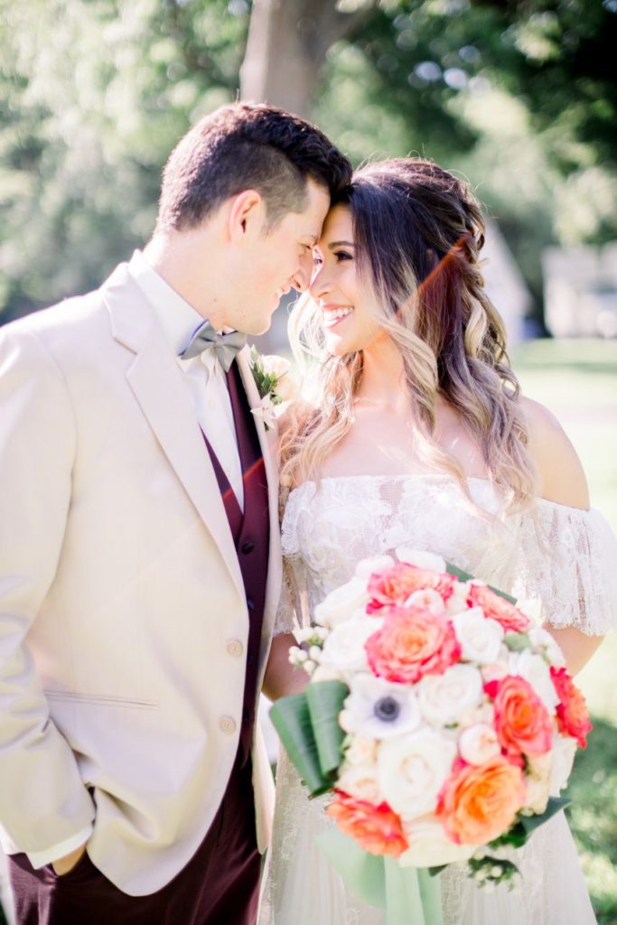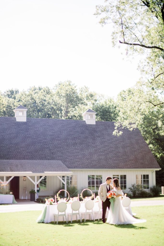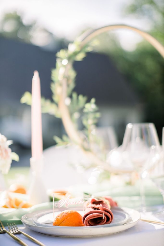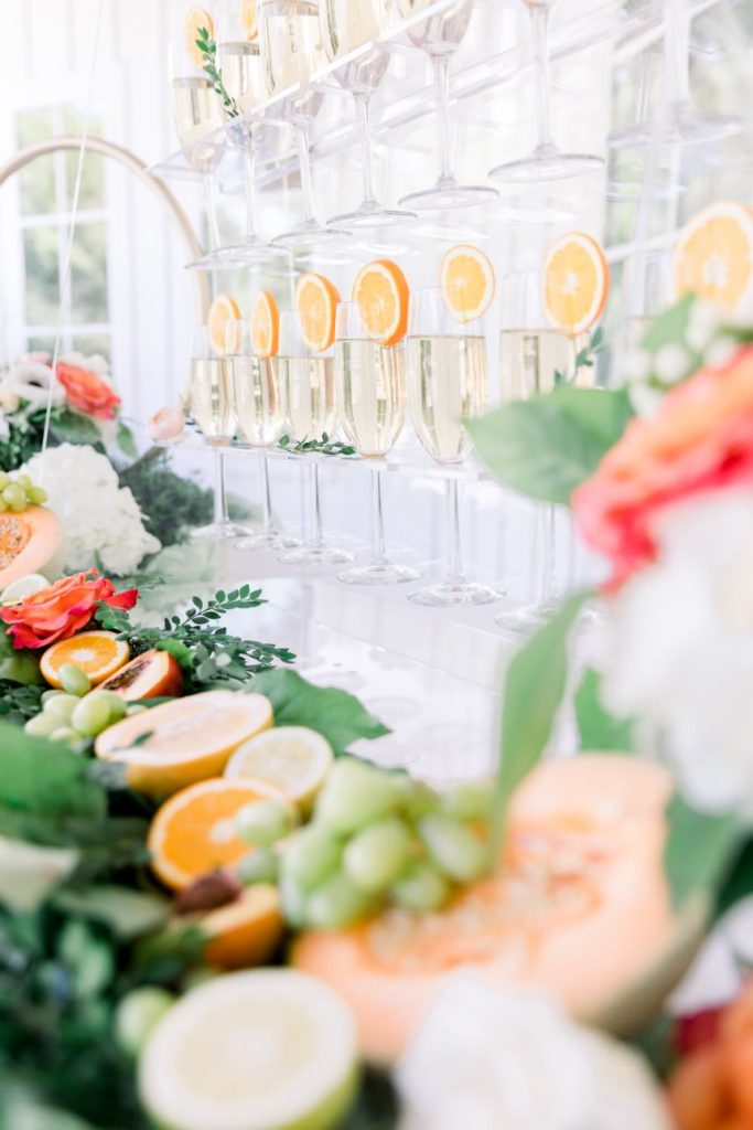 This inspiration shoot serves as the perfect inspo for any bride planning a Spain Ranch wedding – especially in warmer months! The talented Ashton Marie Photography captured these bright and fruit-filled wedding scenes around the gorgeous venue’s sprawling 44-acre ranch that Amy Lee Illustration brings to life through expert artistry – book her on-site live sketching services at weddings for a unique addition to any reception or cocktail hour! These models are a real couple, and though this ceremony was styled, the bride still radiates from the inside out, with her natural beauty enhanced with peachy wedding glam and a killer smoked out brown wing by MLB Artistry. Her off-the-shoulder gown is so romantic and pairs perfectly with her wavy hair’s half-up style. These two lovebirds clink glasses to the start of their forever with a little help from the vintage Piaggio Ape that serves as the mobile prosecco bar known as Bubbles and Brews. Cutting into a cake as pretty as this modern beauty by Allie’s Baking Boutique should be a crime, and the cherry on top of this two-tiered design is its adorable acrylic signage with the bride and groom’s name in gilded script. A lovely outdoor tablescape lined with bright white and pale pink linens from Party Pro Rents feel so warm and springy, and we love these elegant all-white King Louis chairs from their vast collection of rentals as well! There is nothing sweeter than the pale palette or peachy goodness of this Spain Ranch wedding inspiration! Read on for a note from the photographer about the shoot. Cheers!