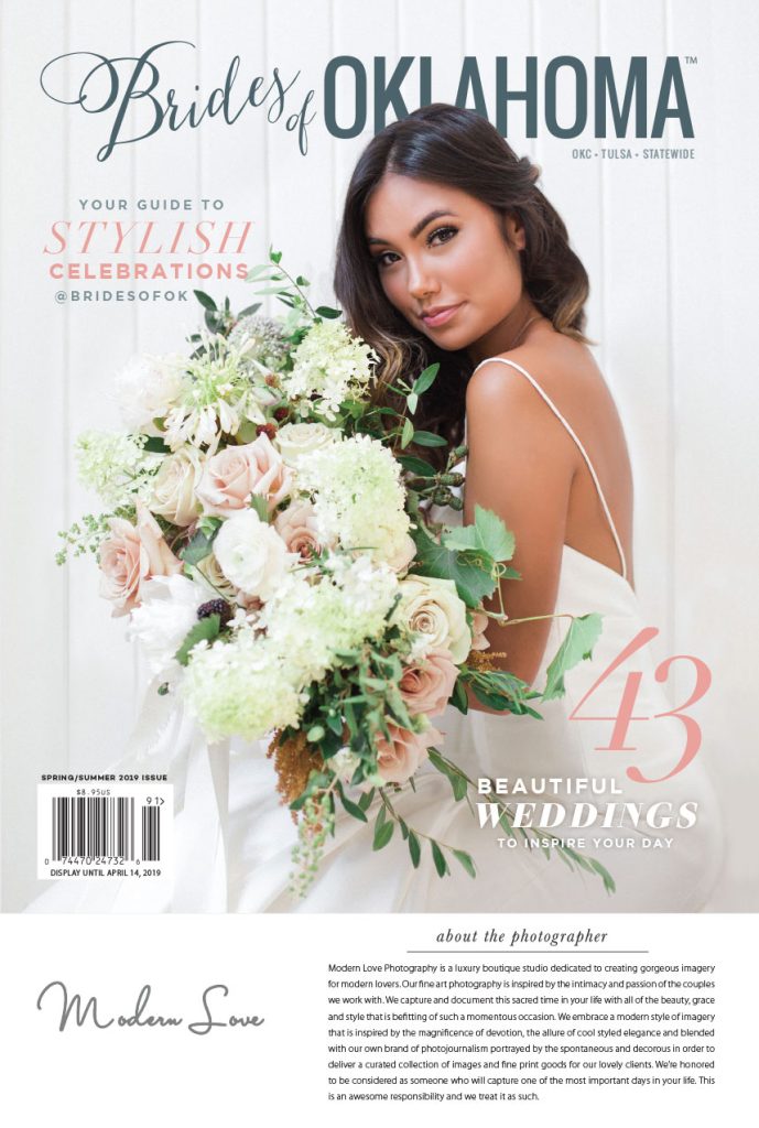 It feels as if we’ve been waiting forever to share with you all, but at last, we’re unveiling the Brides of Oklahoma magazine Spring/Summer 2019 cover image captured by Modern Love Photography! Hooray! Inspired by Meghan Markle’s minimalist gowns from the #RoyalWedding, it’s no surprise we were head-over-heals for this image from our Luxe Love fashion editorial captured at Festivities Event Center. Featuring the gorgeous fit-and-flair Wtoo by Watters Mikado gown from The Bridal Boutique, the model bride was luminous wearing cascading, loose curls paired with a soft smokey eye and nude lip by Brushed Salon and Makeup Studio. Her look was finished with a romantic, garden style bouquet from Poppy’s Garden and fine jewelry from BC Clark Jewelers. Congrats to Modern Love Photography for snagging her first Brides of Oklahoma cover! Does it get any prettier?!