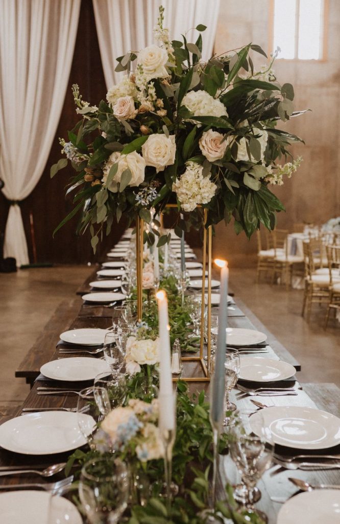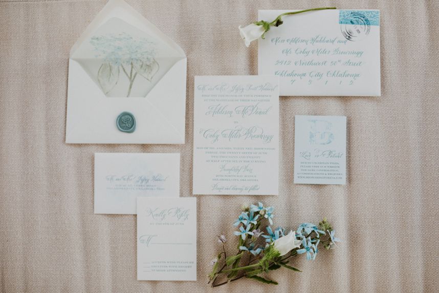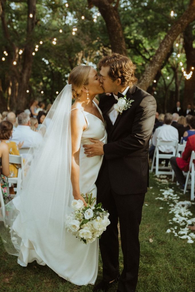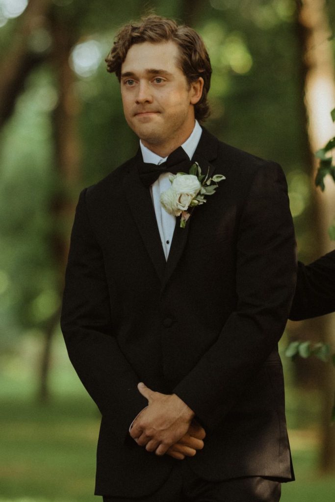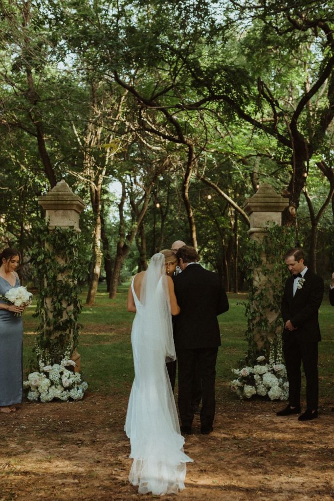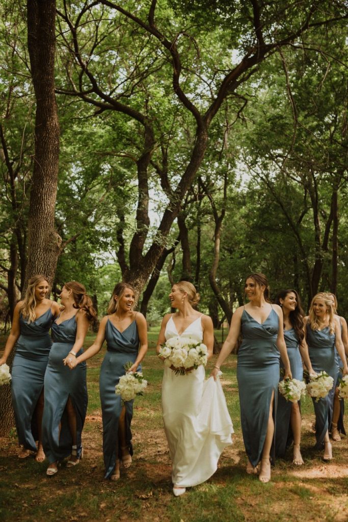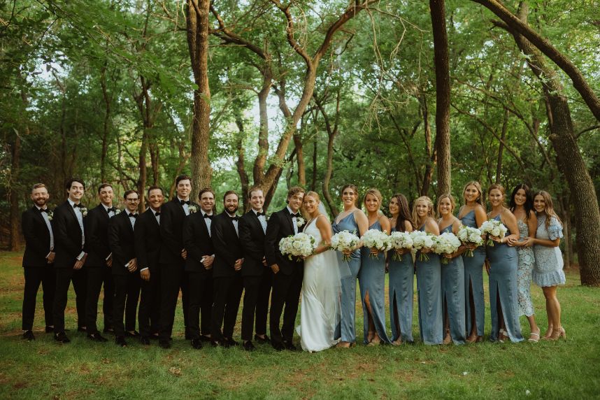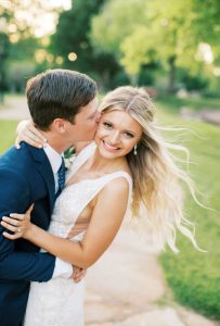 Addison and Cody held a stunning spring outdoor wedding in The Baumberhof Forest. Guests sat in elegant white seating while party-lit trees and white rose petals set the scene for the couple’s romantic walk down the aisle. Beside the bride and groom stood an altar with pops of peonies and integral ivy. The bridesmaids wore classic dusty blue dresses, adding a refreshing burst of color to all the organic elements. Addison brought all the minimalist magic in her sweet satin V-neck gown and dangling pearl earrings from J.J. Kelly Bridal Salon. She pulled off a timeless Sadie Robertson vibe with her hair in a luscious low bun! After the couple said “I do” and celebrated with a jazz band’s arrival, the party headed to The Baumberhof’s rustic barn for a romantic reception. Light blue and pink floral arrangements and tall wicking candles were at the center of everyone’s attention (and each tabletop!). All the ballroom’s rustic charm and enamored elegance is a nod to the pros at Mood Party Rentals. At the center of their wooden tabletops stood a simplistic yet stunning cake by Amy Cakes that had perfectly planted peonies. Beyond the sweets, of course, everyone was well fed because Abbey Road Catering prepped this party with rehearsal dinner catering. The Renaissance Waterford Oklahoma City ensured that everyone slept well after Addison and Cody’s night-to-remember. Cheers to the happy couple!