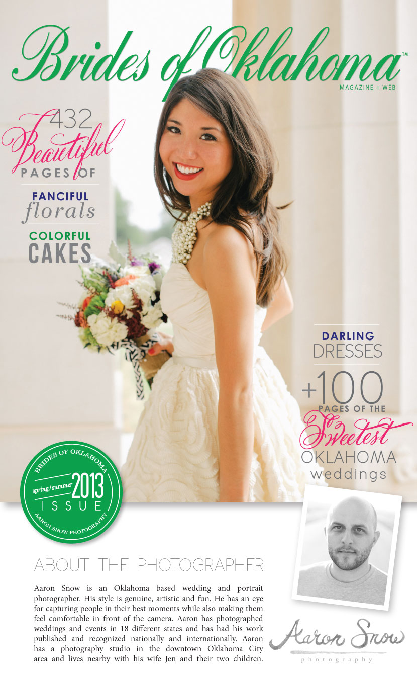 It’s finally here! We are beyond thrilled to reveal the new Spring/Summer 2013 cover bride perfectly captured by Oklahoma wedding photographer Aaron Snow Photography! We poured over so many gorgeous submissions, but kept coming back to this shot of Oklahoma bride Alicia Crawford-Wiley. We just knew she would be perfect for our Spring/Summer issue! Alicia looks oh-so-pretty in her dreamy Amsale bridal gown, and her make-up is flawless thanks to Jennifer McLaughlin Makeup! We also love her fresh summer bouquet from Poppy Lane Design! To see more from Alicia’s beautiful wedding at Gaillardia Country Club perfectly planned with the help of Embellished Weddings, grab a copy of the new issue when it hits newsstands in January. Congrats to Aaron Snow for snagging the cover shot!