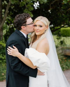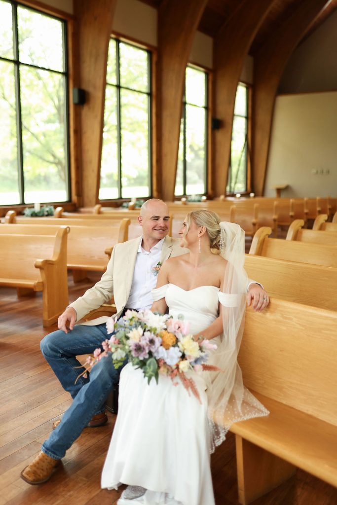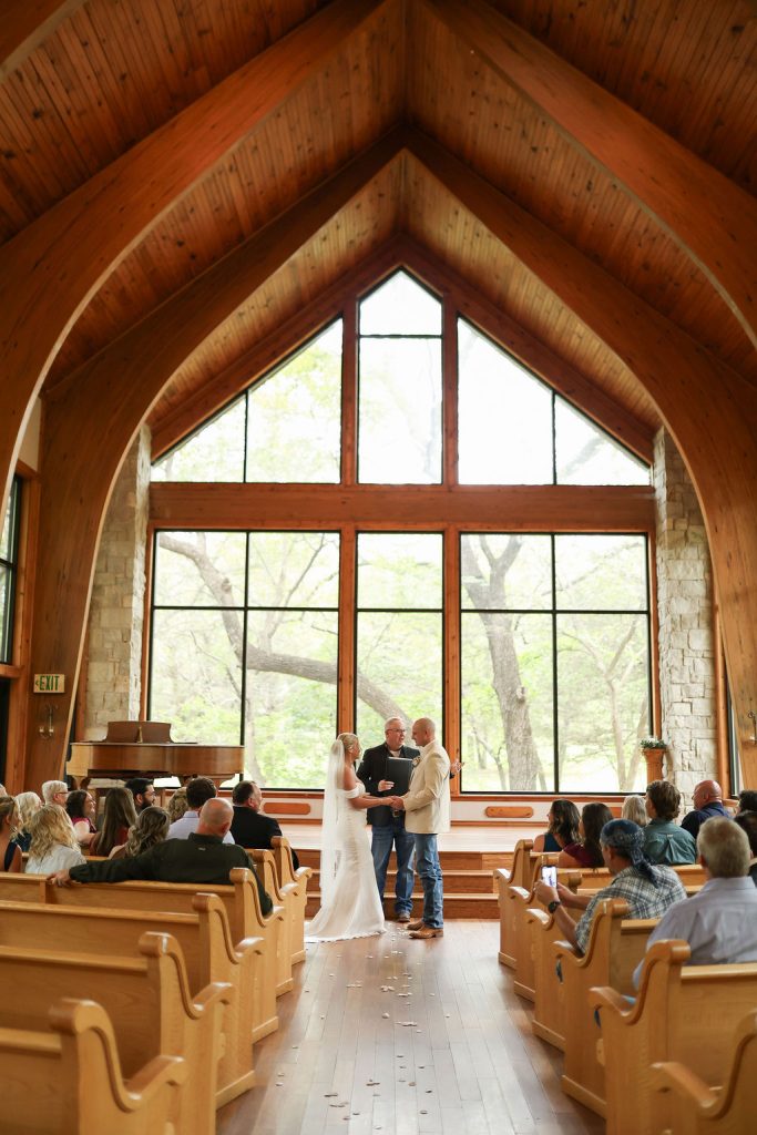 One of Stephanie’s favorite parts of her OKC wedding was the venue itself, the sweet Thunderbird Chapel. “The venue kind of speaks for itself,” she shared. “The glass wall and wooden arches are just stunning!” The chapel was the perfect setting as she and Wyatt began their marriage surrounded by loved ones.