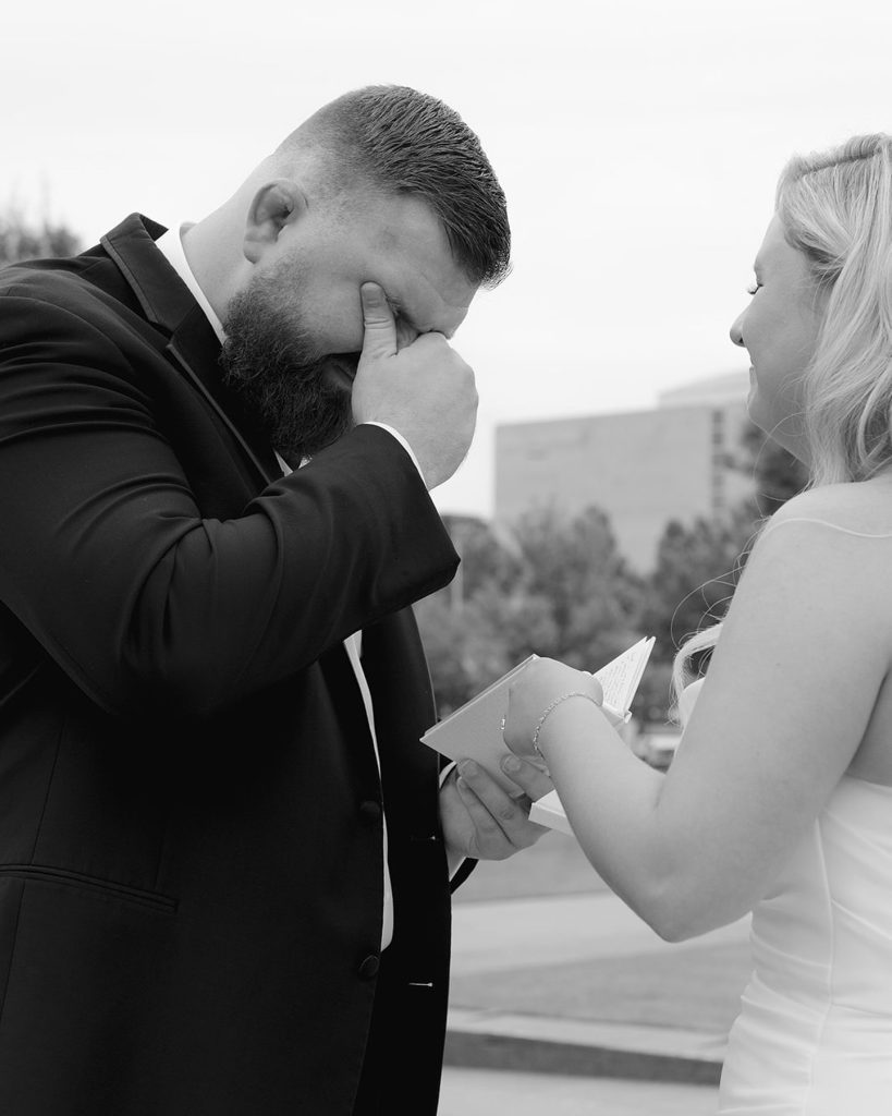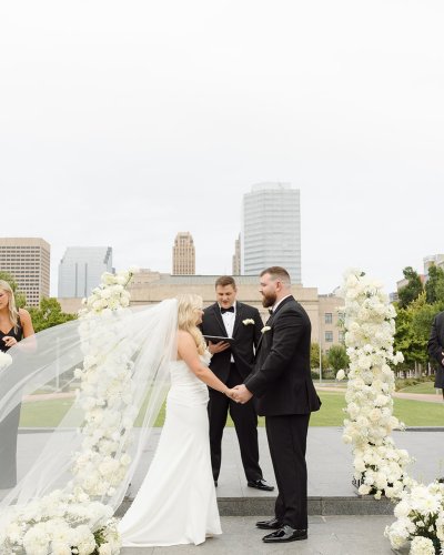 Taylor & Austin’s elegant black-tie wedding in Oklahoma City was a stunning celebration of style and sophistication! Their outdoor ceremony featured beautiful white floral arches that created a romantic backdrop, while the reception showcased timeless black and white details, setting the tone for a chic and memorable evening.