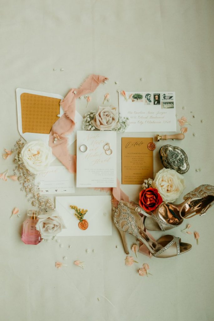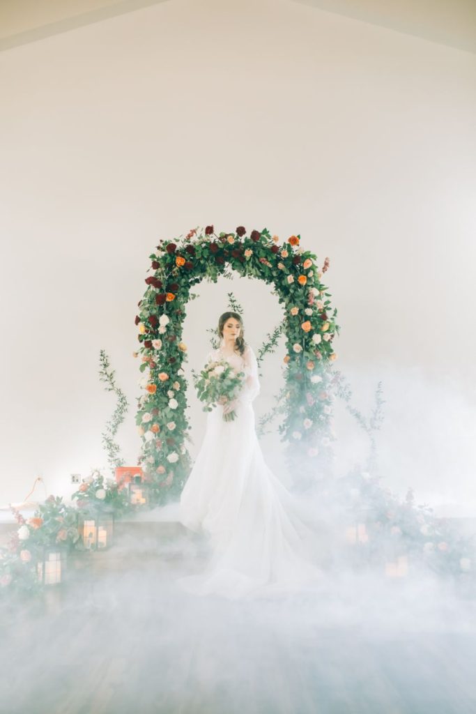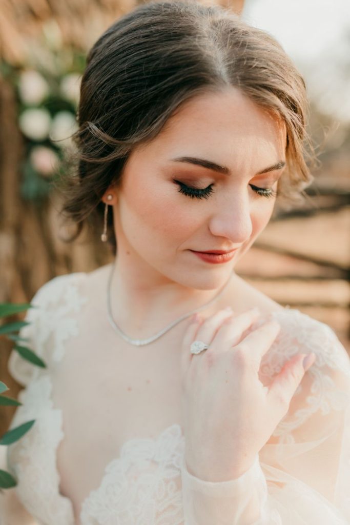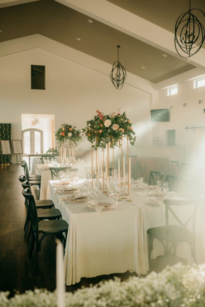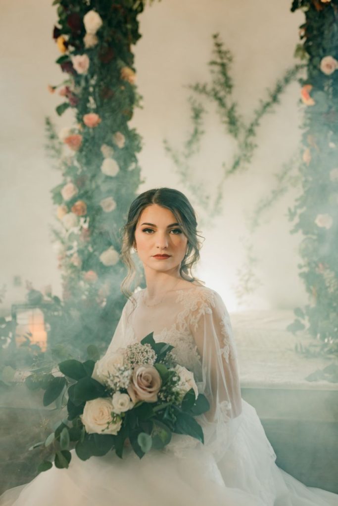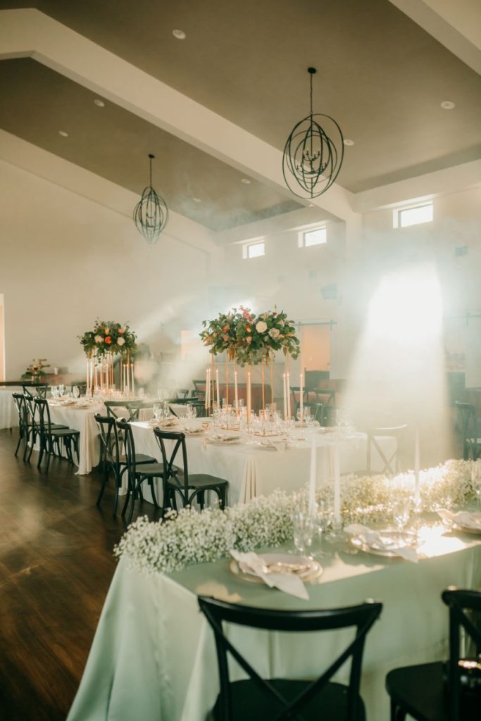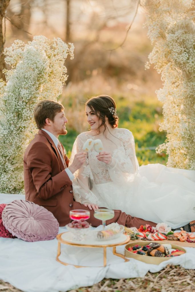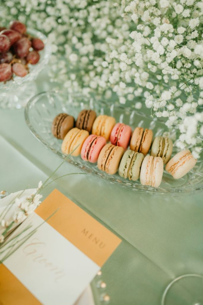 Let’s all take a moment to obsess over this timeless romance wedding inspiration at Sorelle – The Meadow on Deer Creek captured in dappled sunlit shots and smoke-filled scenes! Lavish elements and antiques alike bring all the romance to detail shots of the elegant yet modern invitation suite from The Letter Box and delicate French macarons made by Allie’s Baking Boutique that are the perfect option for high-class sweets that taste just as good as they look. Indoors, tablescapes made by sage green linens and ornate crystal candlestick holders from Marianne’s Rentals scatter romantically throughout the baby’s breath runner by Sorelle‘s on-site floral team that lines these reception tables. This couple is dressed to the nines with our bride model in a sleeved gown and illusion neckline while the groom looks dashing in an umber colored suit from The Wardrobe Modern Menswear while both rocking some of the finest rings from Kelley Jewelers – a striking 4K two-tone gold band for him and for her, a brilliant round center stone surrounded in a halo of beautiful white diamonds, and an starburst of round and baguette diamonds. Their posh picnic is completed with a heavenly asymmetrical arch of baby’s breath, some yummy charcuterie, and of course an artful cake designed by Allie’s Baking Boutique as well. Keep scrolling to see all the dreamy details of this timeless romance wedding inspiration for yourself. Cheers!
