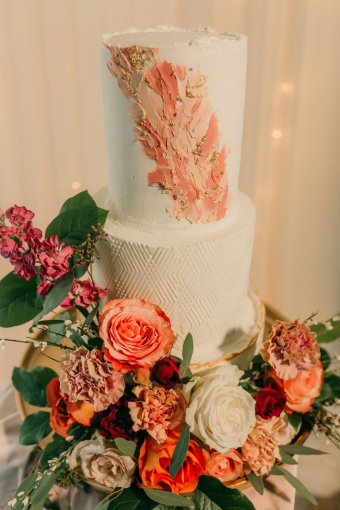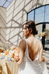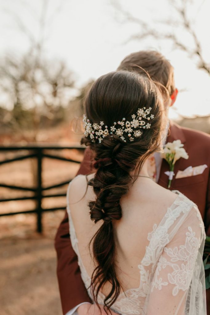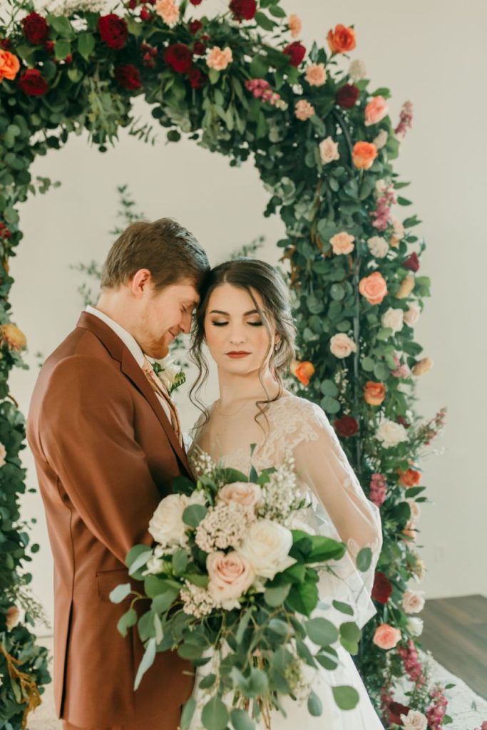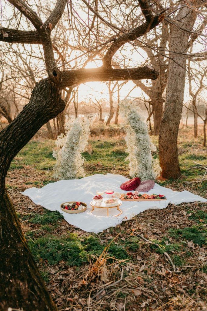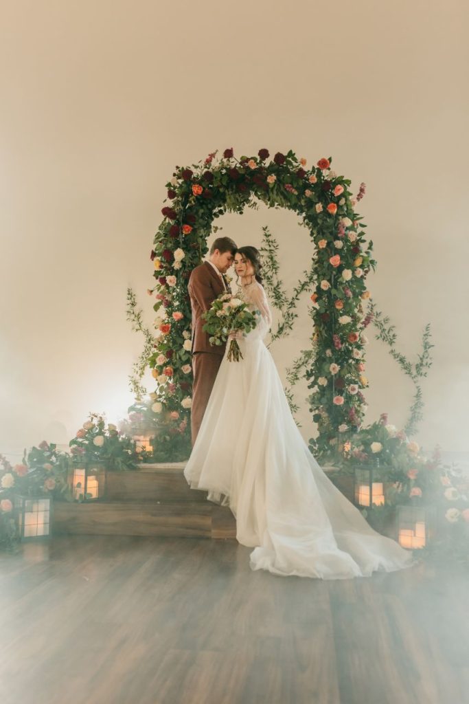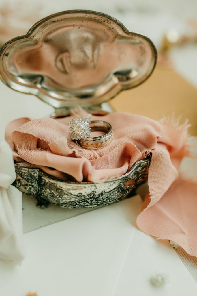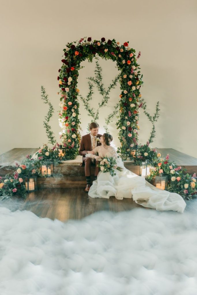 Let’s all take a moment to obsess over this timeless romance wedding inspiration at Sorelle – The Meadow on Deer Creek captured in dappled sunlit shots and smoke-filled scenes! Lavish elements and antiques alike bring all the romance to detail shots of the elegant yet modern invitation suite from The Letter Box and delicate French macarons made by Allie’s Baking Boutique that are the perfect option for high-class sweets that taste just as good as they look. Indoors, tablescapes made by sage green linens and ornate crystal candlestick holders from Marianne’s Rentals scatter romantically throughout the baby’s breath runner by Sorelle‘s on-site floral team that lines these reception tables. This couple is dressed to the nines with our bride model in a sleeved gown and illusion neckline while the groom looks dashing in an umber colored suit from The Wardrobe Modern Menswear while both rocking some of the finest rings from Kelley Jewelers – a striking 4K two-tone gold band for him and for her, a brilliant round center stone surrounded in a halo of beautiful white diamonds, and an starburst of round and baguette diamonds. Their posh picnic is completed with a heavenly asymmetrical arch of baby’s breath, some yummy charcuterie, and of course an artful cake designed by Allie’s Baking Boutique as well. Keep scrolling to see all the dreamy details of this timeless romance wedding inspiration for yourself. Cheers!
