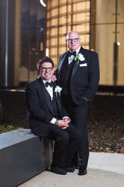 When October 2014 arrived along with the passage of marriage equality, DeWayne and Tony never thought the opportunity to be married would be available to them. Tony asked DeWayne twice to marry him – the first time, DeWayne didn’t say no but, “Not yet.” Celebrating their 11th anniversary of when they first met, Tony asked DeWayne again to marry him and he said, “Yes!” Together, they planned a unique celebration of their love and life together. The date was set for Monday, February 29, 2016 – another Leap Year! The rehearsal dinner was an evening of Old Hollywood Glam, a nod to the night they first met. The wedding turned the Colcord Hotel into an over-the-top tropical paradise. As DeWayne walked down the aisle to the tune of “Like I’m Gonna Lose You,” Tony’s blue eyes welled with tears and DeWayne’s smile still melted Tony’s heart.