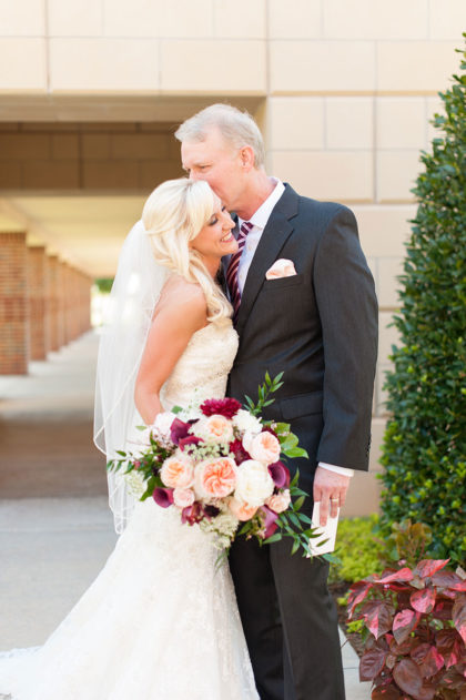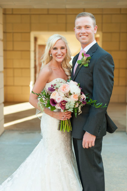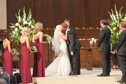 Before they knew it, the big weekend had arrived. The groom’s parents hosted a lovely rehearsal dinner at Quail Creek Golf and Country Club where guests enjoyed dinner, toasts and plenty of celebrating prior to the big day. Nikki and Tyler were married at the Crossings Chapel and their high school youth pastor, Andy Rauschkolb, officiated. The bride was escorted down the aisle by her father in an Allure Couture gown holding a bouquet of Juliet roses, peonies, calla lilies and ranunculus. The elegant ceremony was traditional with 400 guests in attendance.