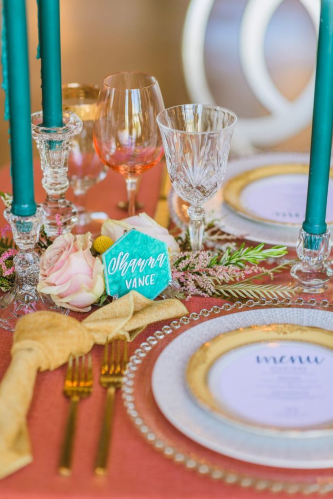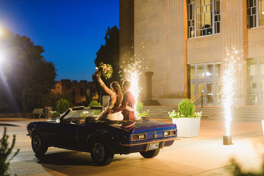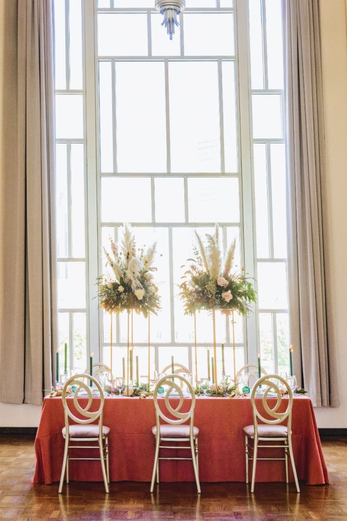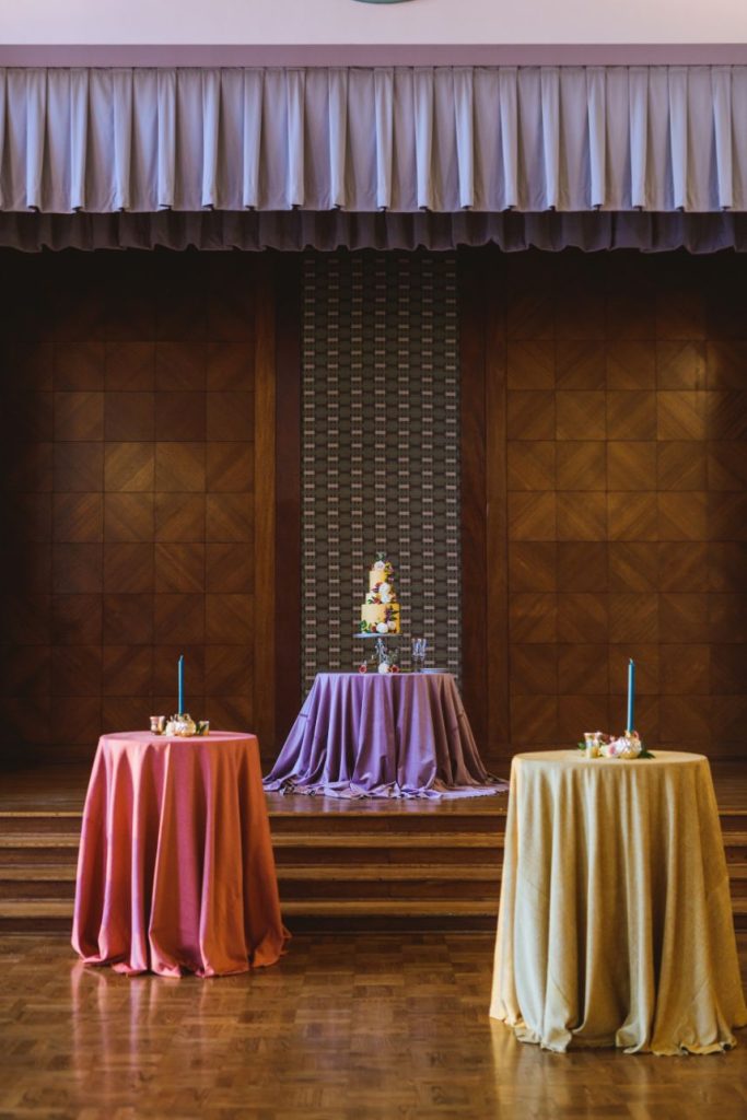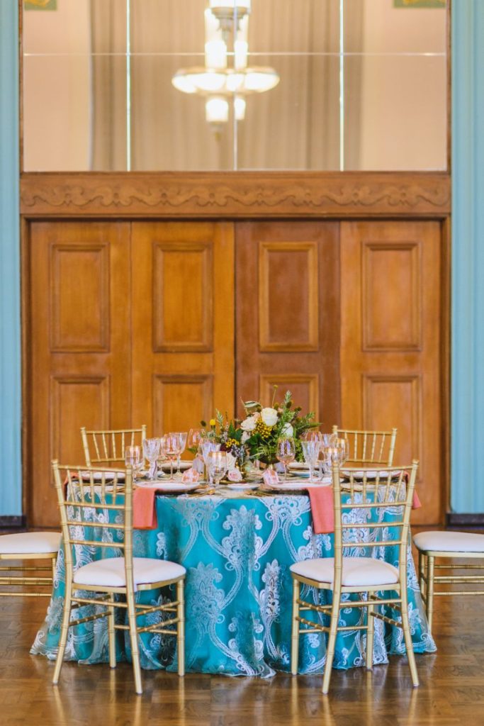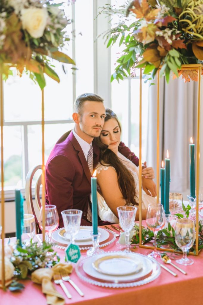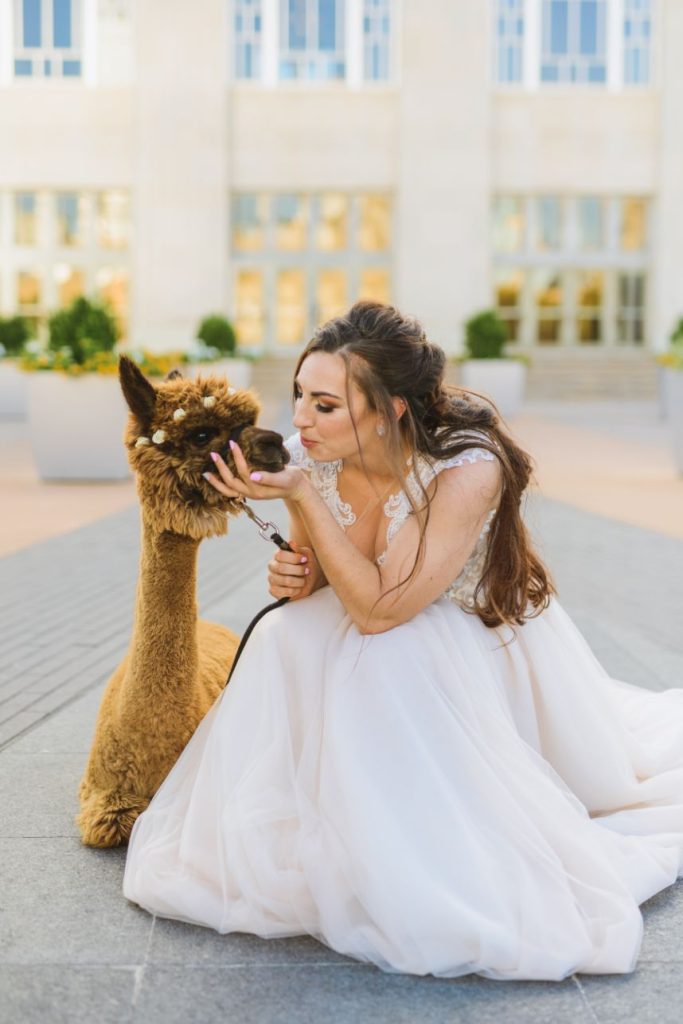 As impactful as it is fun-filled, this styled shoot held at Civic Center Music Hall has the perfect transitional palette and makes for some stunning whimsical wedding inspiration. The talented Ashley Sunderland Photography captured vibrant and colorful yet intimate shots of this sweet couple – him clad in a dapper merlot suit from The Wardrobe Modern Menswear while she dropped jaws in a lace-trimmed and beaded bridal gown from Chantilly with the perfect billowy veil to pair with it. Tablescapes utilized tones of the Caribbean, vivid and juicy alongside muted napkins and elevated blends of dried and fresh floral design. Installations by Trochta’s Flowers and Garden Center covered nearly every available surface indoors and out, where the wild-edged blooms that lined the aisle stole our hearts immediately! The alpacas on site took a liking to the lush ceremony area where they snapped photos with the bride and groom they’re sure to cherish for years to come. Luxe décor from Marianne’s Rentals was around every corner of this soiree assuring you can fill your affair to the brim with gilded touches, all without breaking the bank. A dramatic velvet-lined cake display was the way to go for this bold marigold design by Mishelle Handy Cakes in three decadent tiers adorned with fresh flowers and a few slices of dried citrus. There is whimsical wedding inspiration abound throughout this colorful, citrusy soiree – just add friends and family for even more fun! Keep scrolling to see all the transitional tones for yourself. Cheers!