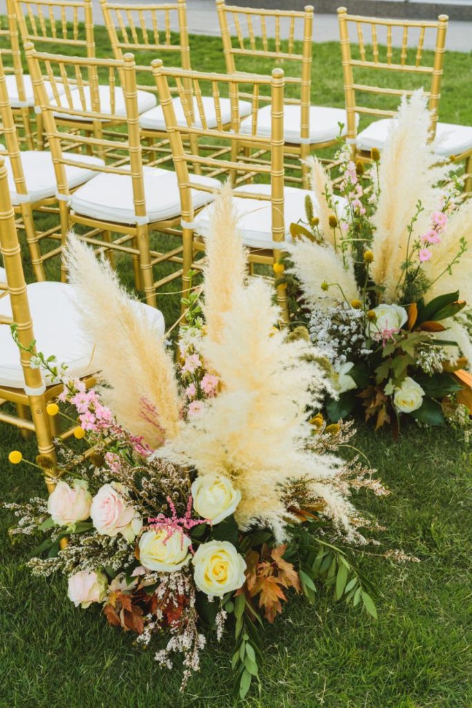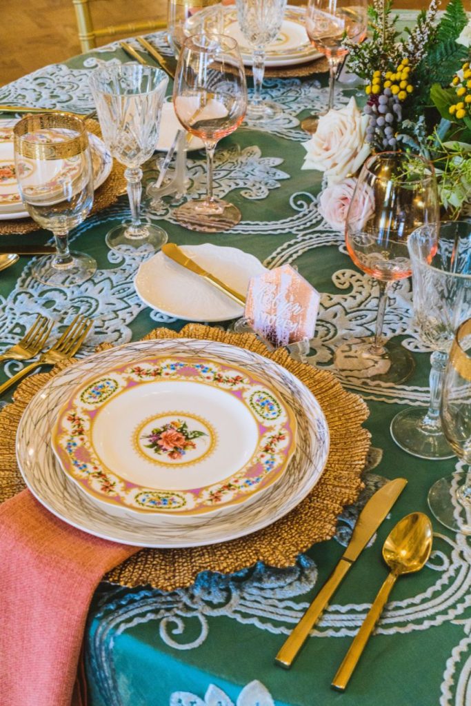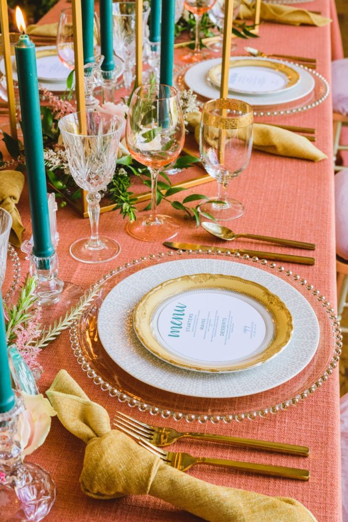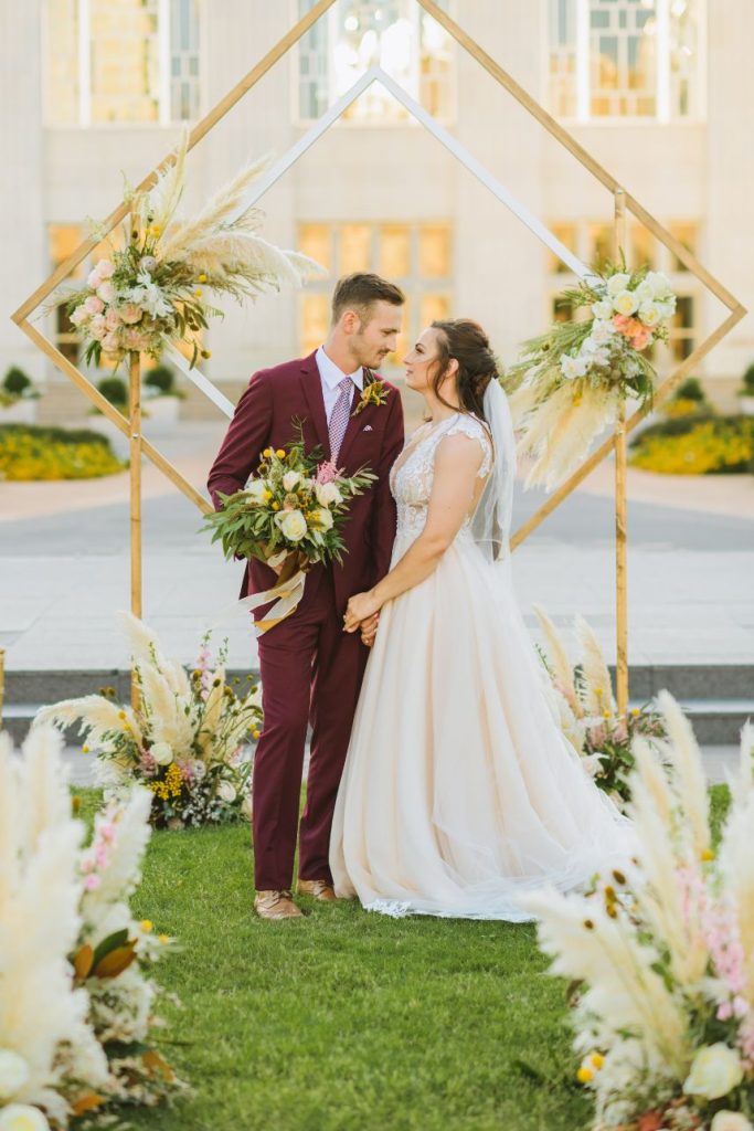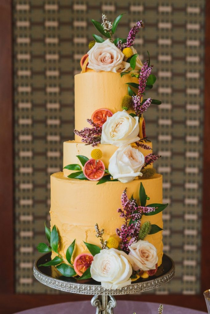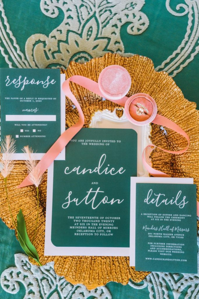 As impactful as it is fun-filled, this styled shoot held at Civic Center Music Hall has the perfect transitional palette and makes for some stunning whimsical wedding inspiration. The talented Ashley Sunderland Photography captured vibrant and colorful yet intimate shots of this sweet couple – him clad in a dapper merlot suit from The Wardrobe Modern Menswear while she dropped jaws in a lace-trimmed and beaded bridal gown from Chantilly with the perfect billowy veil to pair with it. Tablescapes utilized tones of the Caribbean, vivid and juicy alongside muted napkins and elevated blends of dried and fresh floral design. Installations by Trochta’s Flowers and Garden Center covered nearly every available surface indoors and out, where the wild-edged blooms that lined the aisle stole our hearts immediately! The alpacas on site took a liking to the lush ceremony area where they snapped photos with the bride and groom they’re sure to cherish for years to come. Luxe décor from Marianne’s Rentals was around every corner of this soiree assuring you can fill your affair to the brim with gilded touches, all without breaking the bank. A dramatic velvet-lined cake display was the way to go for this bold marigold design by Mishelle Handy Cakes in three decadent tiers adorned with fresh flowers and a few slices of dried citrus. There is whimsical wedding inspiration abound throughout this colorful, citrusy soiree – just add friends and family for even more fun! Keep scrolling to see all the transitional tones for yourself. Cheers!
