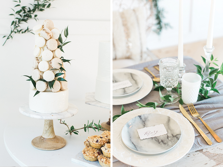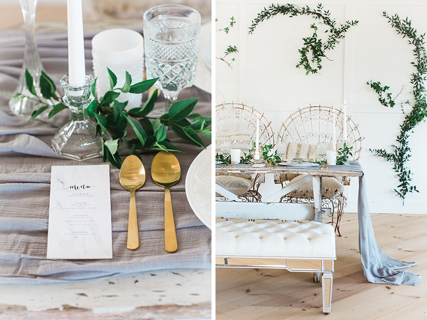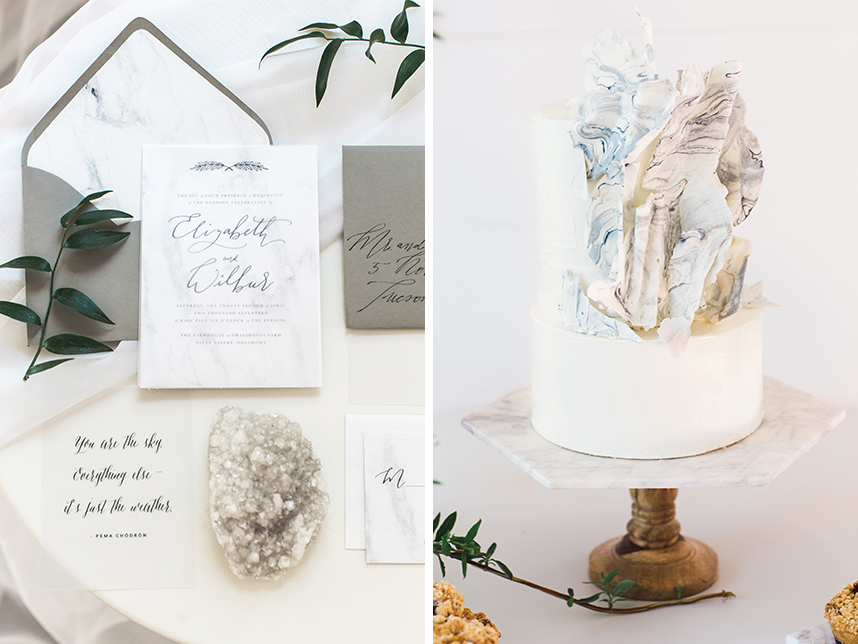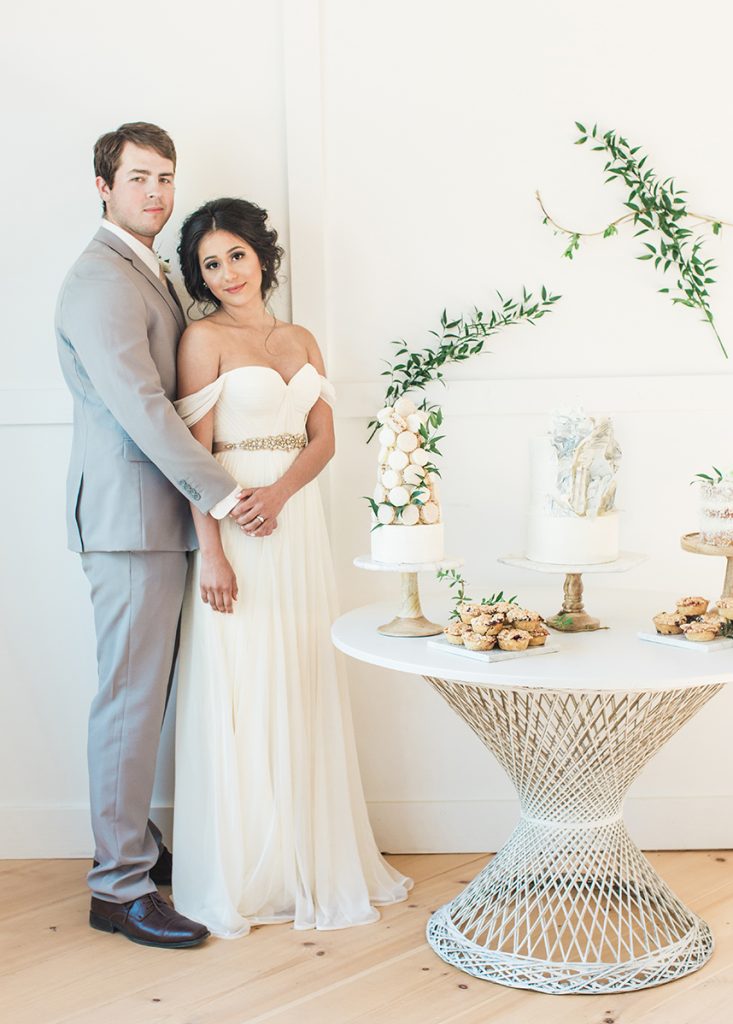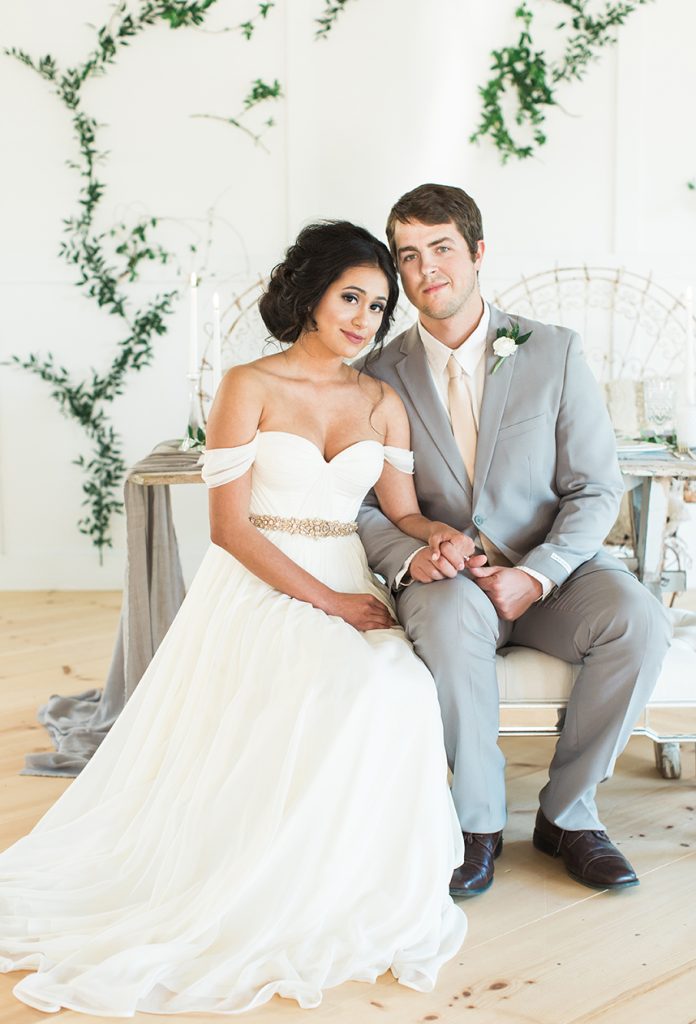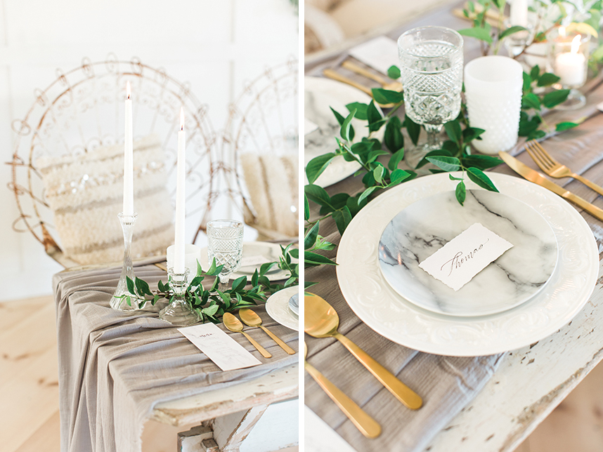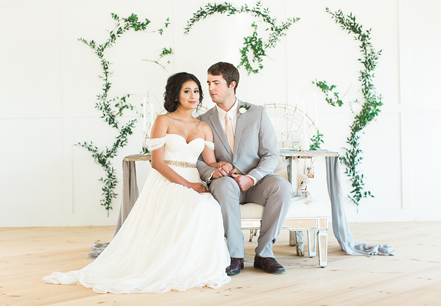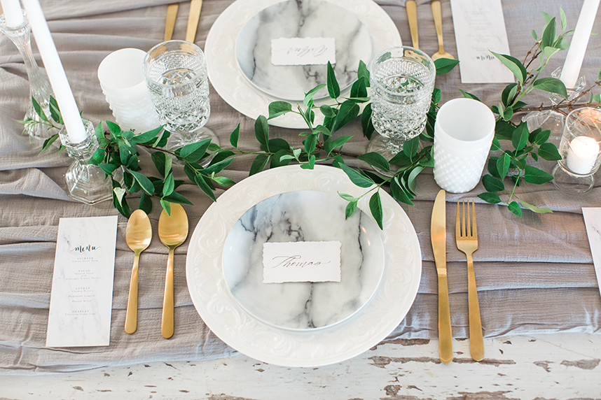For a modern take on the classic greenery color scheme, we’re loving this unique marble element addition to this styled shoot set at Grassroots Vintage Events! Heavily laden with geometric lines and brass and crystal accents, Hope Photography perfectly captured the fresh approach to this trend-filled wedding inspiration in everything from the detailed decor to the eye-catching tablescape. Along with coordinating marble print menus, Laurel & Marie designed a beautiful grey, black and white paper suite in the same printed swirl. An architecturally sculpted cake made to partially resemble a marble block from The Round House Bakery stood as the perfect centerpiece to a table full of treats. But sweeter than the cake was the model bride’s stunning look – a gorgeous off-the-shoulder sweetheart neckline gown from Chantilly Couture with delicate waist embellishments and a full, airy skirt. Her hair and makeup by Brushed Salon were kept simple with a subtle smokey eye, nude lip and loosely swept updo to play off the ease of the shoot. Pin your favorites from this major trend-forward inspiration! Enjoy!