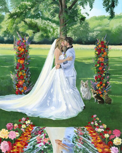 Amy Watson Artistry specializes in creating live wedding paintings that capture romance and timeless elegance. Guests have the chance to watch the magic unfold and may even join Amy in painting, making for a memorable experience in this unique art form. Additionally, Amy offers mini guest portraits that never fail to impress!