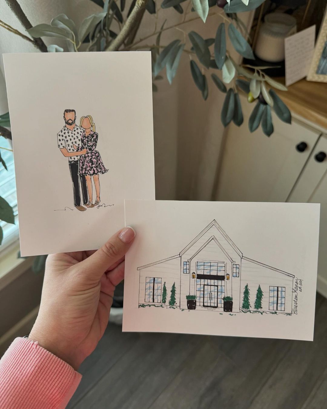 Alexa’s illustrations bring a personal touch to any celebration with her bespoke watercolor portraits. She offers couples the opportunity to commemorate their love stories through personalized save-the-date and invitation art. Her talent for creating custom pieces extends beyond weddings, allowing couples to celebrate their first anniversary with a wedding portrait or cherish their new home with a house portrait.
