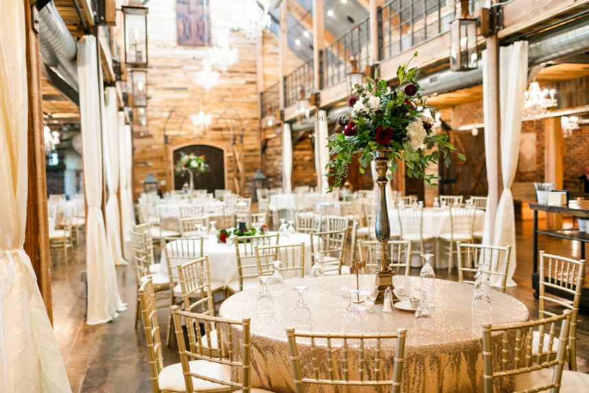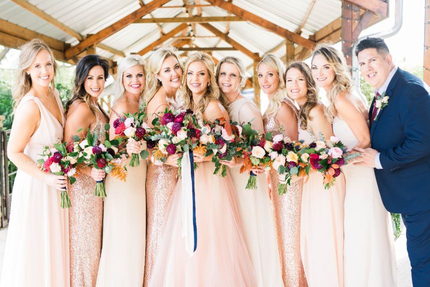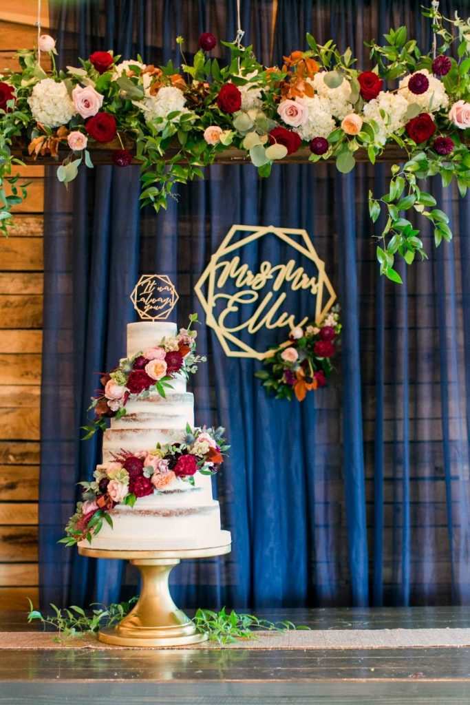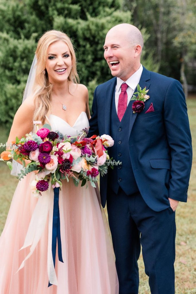 Carrie and Kory’s vibrant fall wedding at Southwind Hills had all the perfect navy and burgundy accents. Vintage winged chairs and banquet style tables from Runaway Belle Vintage Rentals transformed the space into an elegant night to remember. The amazing team at Chantilly Couture has flawlessly styled Carrie in a blush pink tulle gown to walk down the aisle with, and we think she complemented the vivid colors of her decor perfectly.Carrie’s wedding band from Naifeh Fine Jewelry was the perfect final touch to her wedding look. Tablescapes with sequin drapes and gold flatware from Mood Party Rentals, along with blooms in burgundy, blush and navy gave off a fall glam inspired feel. Upon entering the reception, beautiful calligraphy signs by Laurel and Marie adorned the doorways, showing guests toward the festivities ahead. The guests enjoyed the couple’s beautiful three-tiered naked floral cake from the fabulous Amy Cakes while dancing the night away thanks to Box Talent. To kick off the weekend, the couple enjoyed a wonderful steak dinner at Mickey Mantle’s Steakhouse with family as everyone reminisced on the wonderful memories to come. Read on to hear from the bride on how her vendors help her wedding go off without a hitch! Cheers!