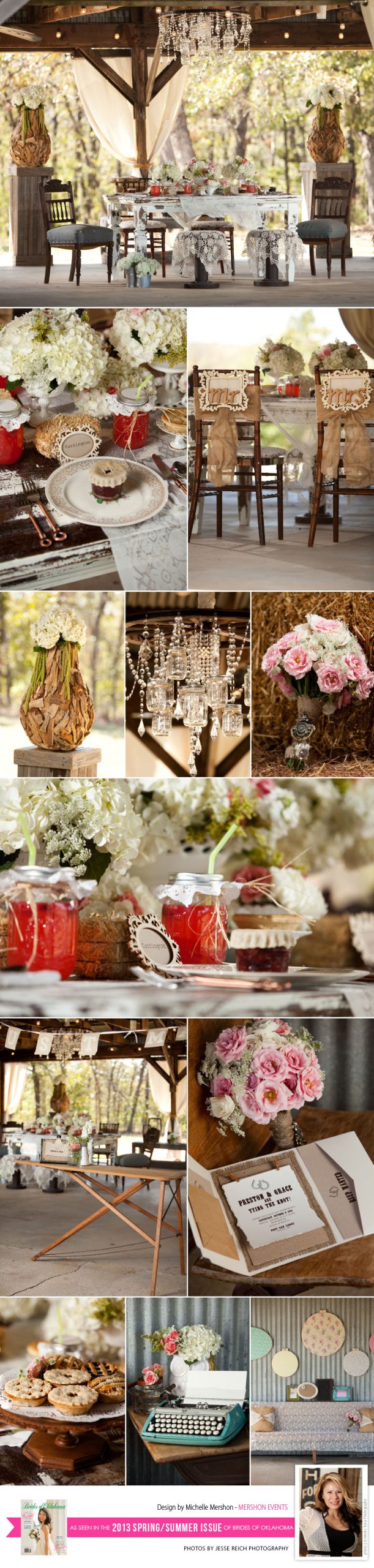 Michelle Mershon of Mershon Events set the scene with the perfect vintage, country tabletop design in the new Spring/Summer issue of Brides of Oklahoma magazine. The shoot, captured by Jesse Reich Photography, took place at Postoak Lodge & Retreat on the edge of Tulsa, and the design was full of rustic décor, lace, mason jars and burlap in neutrals tones with pops of pink and turquoise accents. The shabby chic table and chairs from Party Perfect Linens created a lovely backdrop for the vintage décor, including darling china, also from Party Perfect Linens. The delicate floral centerpieces of white hydrangeas and pink roses, as well as, the baby’s breath and rose bouquet were created by Mershon Events, as well as the western style invites, delicious looking mini-pies, and adorable jam favors. Some of our favorite details are the burlap wrapped chairs reading “Mr” and “Mrs” and the wagon wheel chandelier (although there are so many fabulous details to choose from). Keep an eye out for more inspiring tabletops from the new issue! Enjoy!