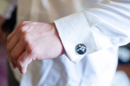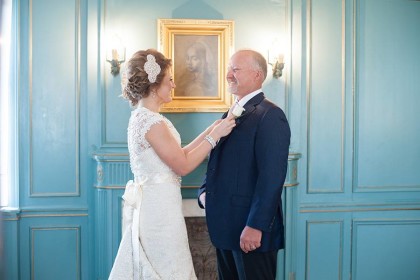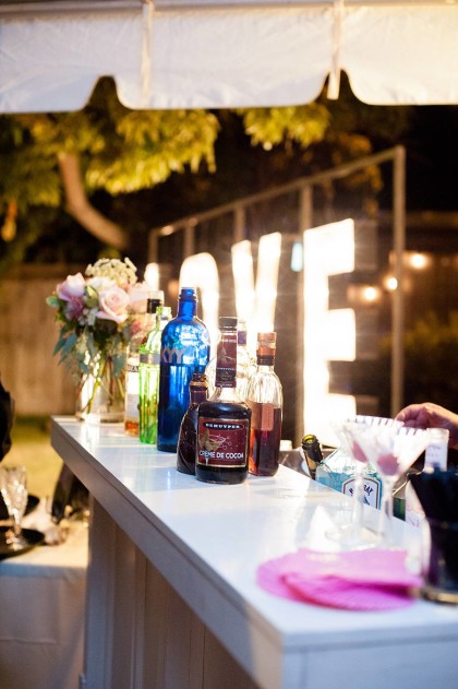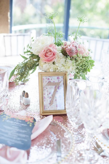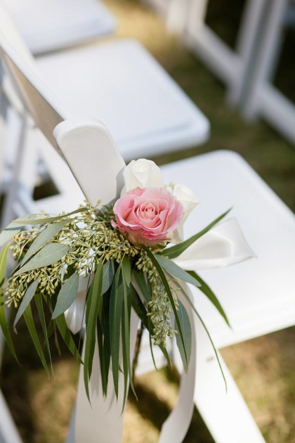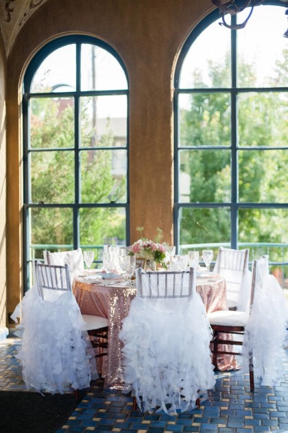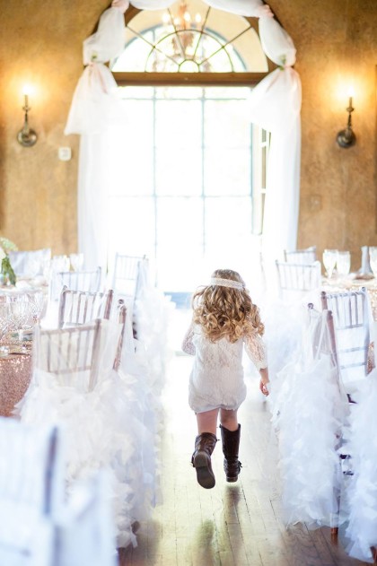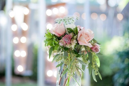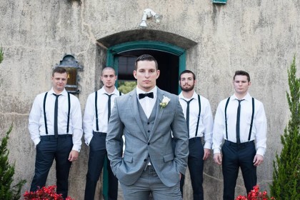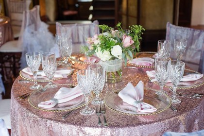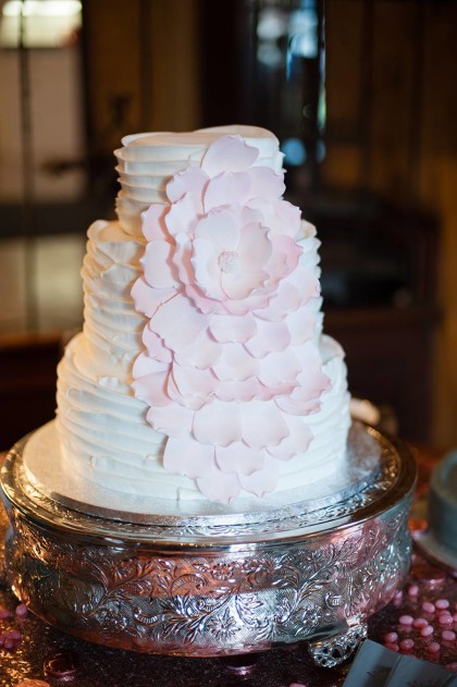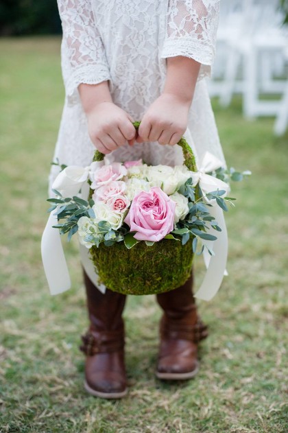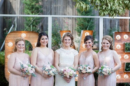 The bride wore a striking lace gown, hand tatted in England, with oyster colored lining. She accessorized with a pale rose Swarovski crystal belt and hairpiece. Her ‘something old’ was her great-great grandmother’s wedding ring tied onto her bouquet, while her mother’s turquoise and quartz ring served as her ‘something borrowed’ and ‘something blue.’ The bridesmaids wore pale rose dresses covered in sequins cut to embody 1920s couture. Each carried a bouquet of white and pink roses with green succulents. Adorable flower girls were dressed in white lace and boots.