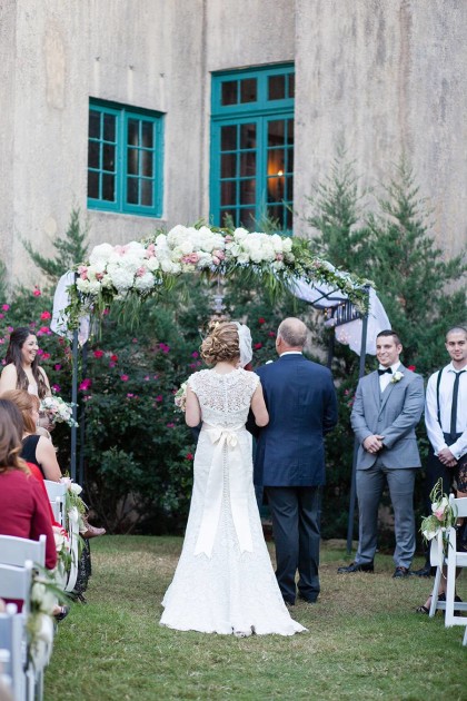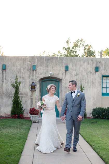 Caitlyn Marie Meshew and Christopher James Pendergrass were married on September 27, 2014 at the Dresser Mansion in Tulsa. The stunning location was the perfect backdrop for the vintage-style wedding the bride and groom imagined for their big day. Caitlyn and James said, “I do” under a stunning arch of white and ale pink roses designed by Toni’s Flowers on the beautiful lawn of the Dresser.